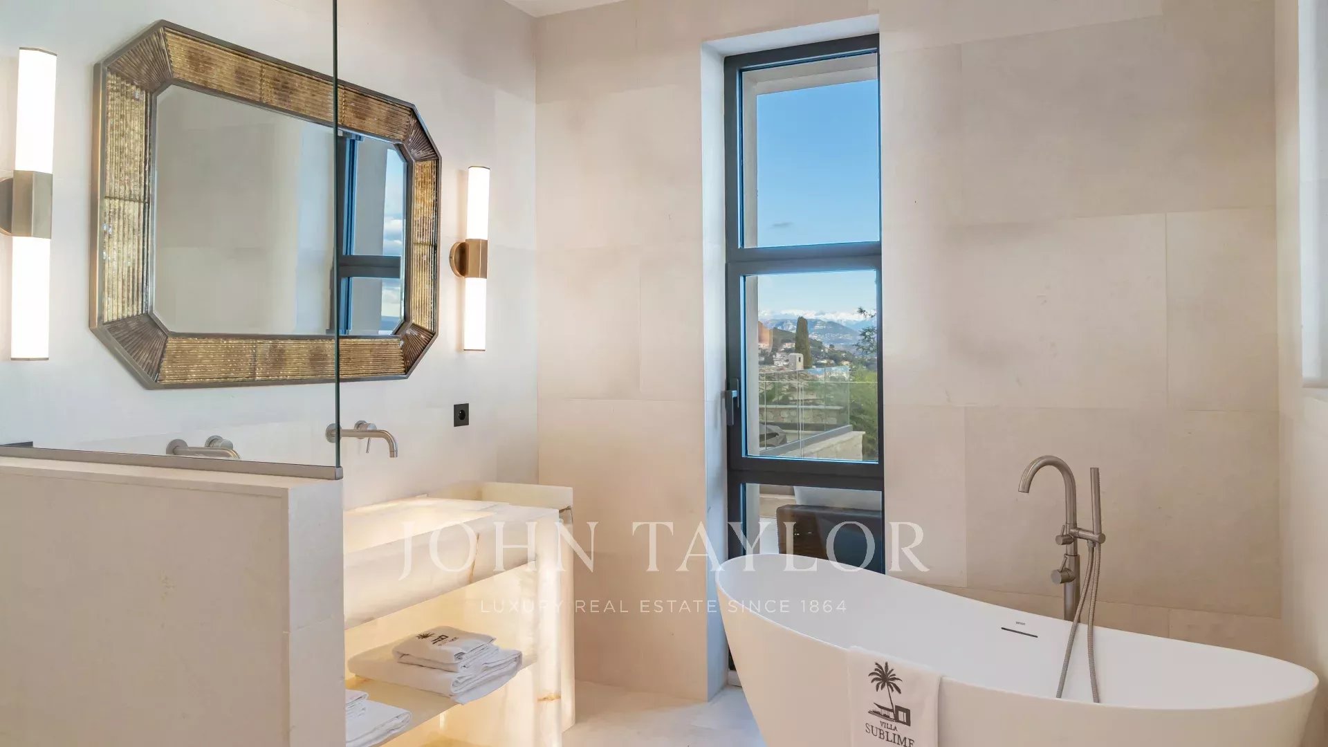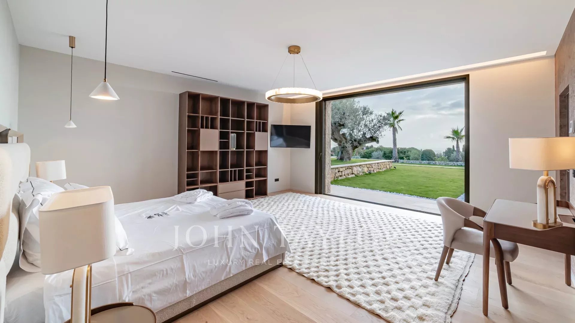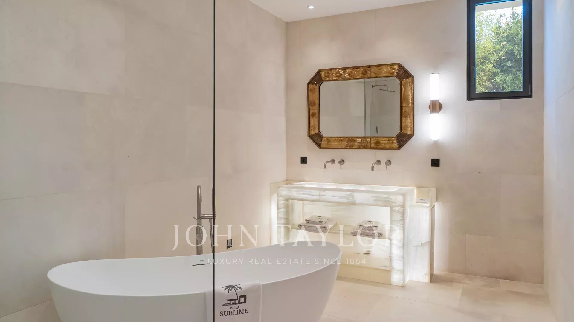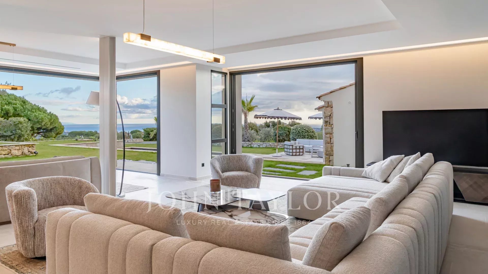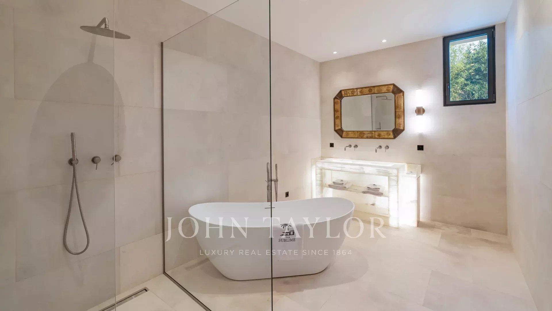 Esta moradia contemporânea com cerca de 400 m² está situada numa propriedade fechada na prestigiada e extremamente tranquila área residencial de Super Cannes. Situada numa posição dominante em 2.090 m² de terreno, a propriedade desfruta de vistas sublimes de Cap d'Antibes sobre os Alpes e as montanhas italianas.