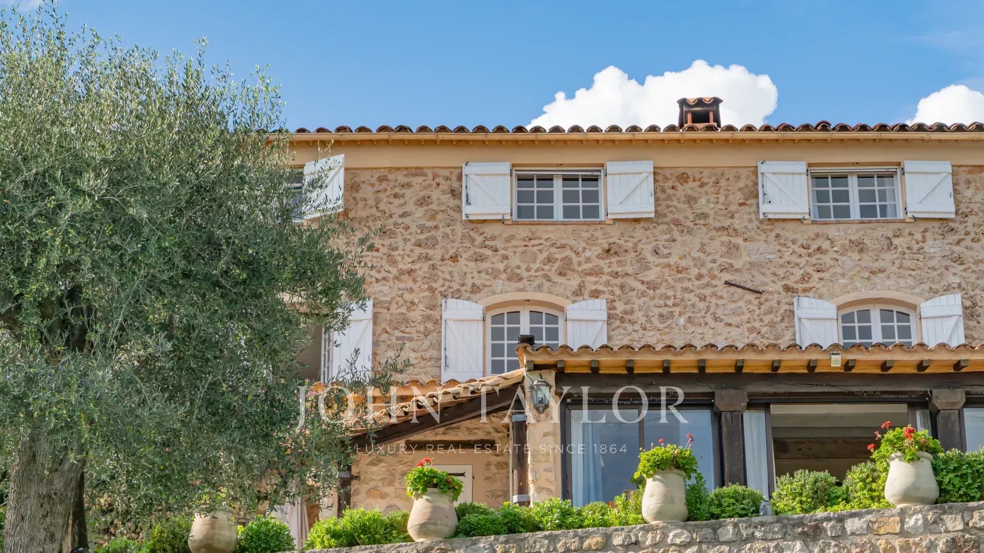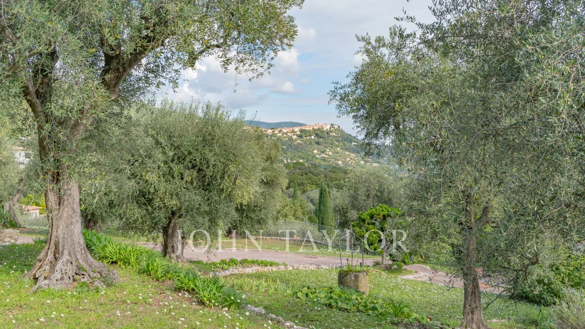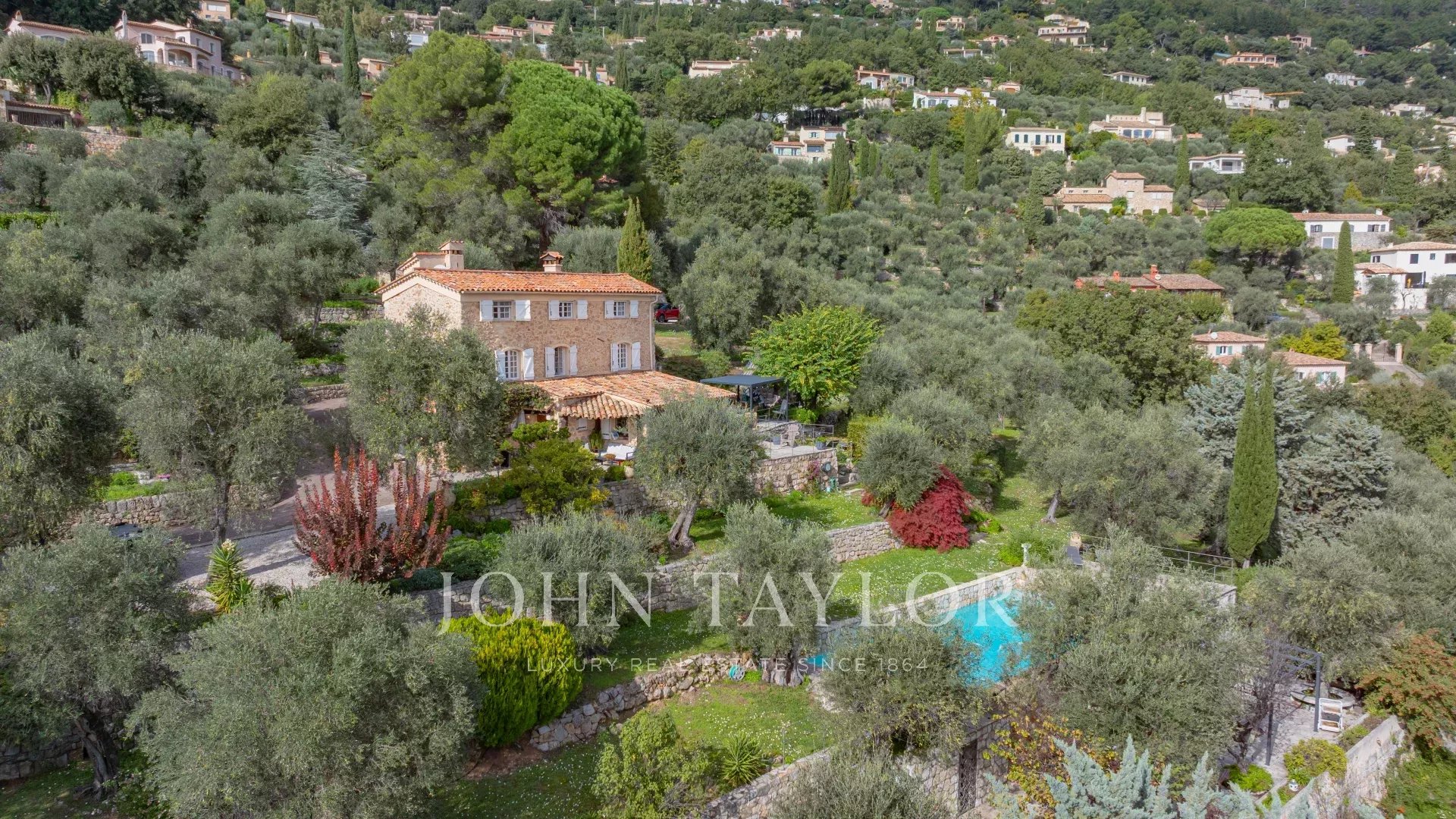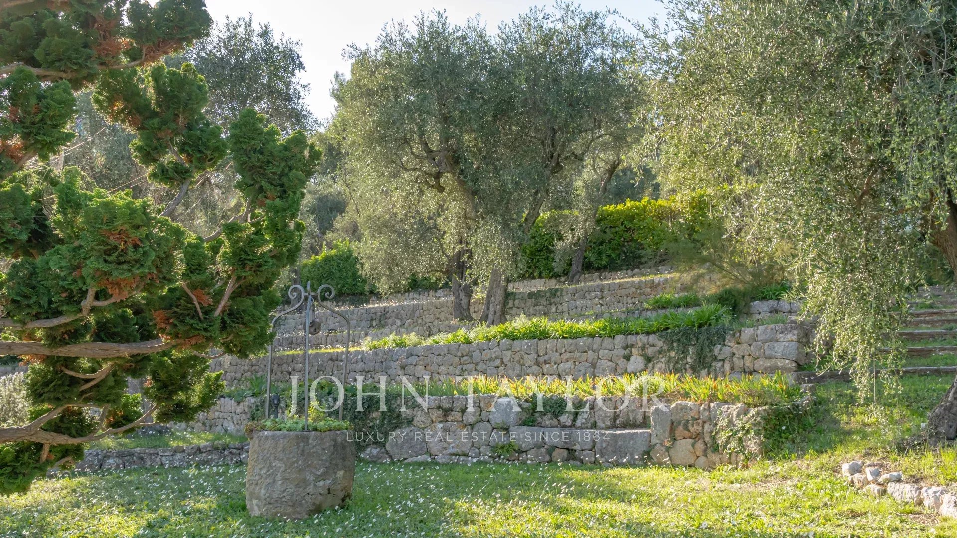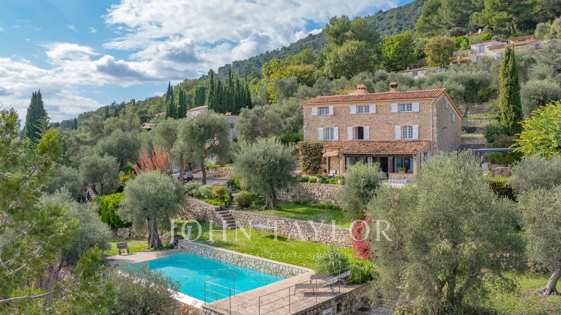 A propriedade inclui uma piscina infinita, vários terraços, uma área de estacionamento e terrenos plantados com mais de 200 oliveiras.