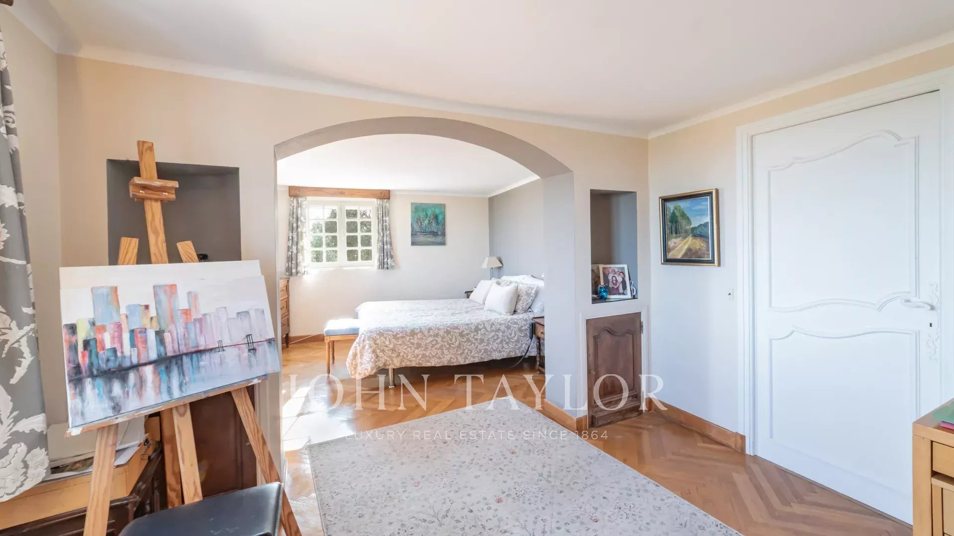 O primeiro andar tem um quarto principal com quarto de vestir, escritório e casa de banho. No mesmo nível, há uma biblioteca/área de receção que funciona como uma sala de estar.