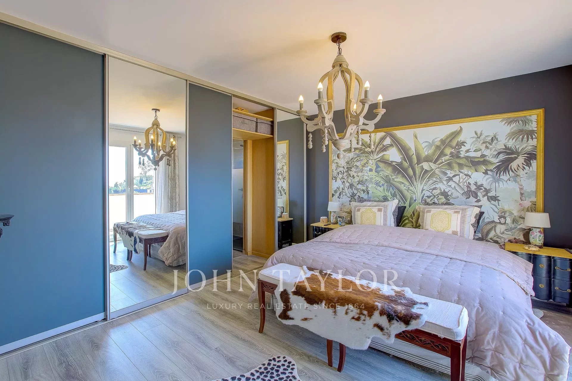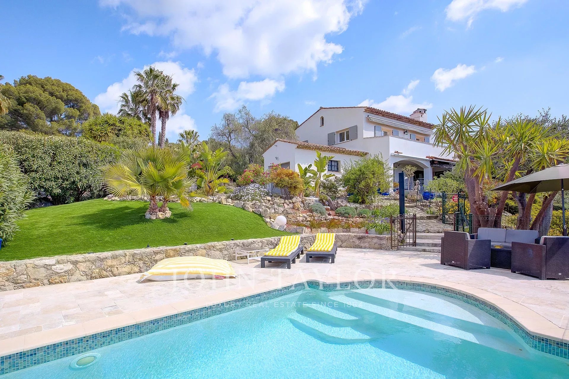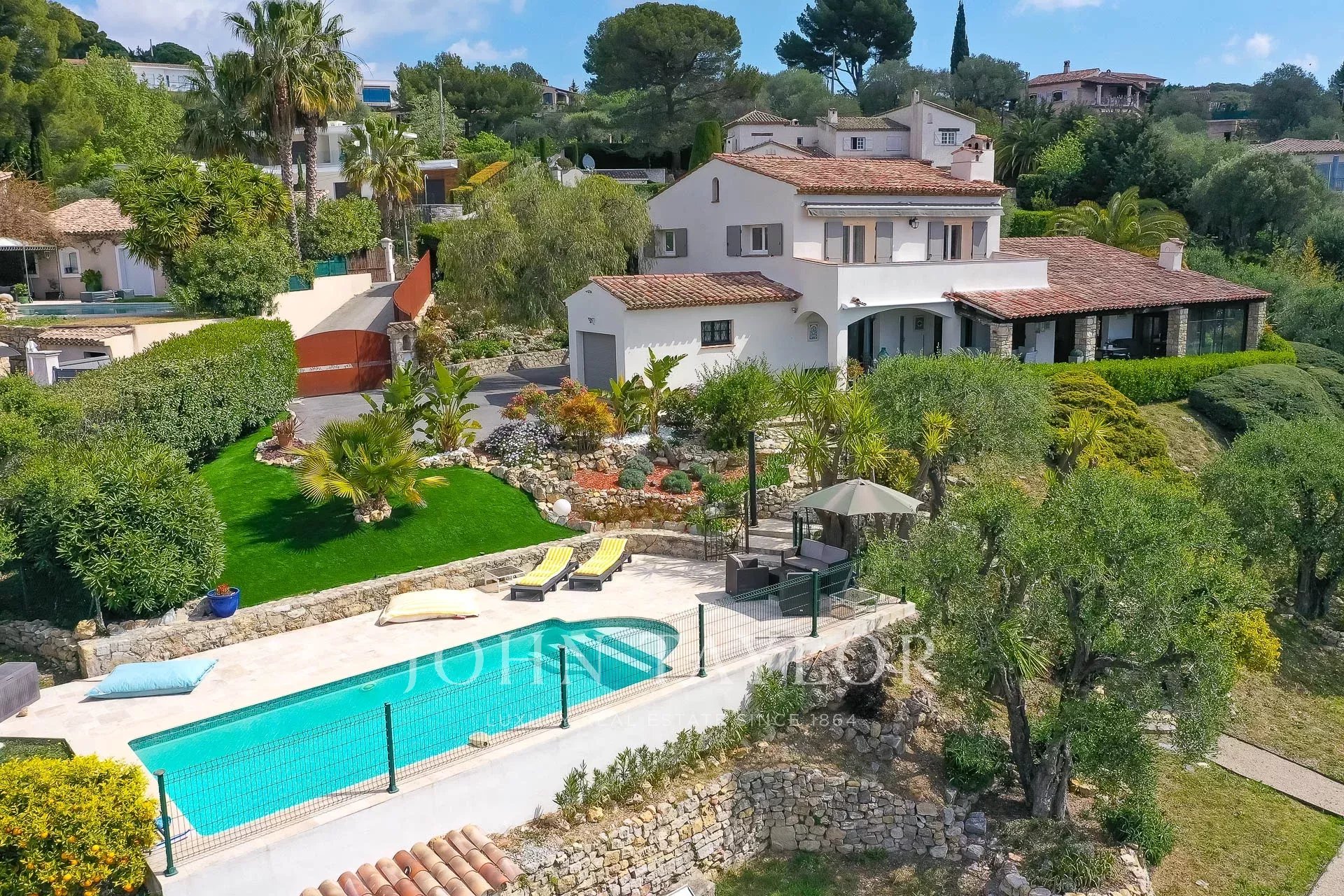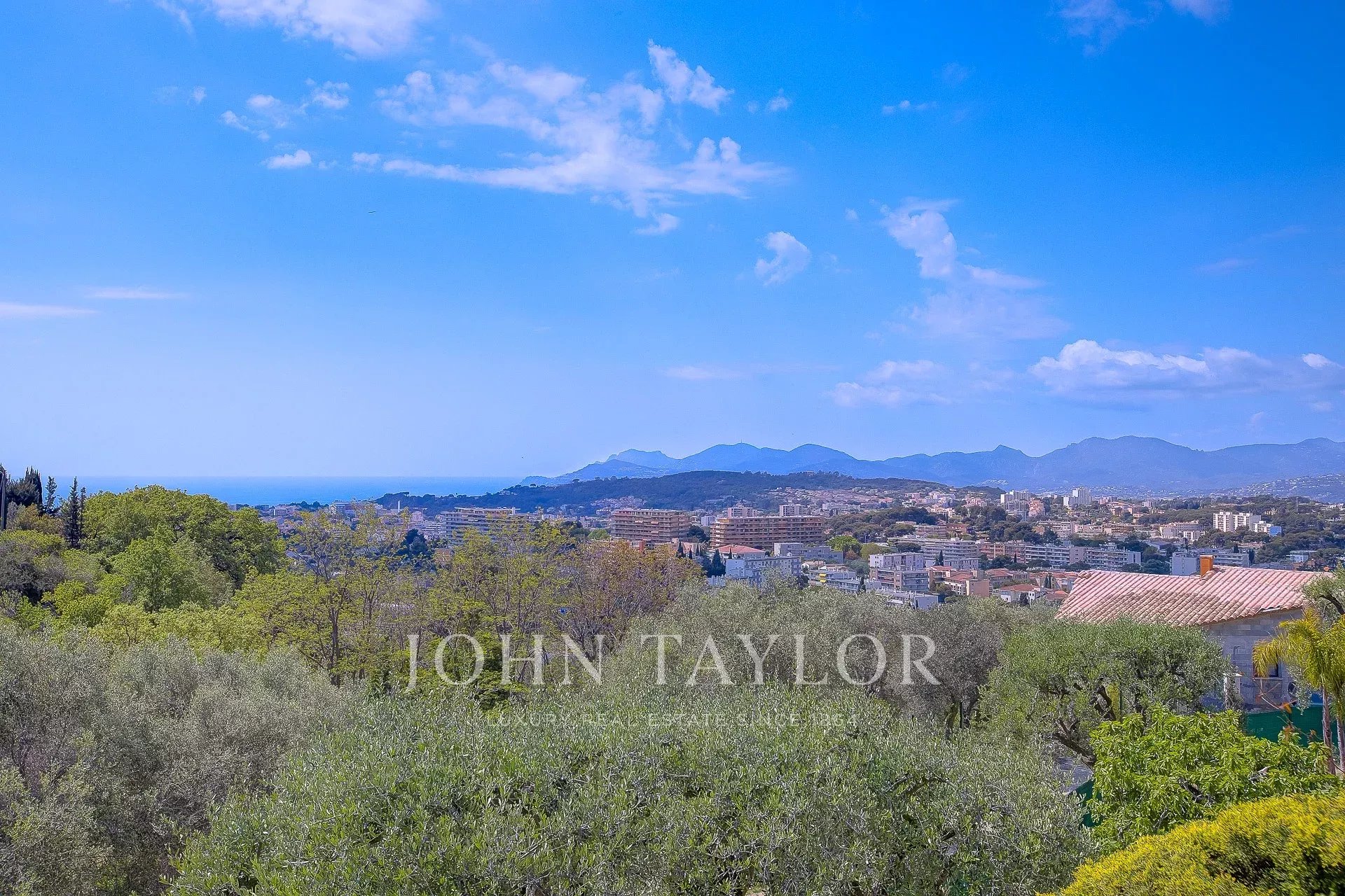 Numa área residencial de Mougins, perto de Le Cannet, esta villa totalmente renovada de 200 m² com vista para o mar está situada em 2237 m² de terreno ajardinado com piscina.