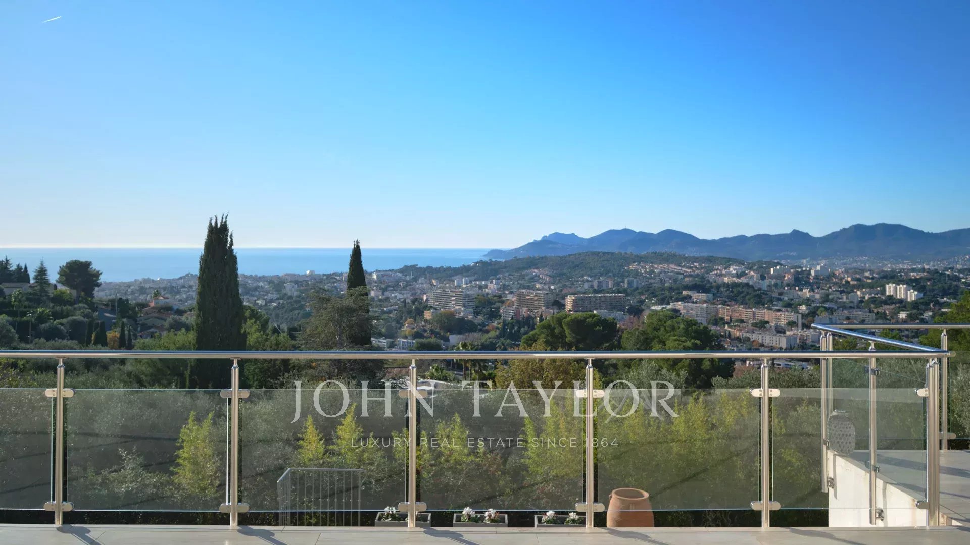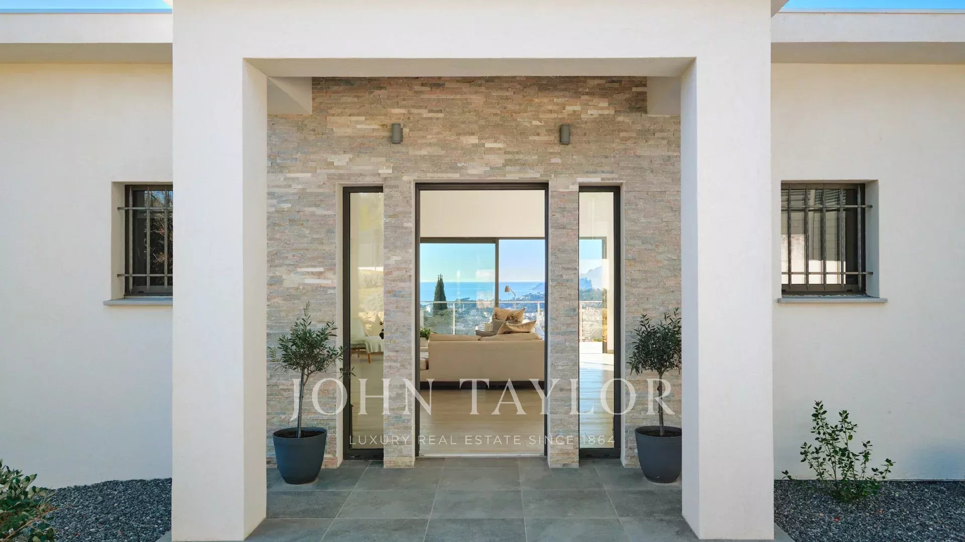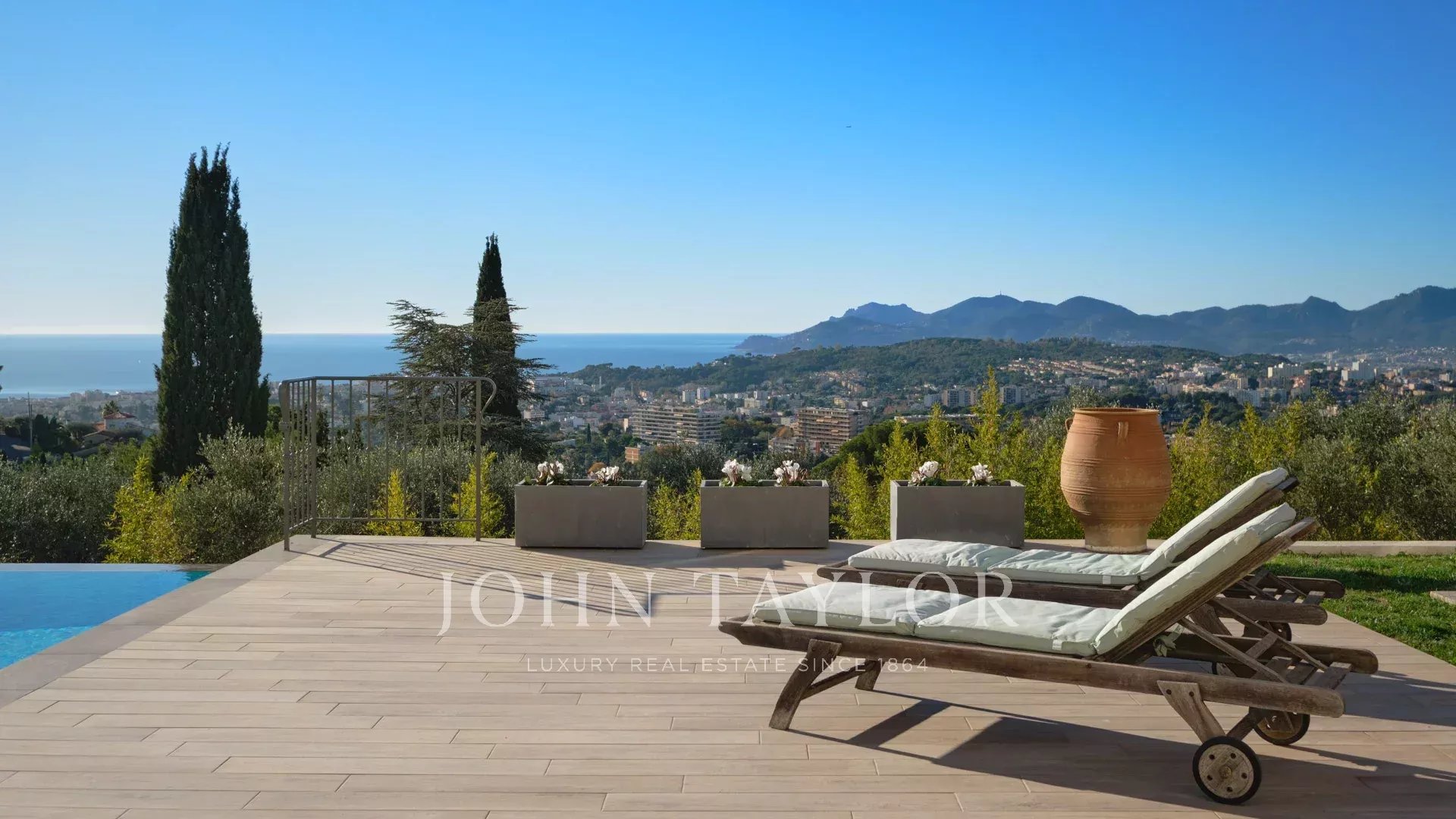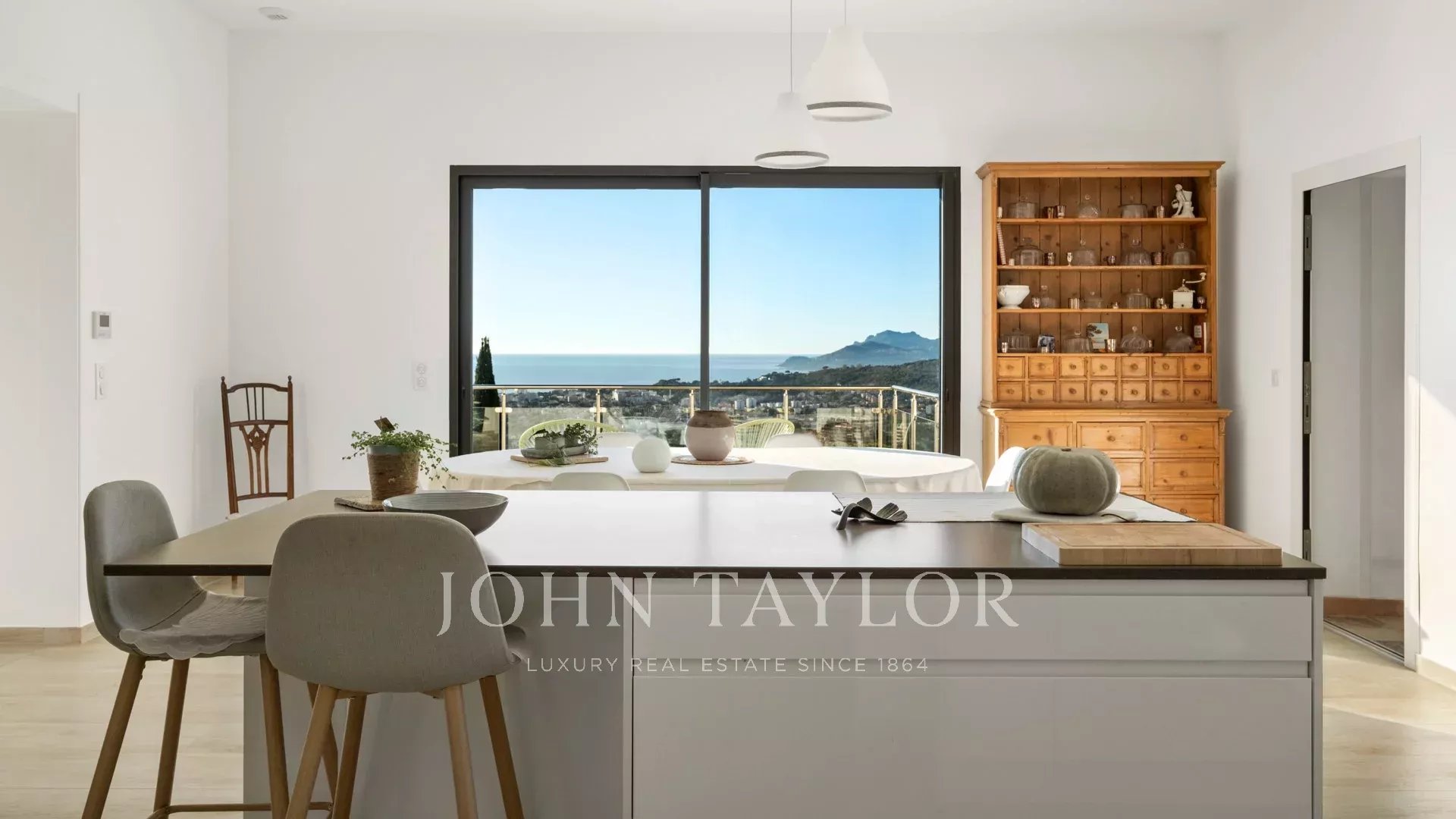 Numa zona residencial com vista panorâmica para o mar e para o esterel, moradia contemporânea inserida num terreno ajardinado de 2.600 m2 com piscina.