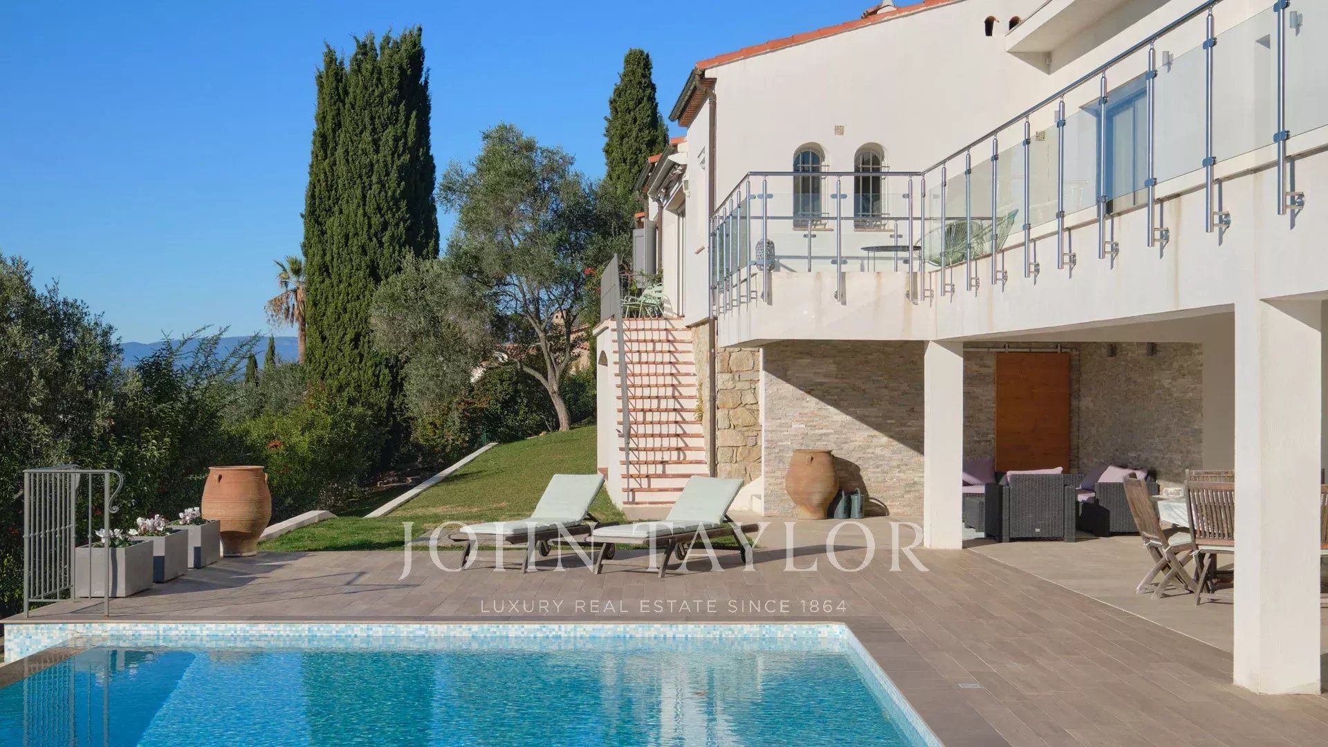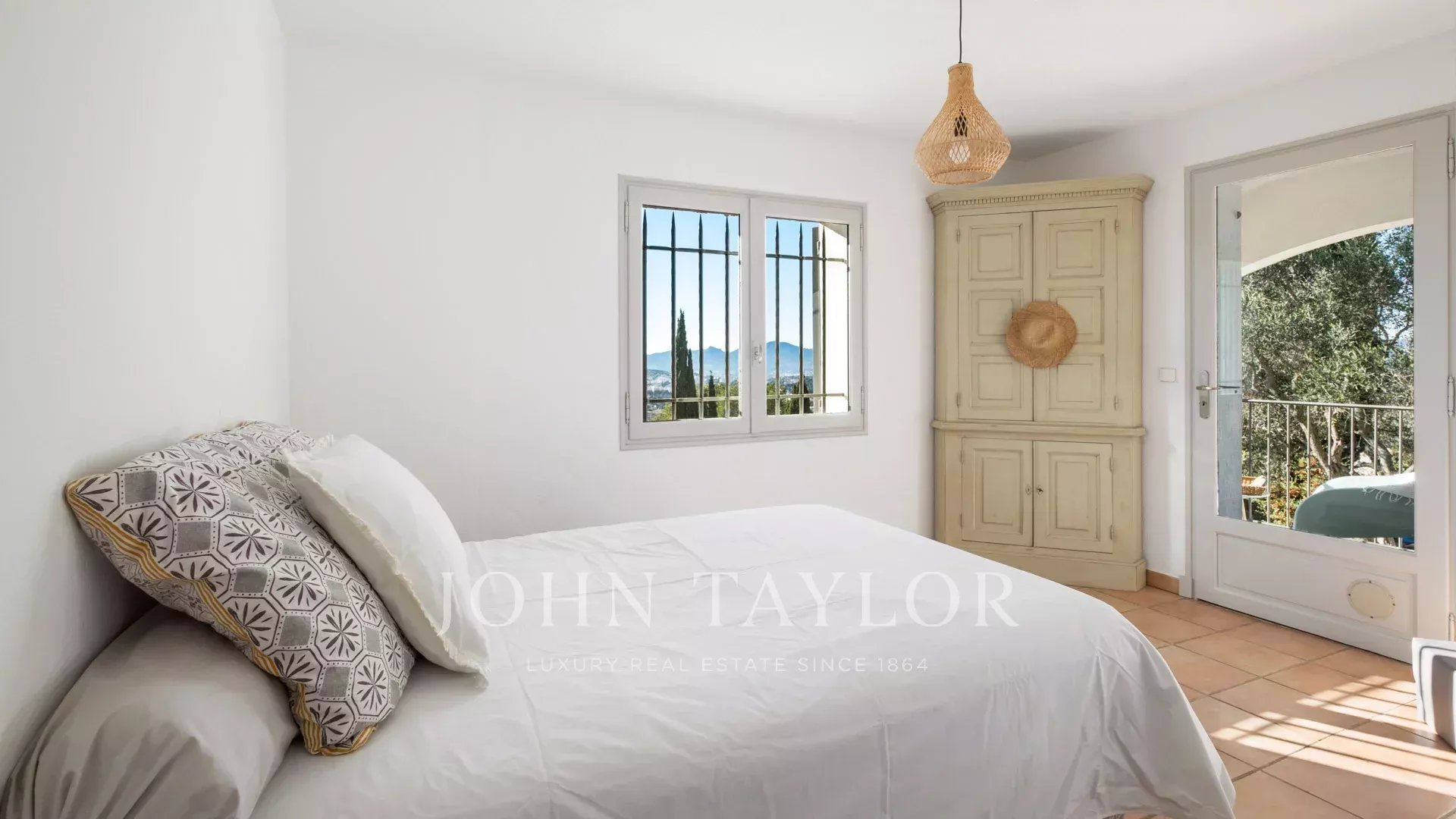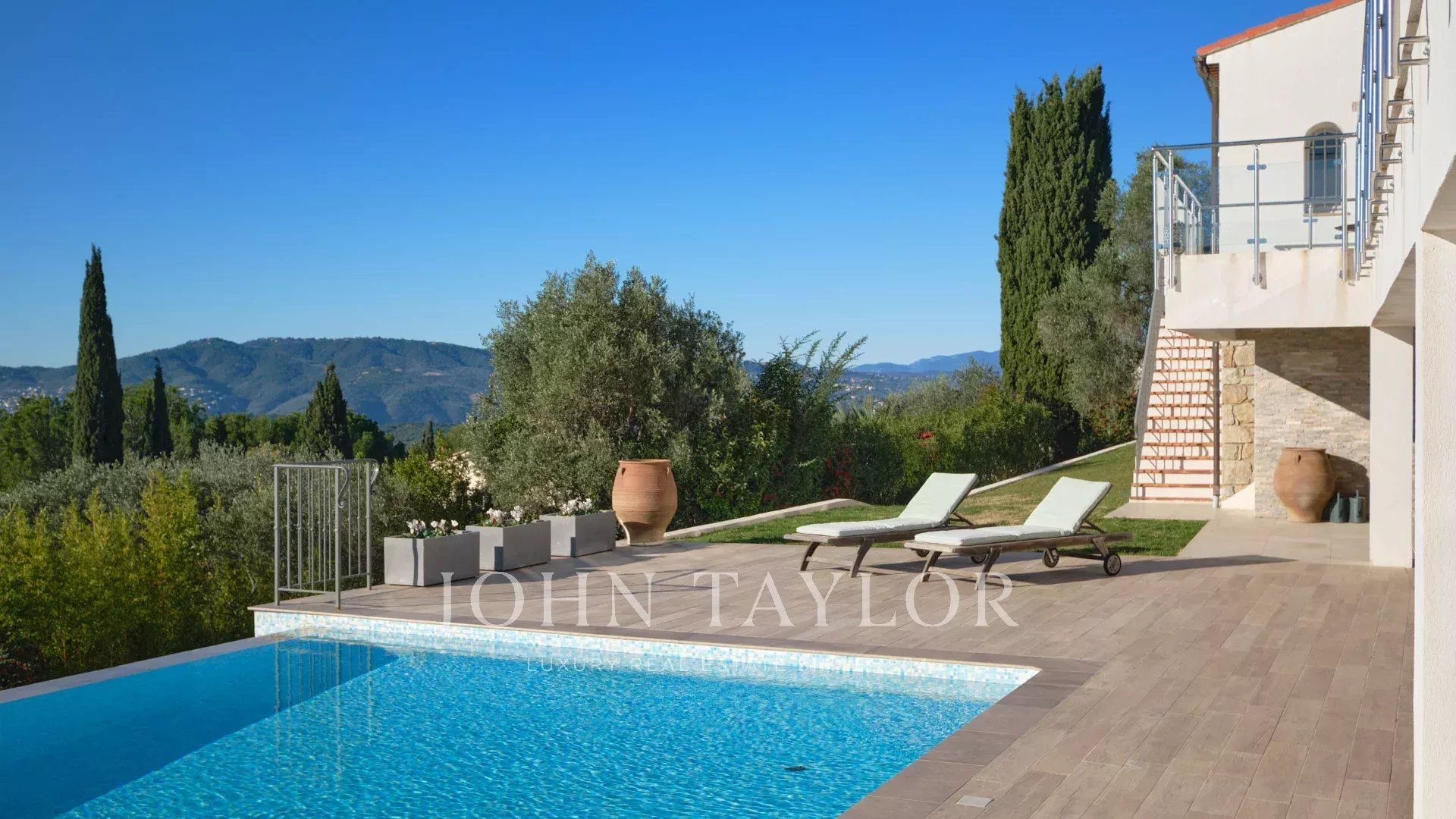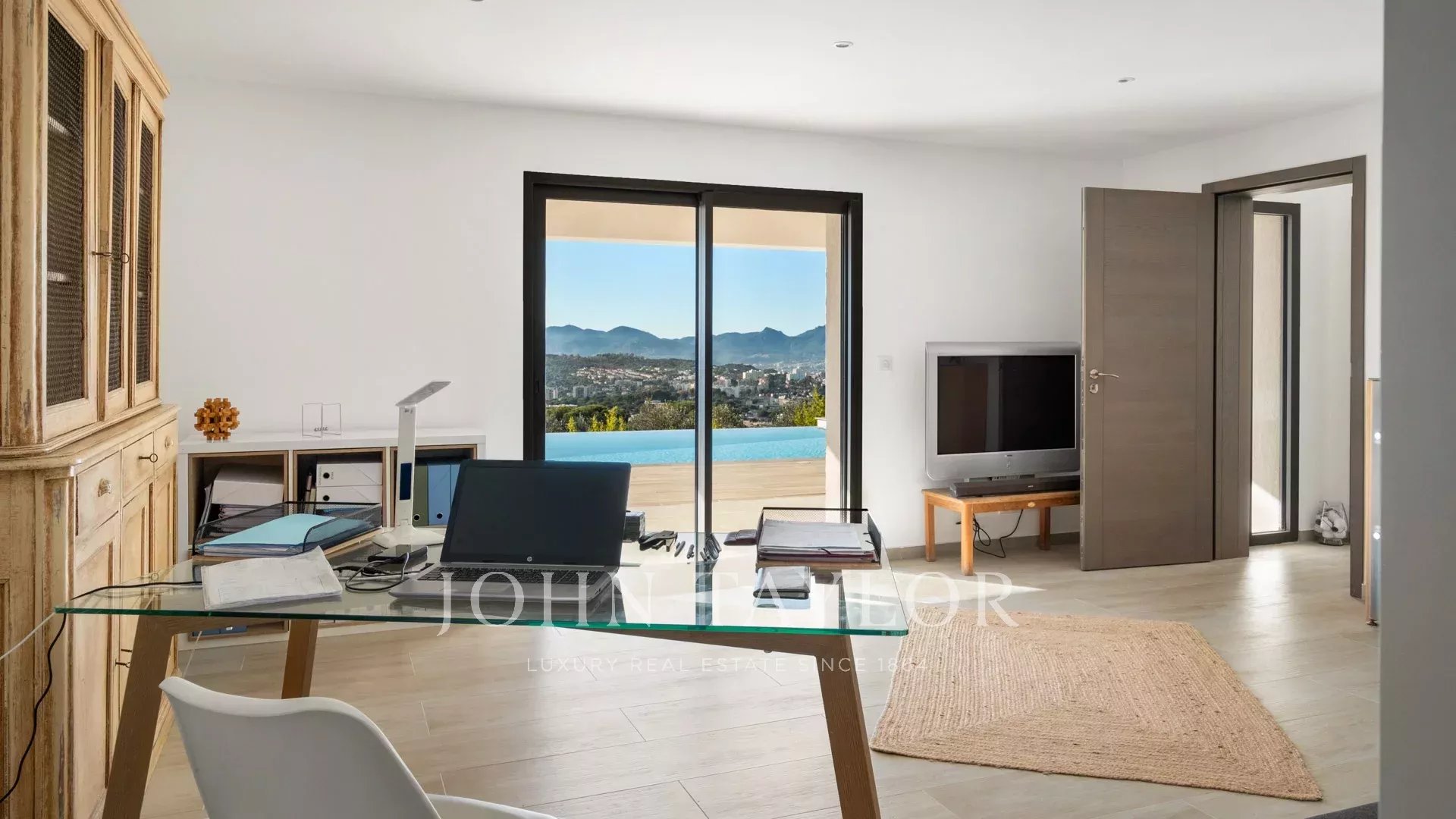 Numa zona residencial com vista panorâmica para o mar e para o esterel, moradia contemporânea inserida num terreno ajardinado de 2.600 m2 com piscina.