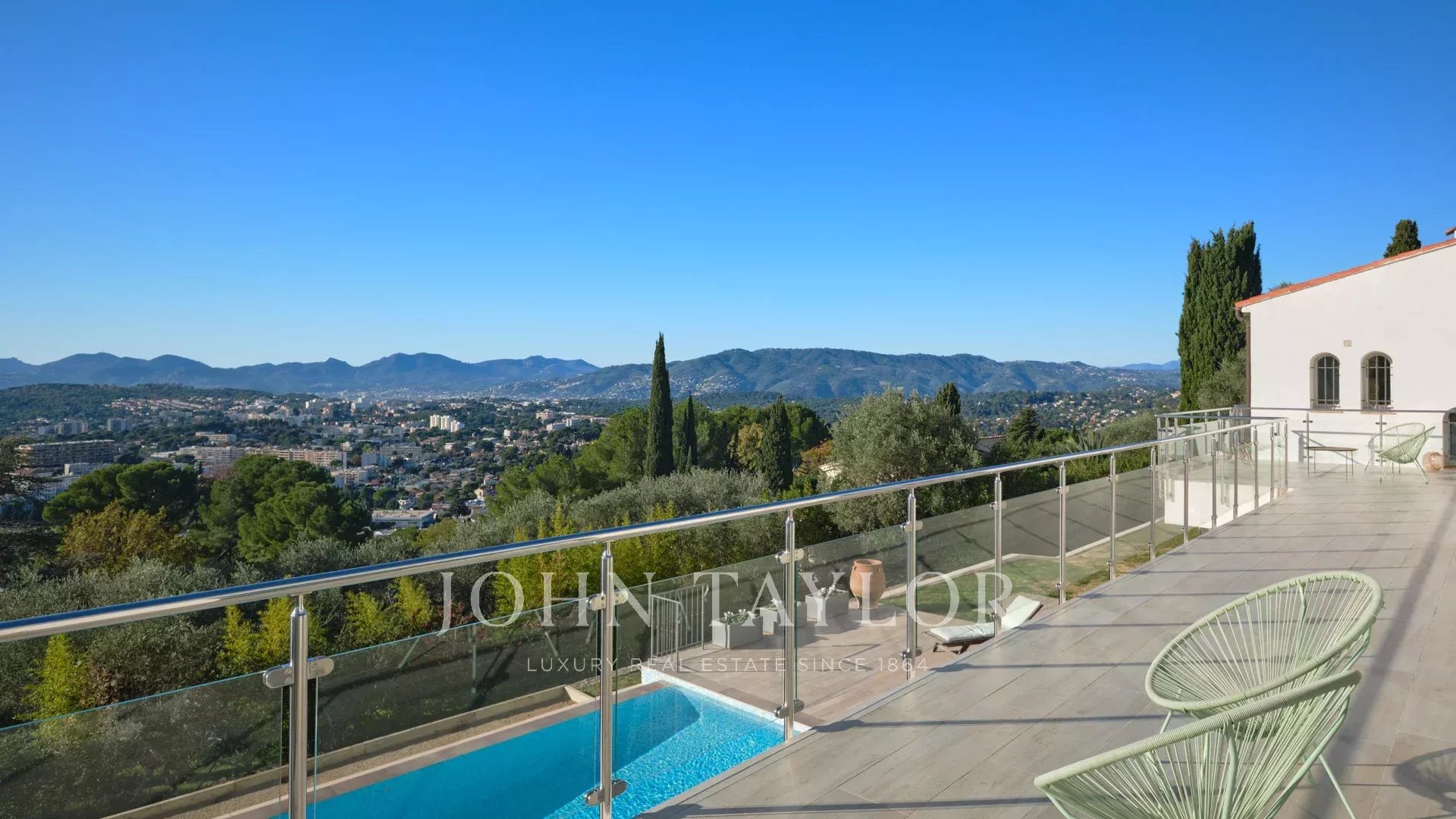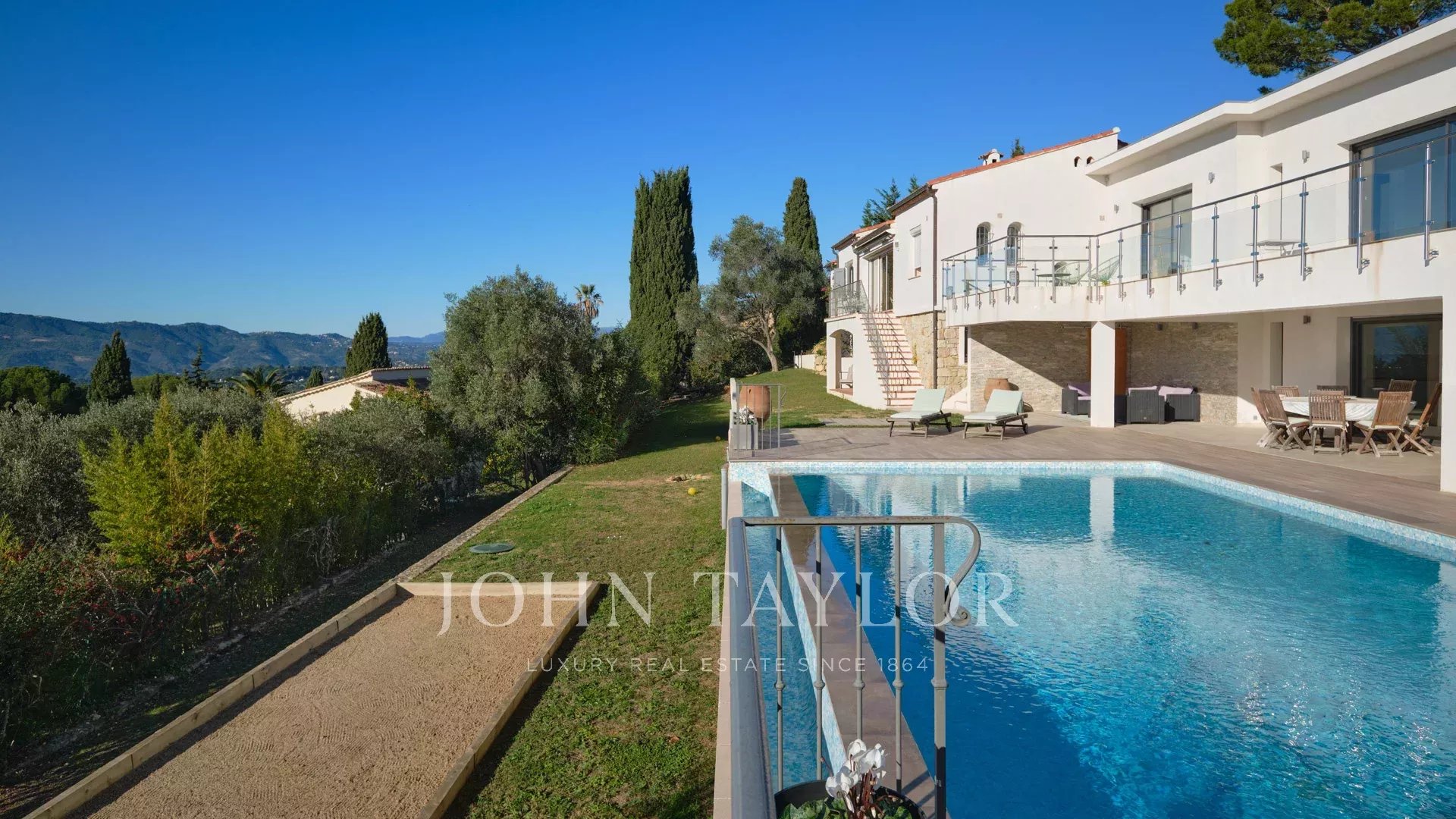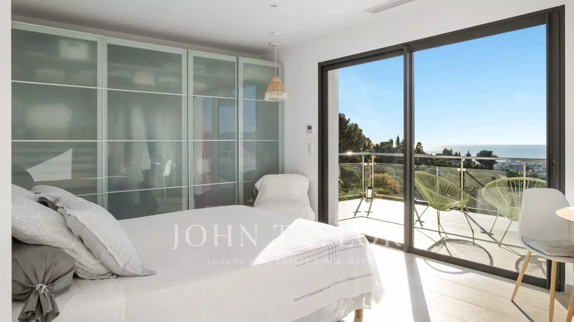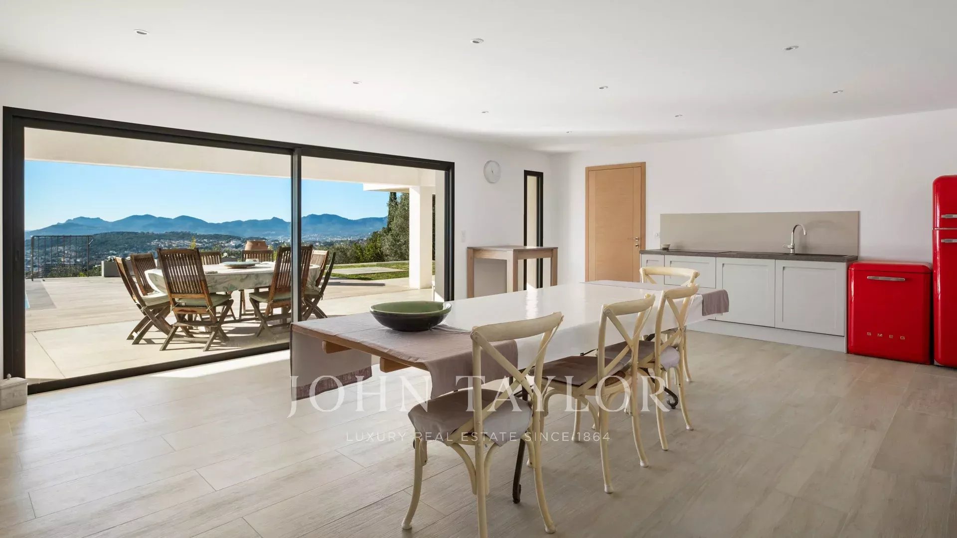 Numa zona residencial com vista panorâmica para o mar e para o esterel, moradia contemporânea inserida num terreno ajardinado de 2.600 m2 com piscina.