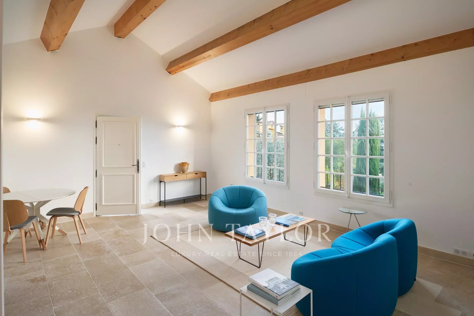 Os jardins luxuriantes que rodeiam a propriedade conferem-lhe uma dimensão mágica. Oliveiras centenárias, canteiros de flores, um jardim de rosas, um pomar e uma piscina aquecida criam um cenário idílico para momentos de descontração e entretenimento sob o sol da Côte d'Azur. As vistas panorâmicas sobre as colinas verdejantes de Mougins, o mar e as montanhas Esterel completam esta experiência excecional.