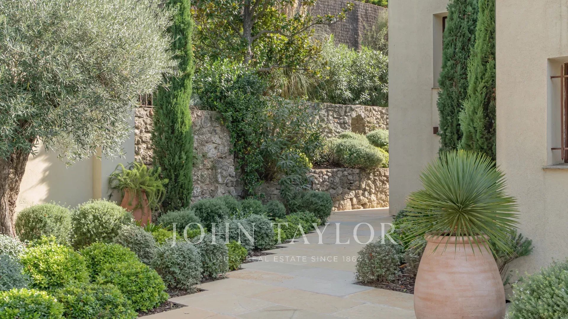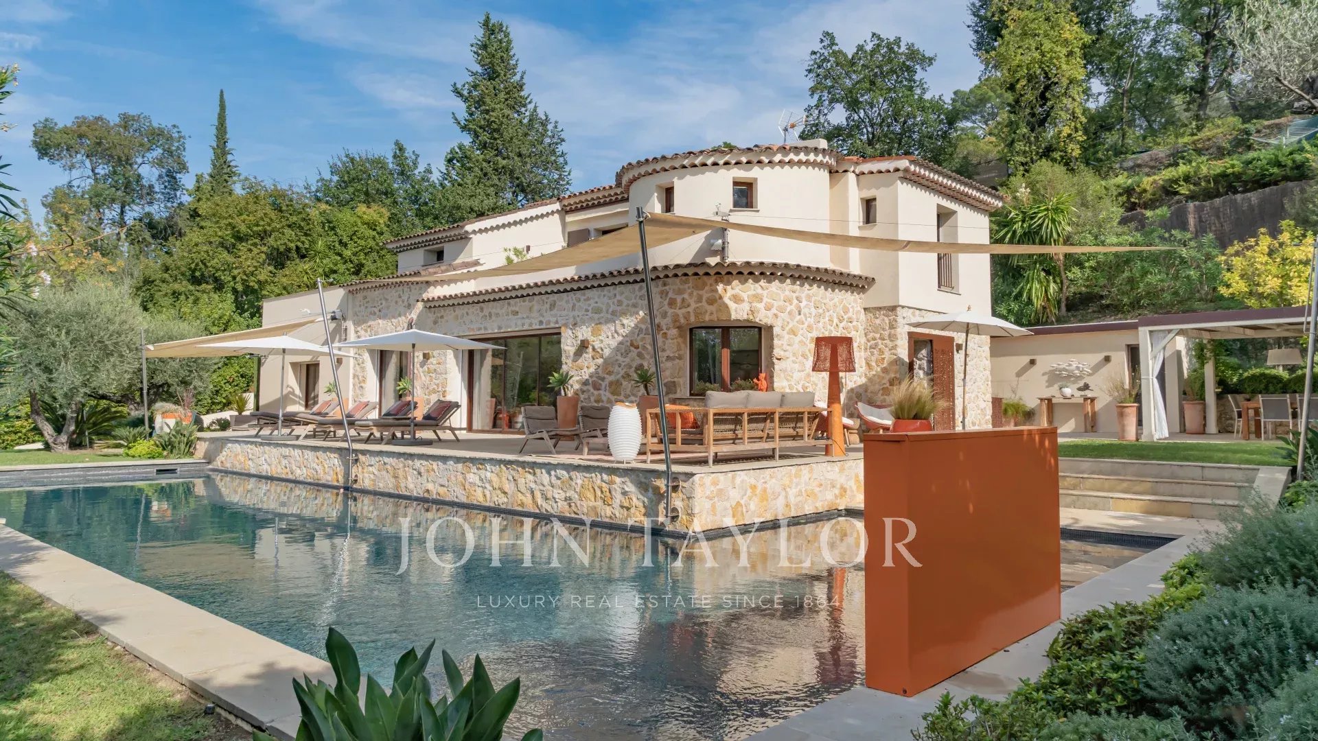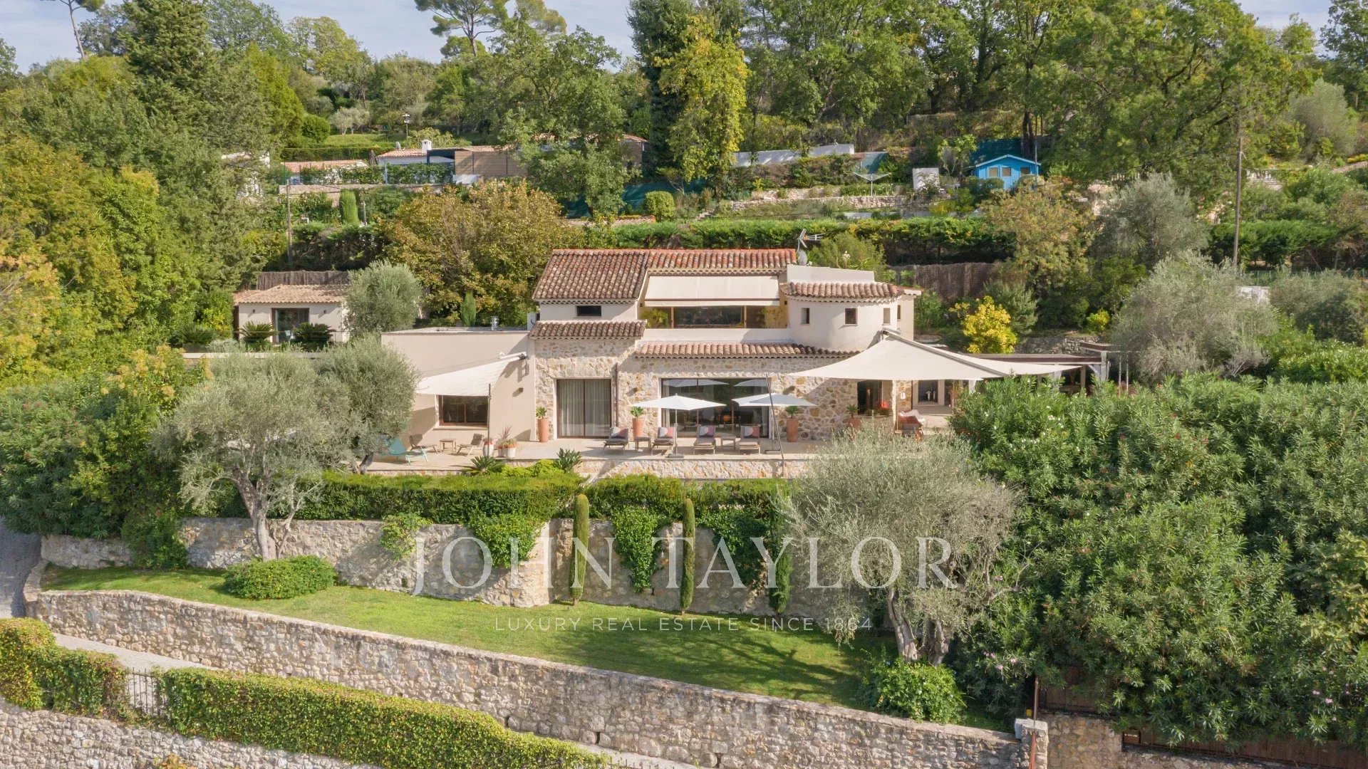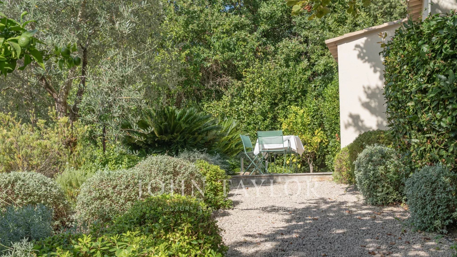 Situada apenas a 1 km da aldeia de Mougins, famosa pelas suas galerias de arte e restaurantes gourmet, esta villa, ao lado da propriedade de Pablo Picasso, goza de um ambiente residencial na muito procurada zona de Chapelle Notre-Dame-de-vie.