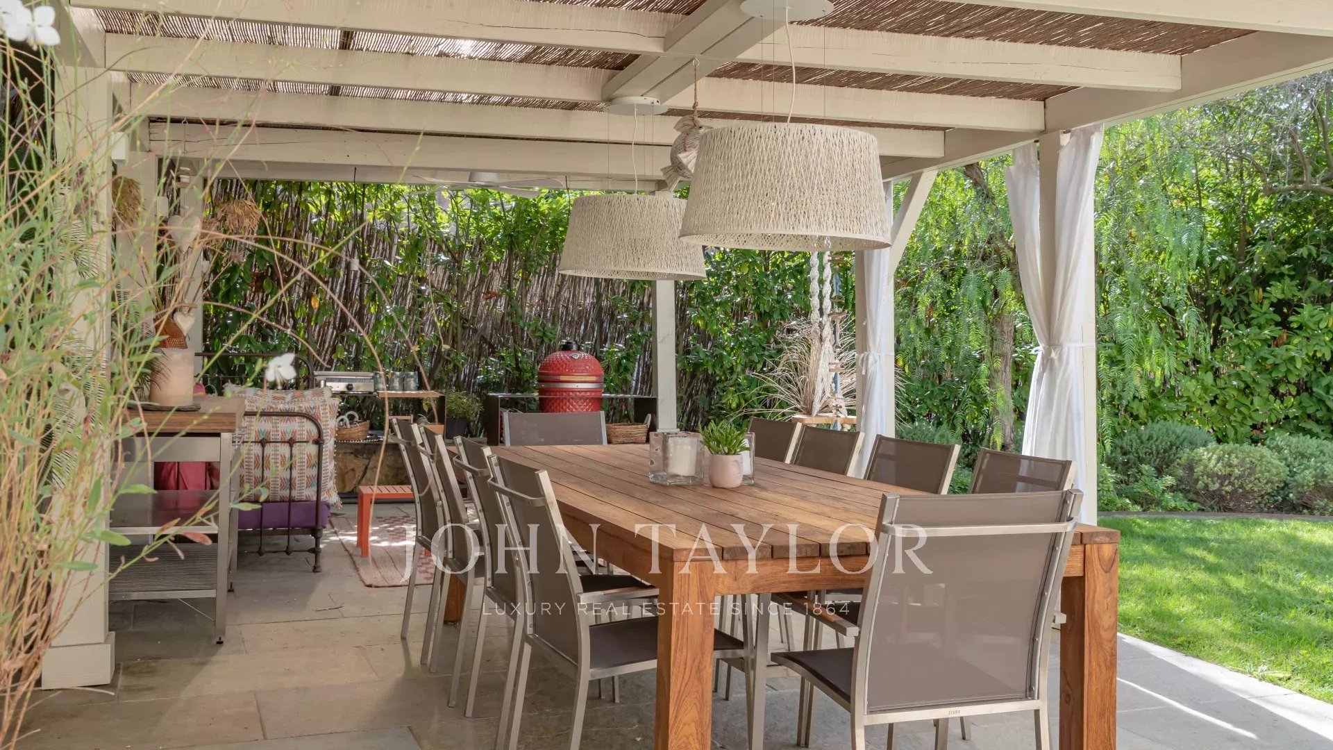Um espaço sublime da casa da piscina com mesa de jantar para mais de 10 pessoas, prolongado pela sua cozinha de verão.