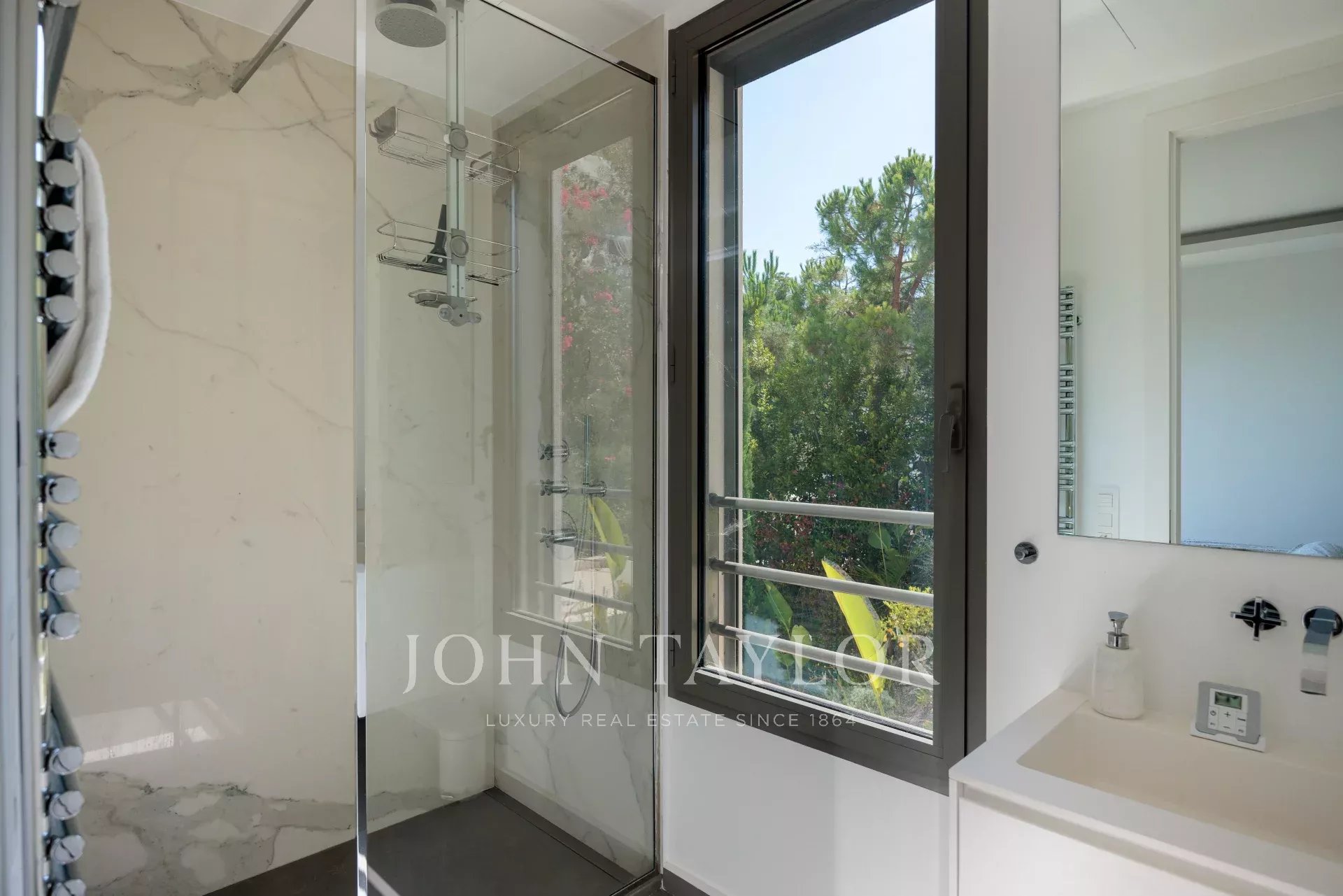 O jardim parcialmente plano (2249 m²) possui uma bela piscina infinita e jacuzzi, criando um lugar único para relaxar com vistas panorâmicas cativantes sobre o mar e a cidade de Nice, dia e noite.