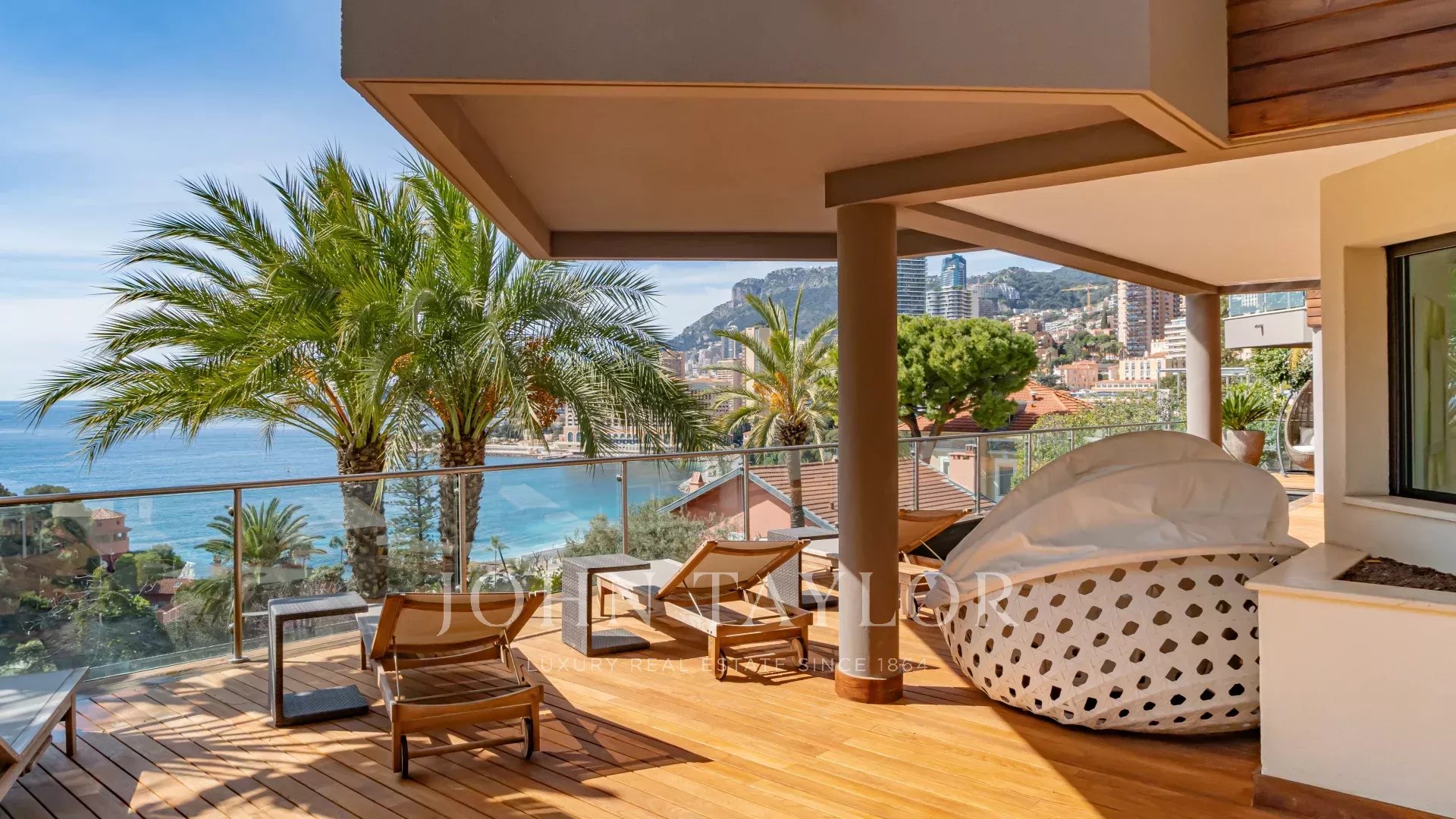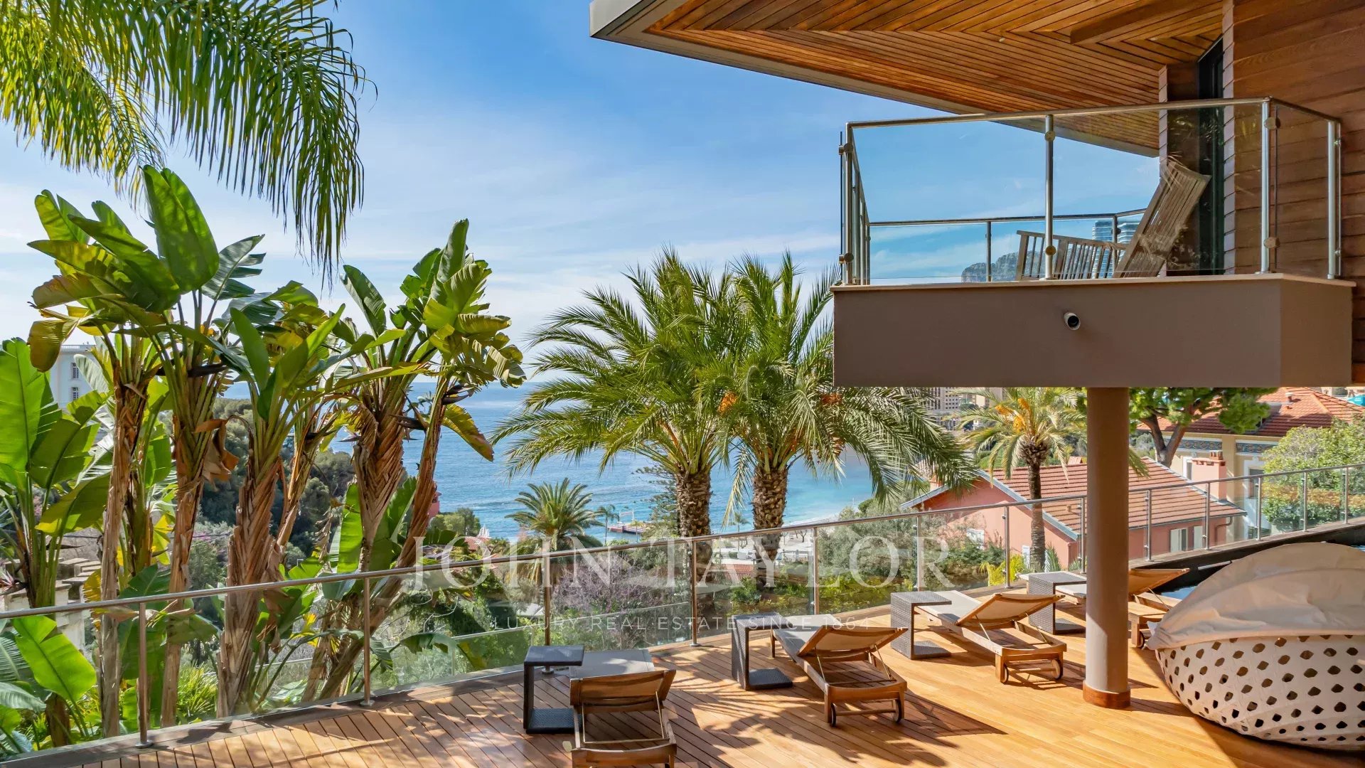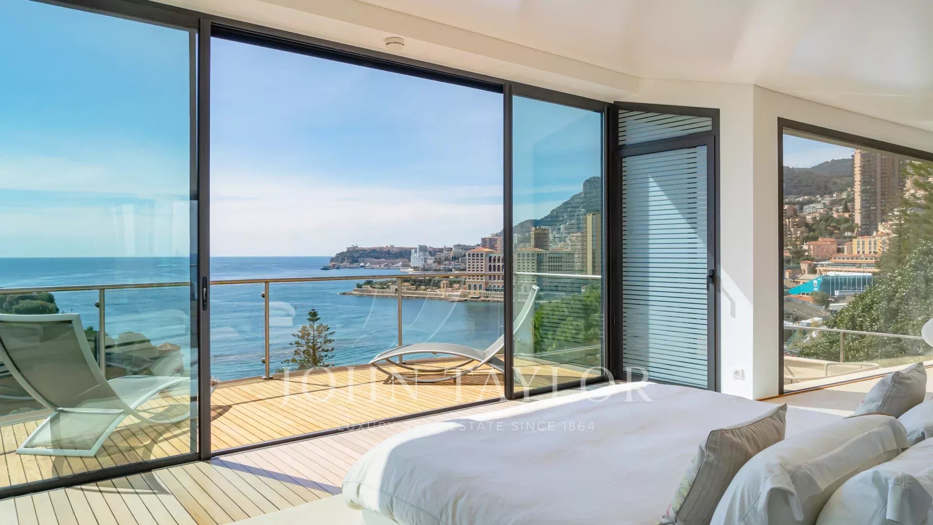Os 580 m² de área habitacional em 5 níveis incluem 5 quartos, incluindo um quarto principal com vista panorâmica para o mar e para o Mónaco.