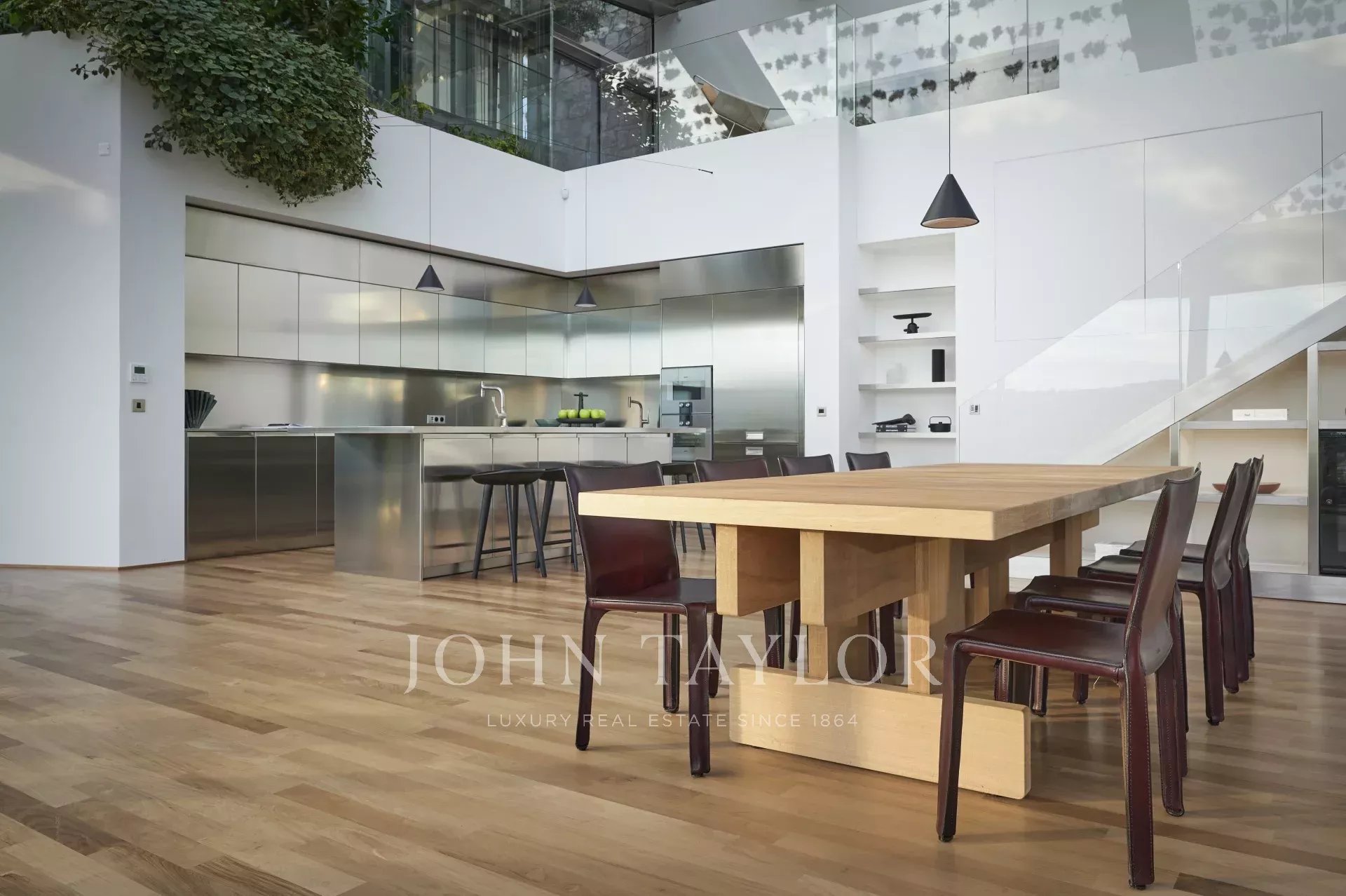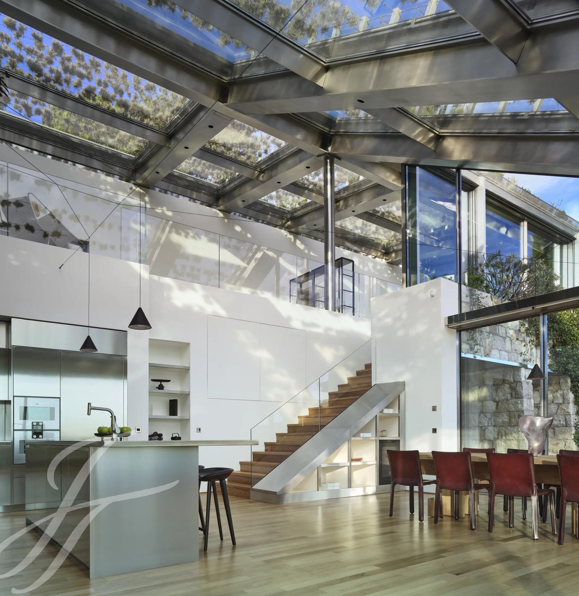 A sala de estar, a sala de jantar e a cozinha, radicalmente contemporâneas, têm um pé-direito duplo. Tectos de vidro! Com tratamento especial, é claro, e podem ser ocultados por estores especiais.
