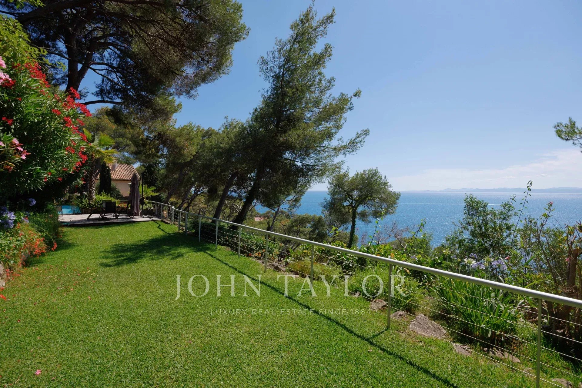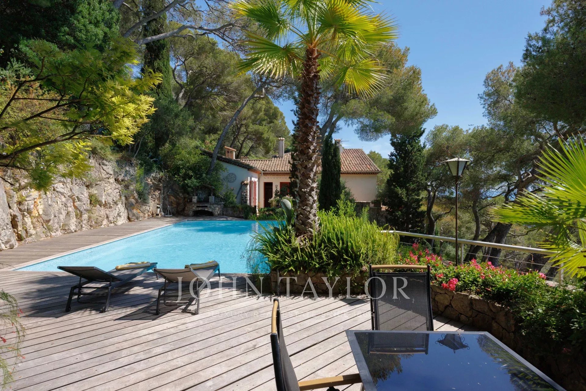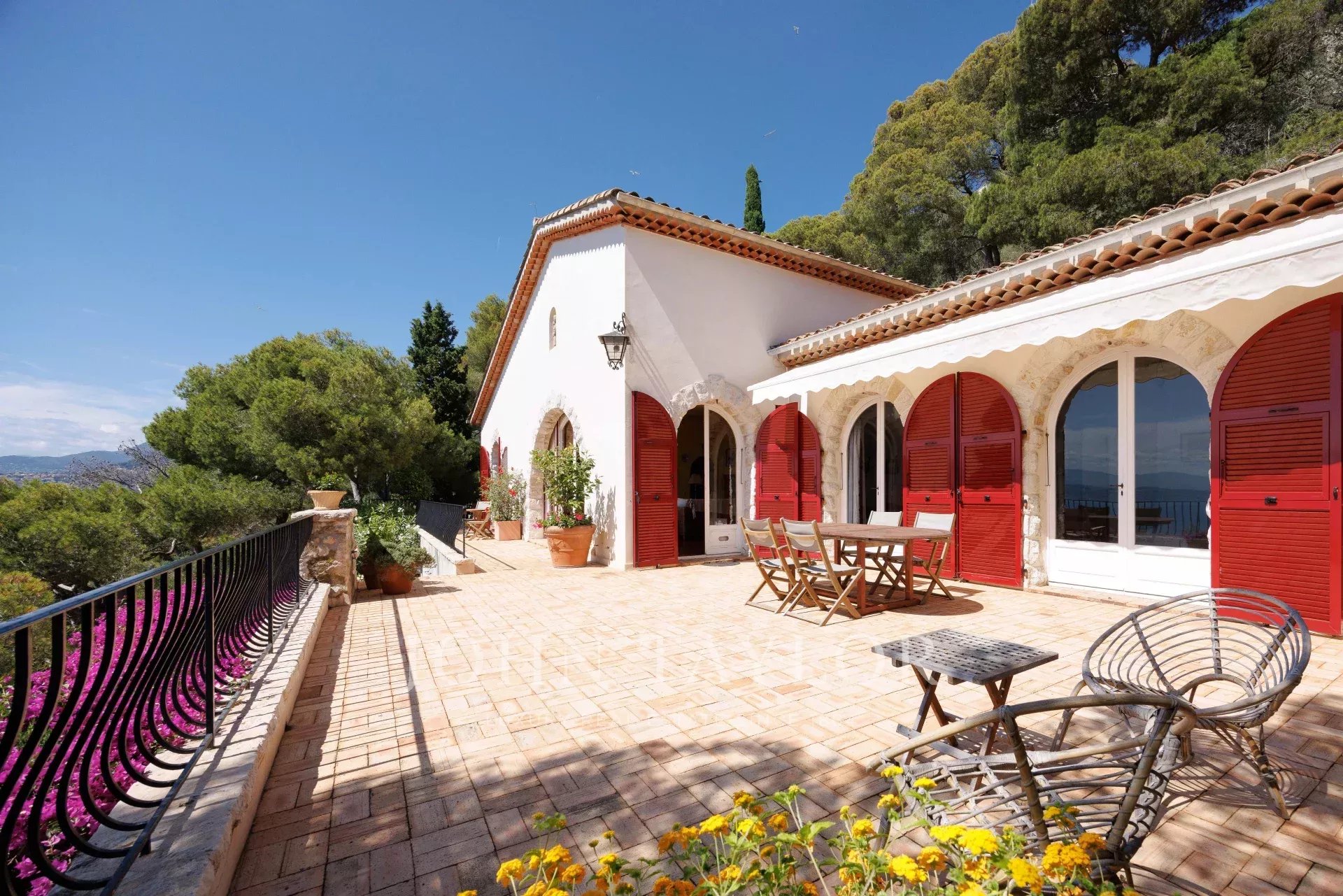 Esta encantadora moradia de 2 andares foi construída em estilo provençal. Está situada no cimo deste magnífico jardim. Ela compreende 5 quartos e 3 casas de banho, uma sala de estar/jantar que se abre para um grande terraço com uma sala de jantar de verão com uma vista espetacular sobre o mar, uma cozinha espaçosa e um pátio com sombra...