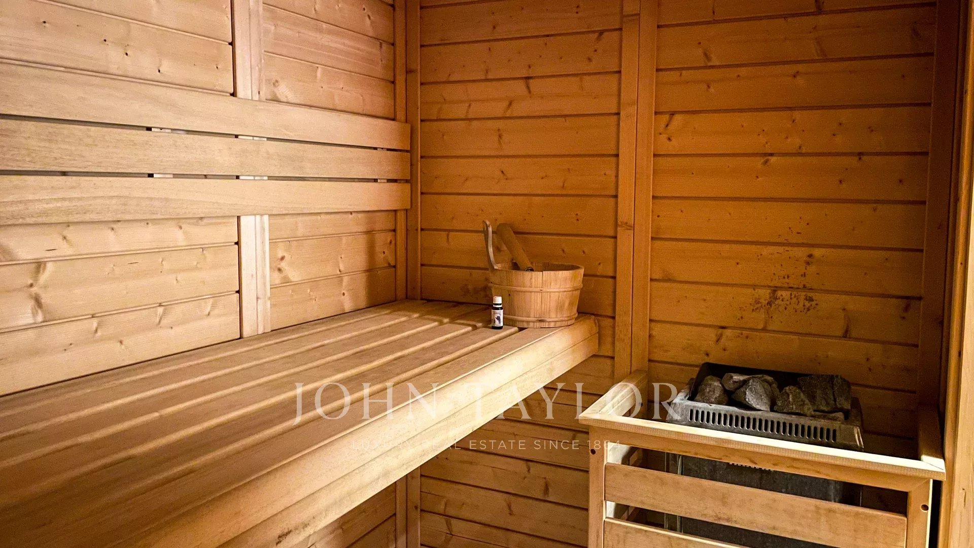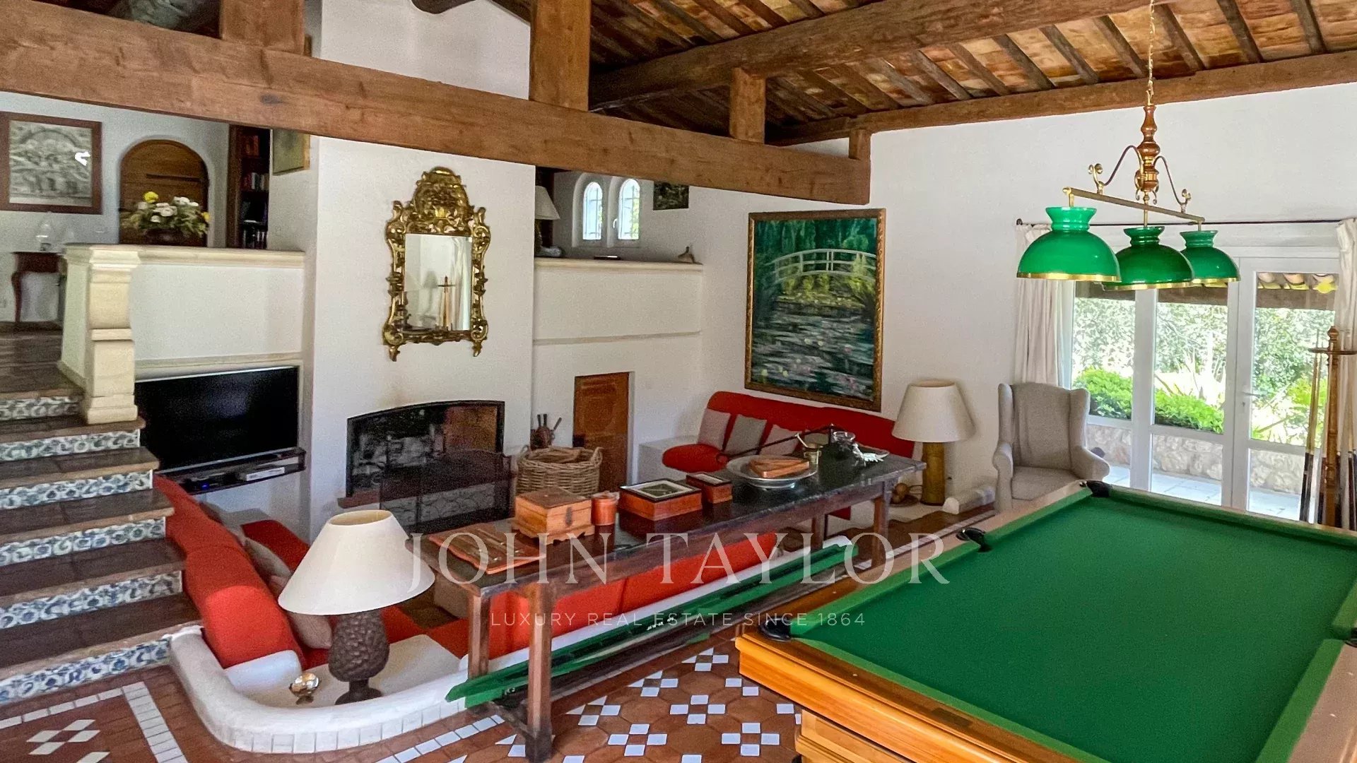 A moradia possui um elegante hall de entrada, uma espaçosa cozinha de jantar com lareira que se abre para um terraço coberto e para a área da piscina, uma sala de estar dupla com bar e mesa de bilhar, uma área de escritório e uma segunda sala de estar luminosa com lareira. À noite, uma suite principal e quatro quartos, cada um com casa de banho privativa, completam o espaço habitacional. Uma câmara frigorífica, uma lavandaria, várias caves e um telheiro para 4 a 6 veículos com uma oficina completam a propriedade.