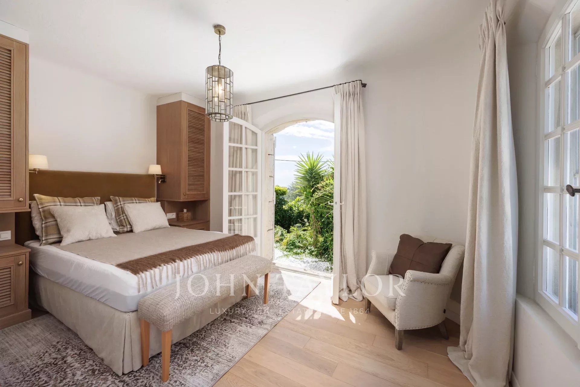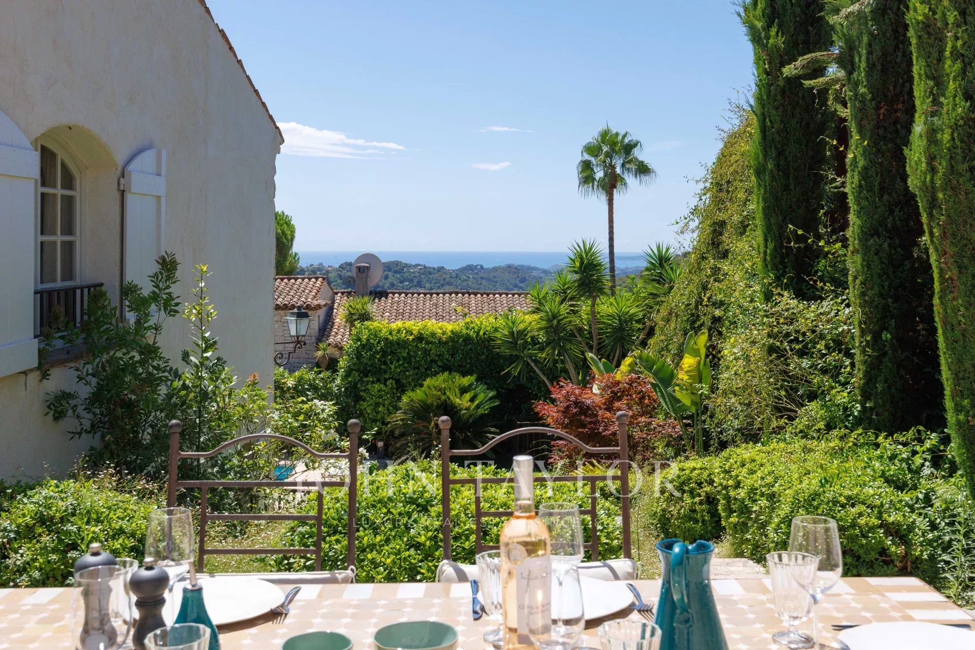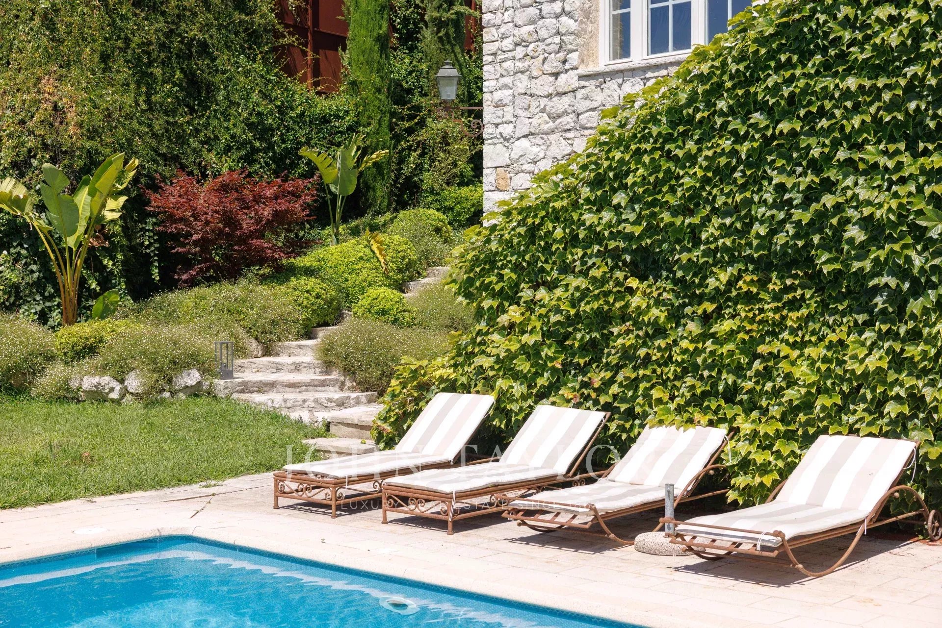 O jardim foi inteiramente concebido pelo famoso arquiteto paisagista Jean Mus e oferece várias áreas, incluindo um grande pátio com abrigo para dois veículos e uma fonte, uma área de jantar ligada à cozinha com vista para o mar de Cap d'Antibes, o belo terraço da sala de estar e a área da piscina com casa de piscina e terraço, ideal para relaxar e brincar com amigos e familiares!