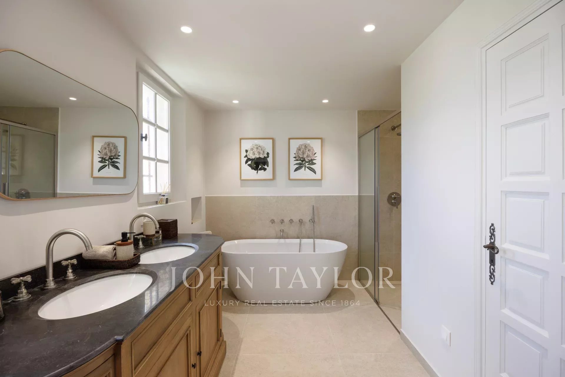 A moradia é composta por um verdadeiro hall de entrada, uma sala de estar generosa e iluminada pelo sol com lareira e área de jantar, uma bela varanda e uma grande cozinha com despensa/lavandaria. A Master Suite está apenas a alguns passos acima e tem um quarto grande, uma casa de banho/chuveiro, um quarto de vestir equipado e um escritório na torre. Os pisos inferiores incluem 3 quartos com casa de banho privativa, um segundo escritório, uma sala de ioga, uma sala de bilhar com adega e acesso à casa da piscina com cozinha, totalizando quase 30 m².