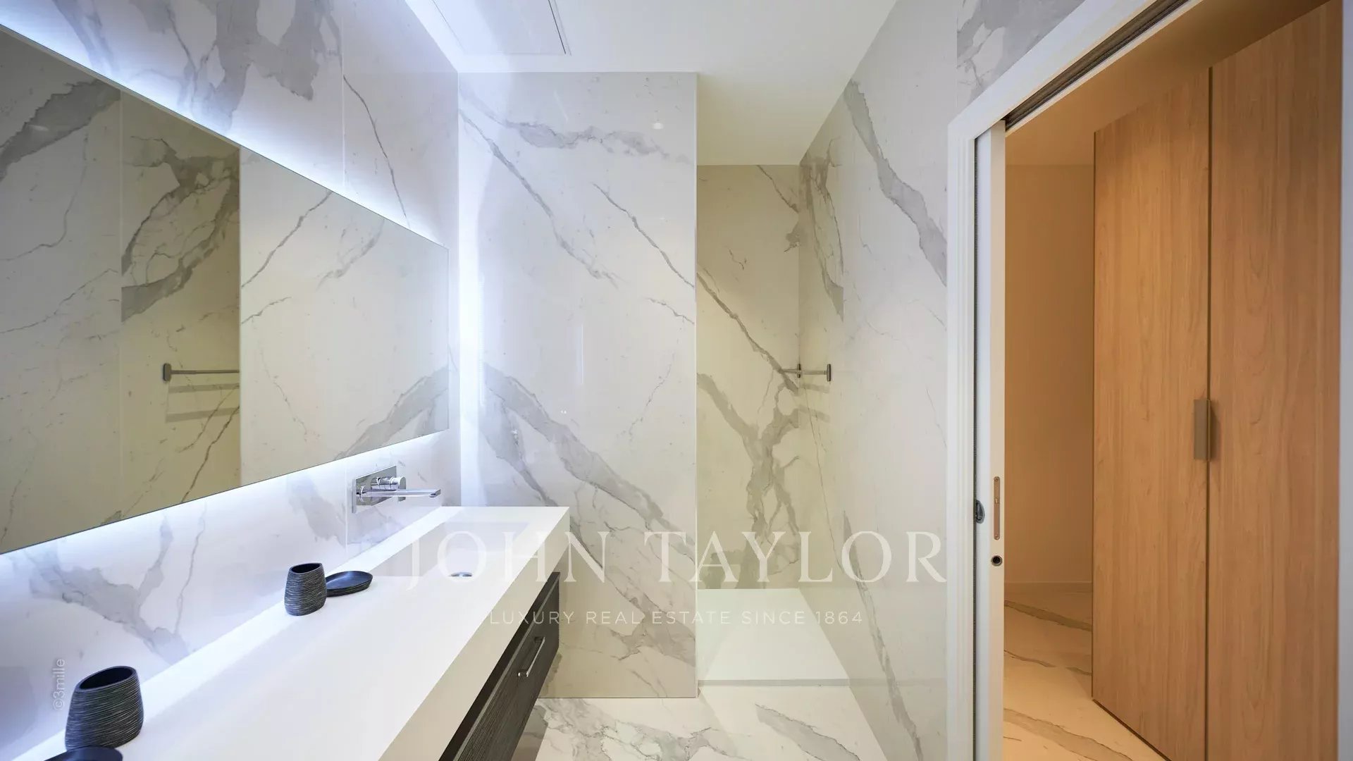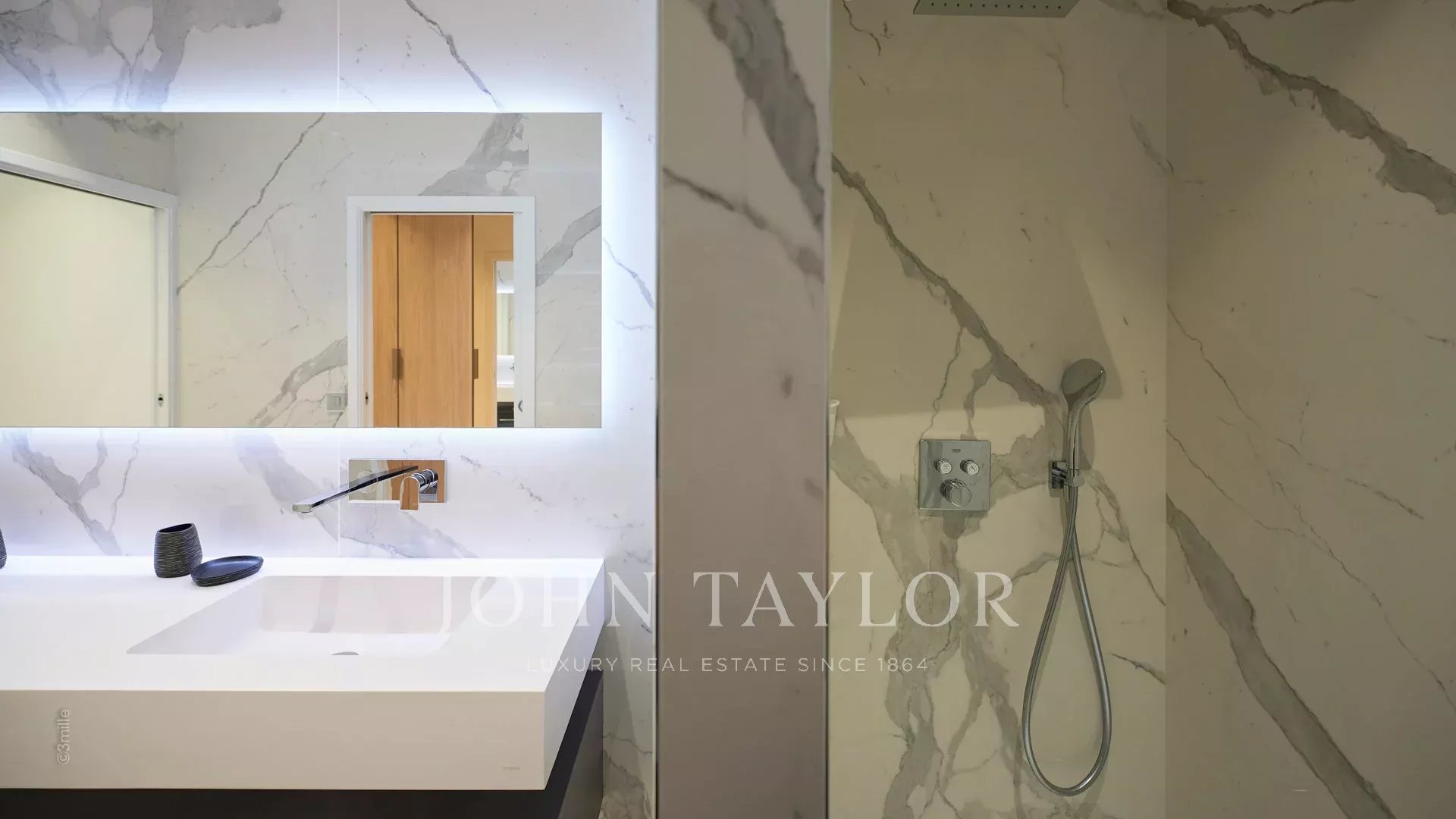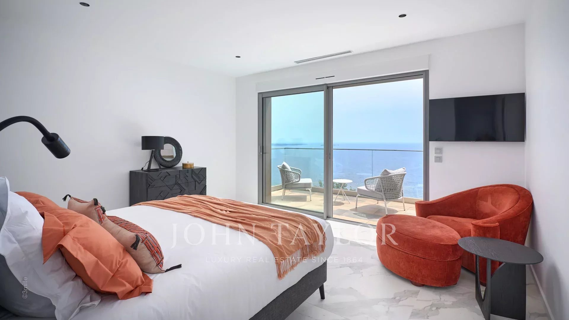 Com uma área de cerca de 340 m², o rés do chão é composto por uma ampla sala de estar que se abre para o terraço, uma cozinha em plano aberto, uma sala de jantar e um quarto principal com quarto de vestir. No piso inferior, encontram-se seis quartos com casa de banho privativa, incluindo um apartamento independente.