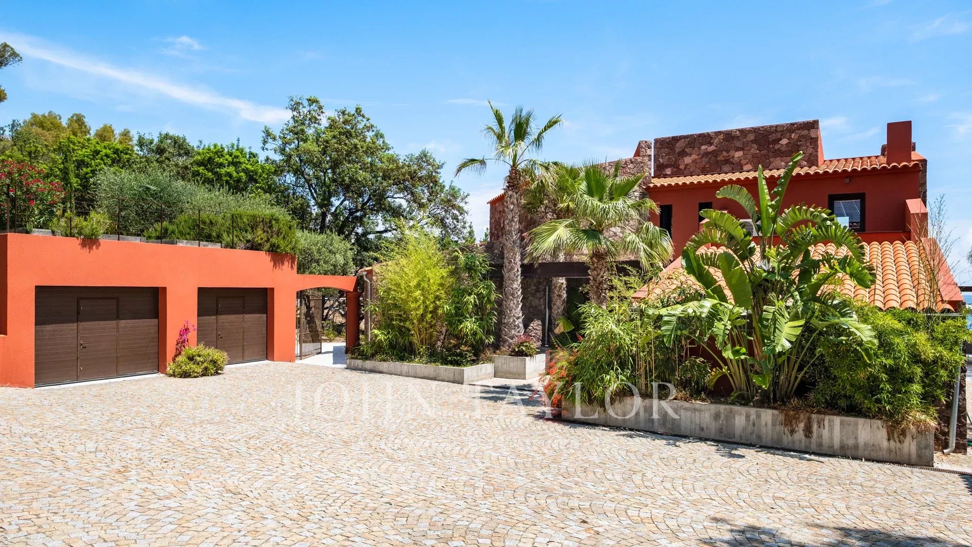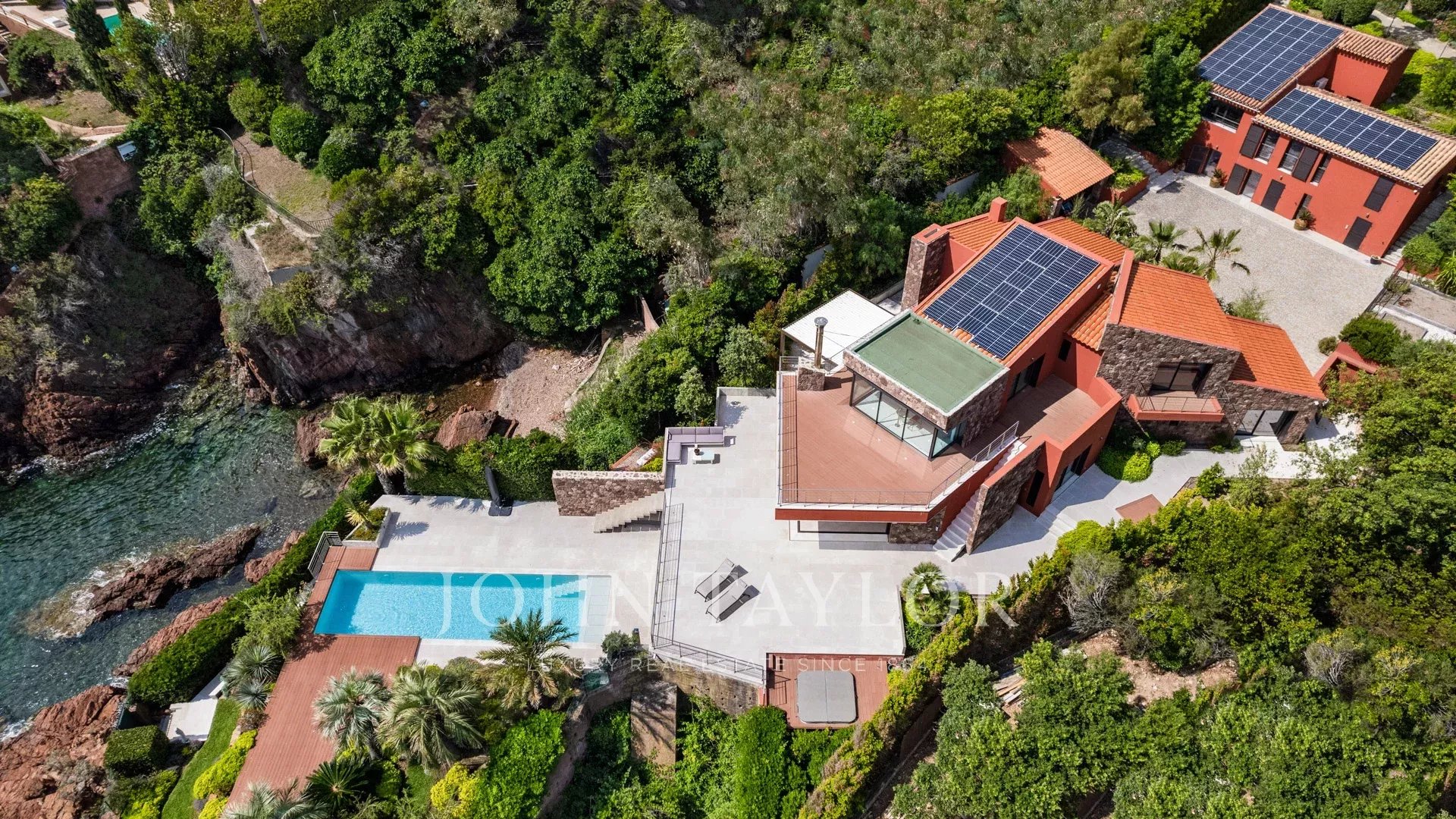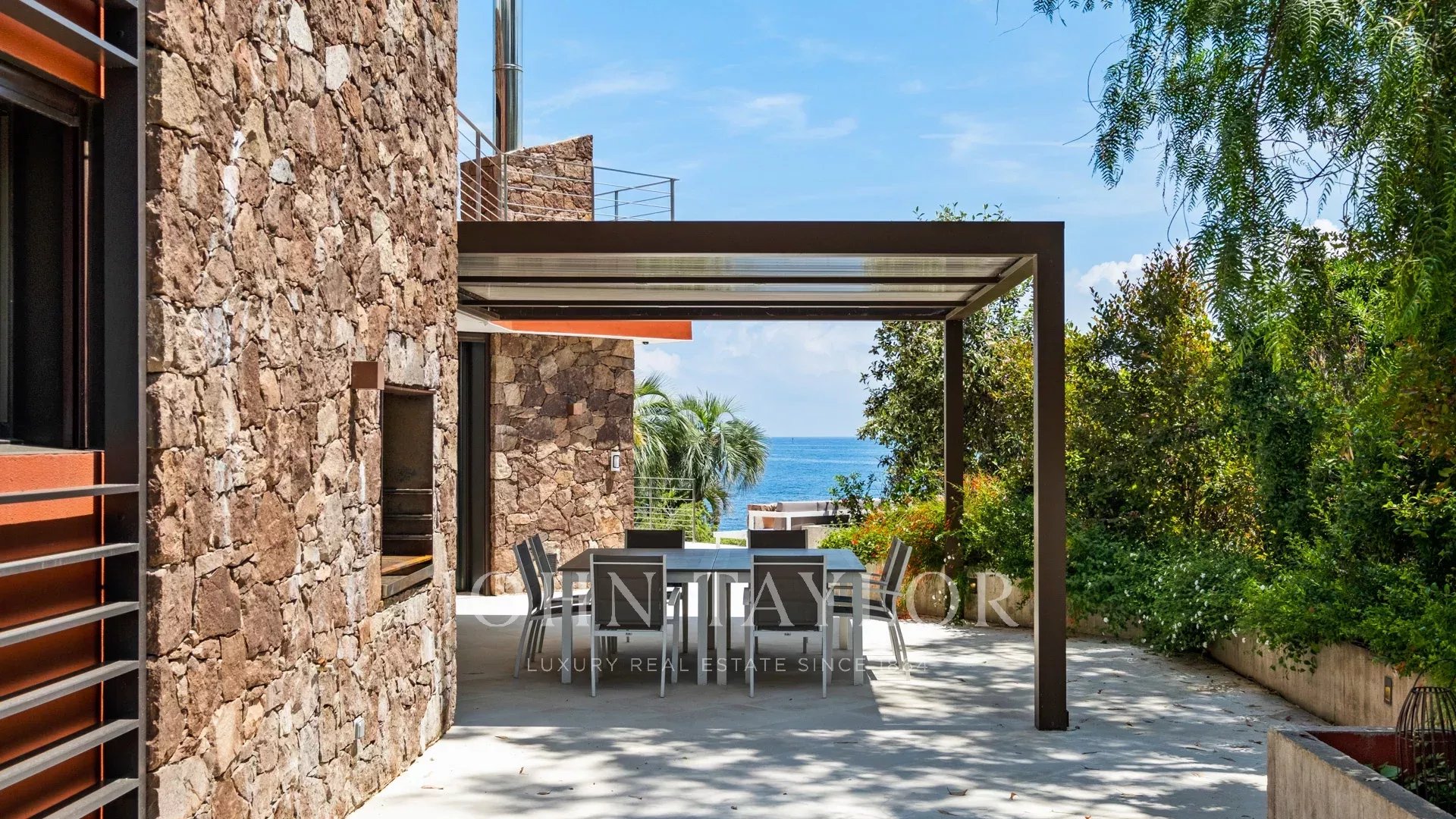 No coração de um terreno de 2827 m², uma sublime propriedade contemporânea à beira-mar de 420 m², composta por uma moradia principal e uma casa de hóspedes, com vistas espectaculares e acesso privado ao mar.