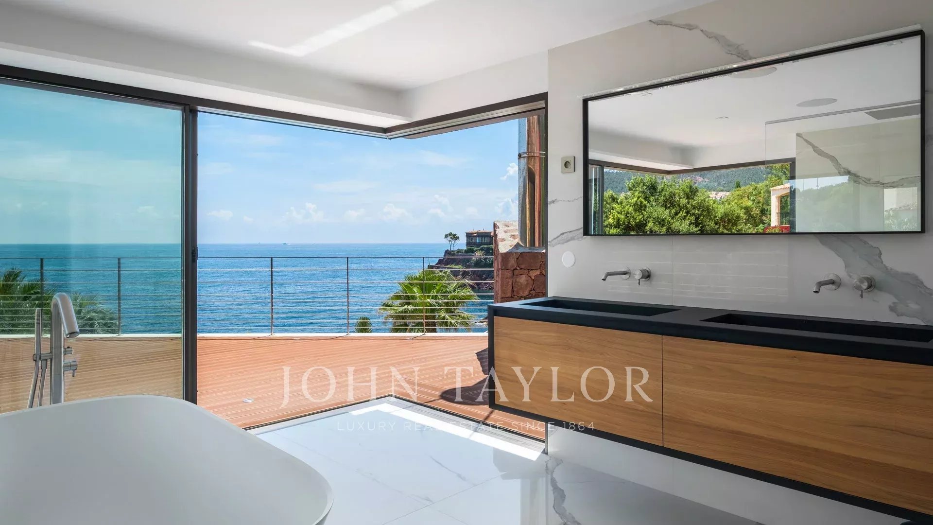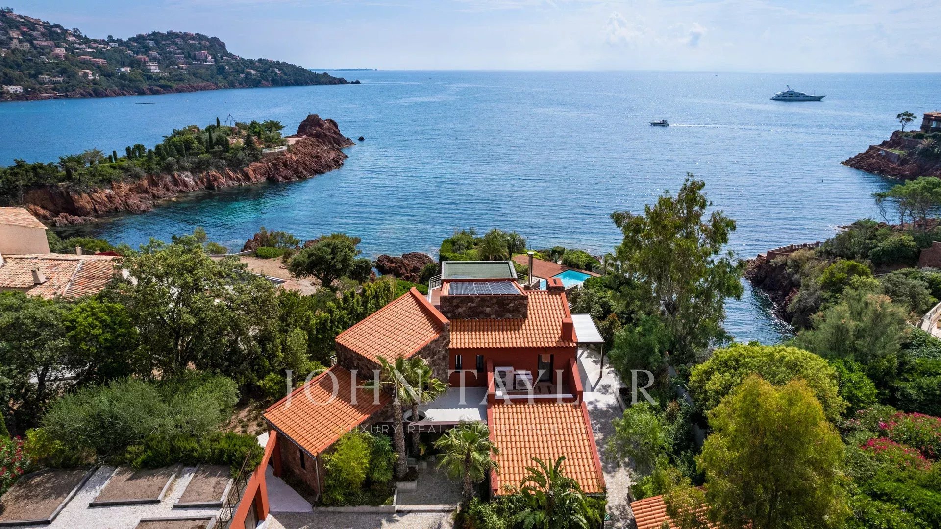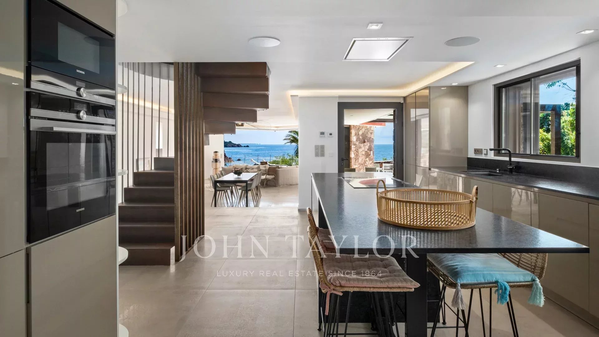 No coração de um terreno de 2827 m², uma sublime propriedade contemporânea à beira-mar de 420 m², composta por uma moradia principal e uma casa de hóspedes, com vistas espectaculares e acesso privado ao mar.