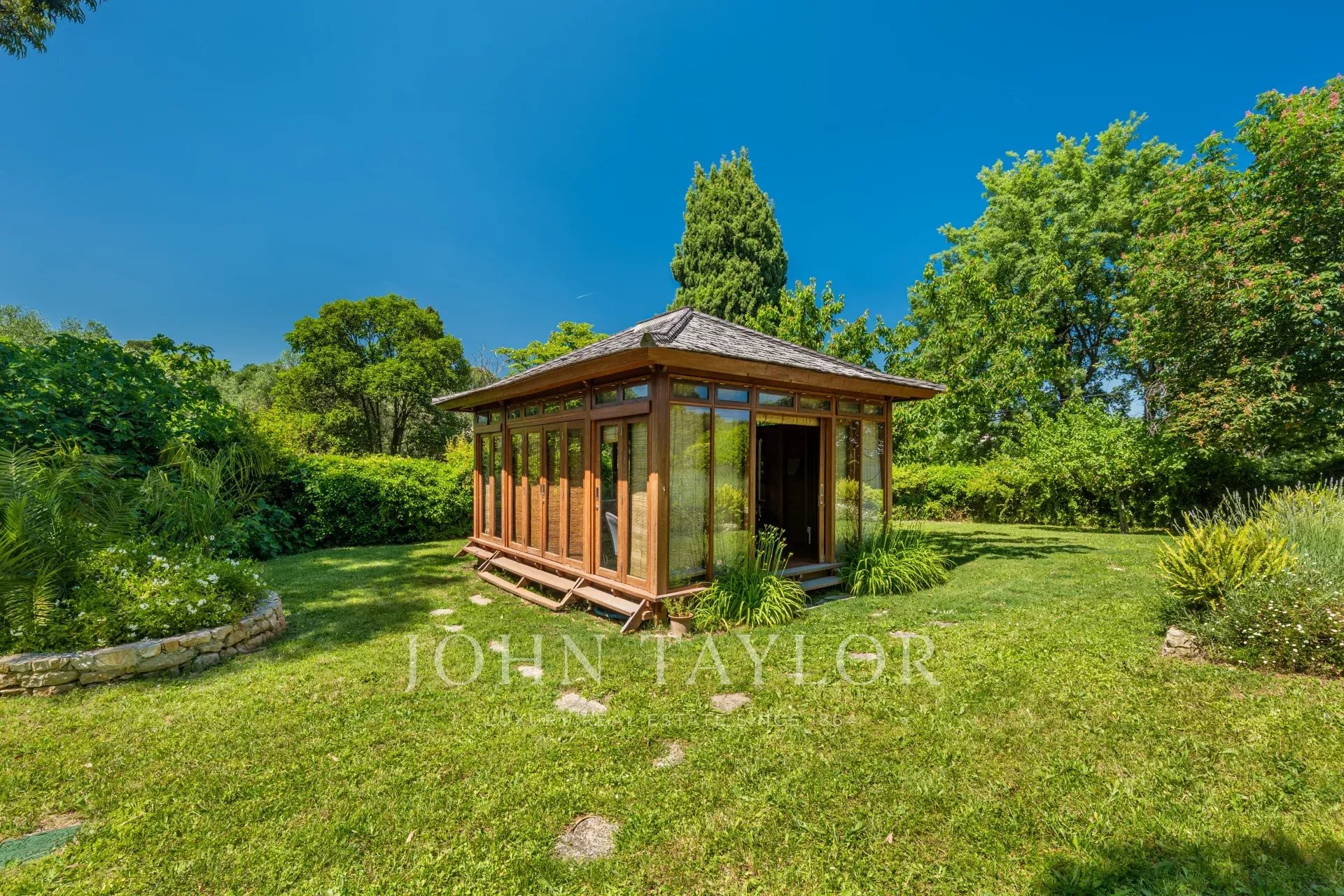 No exterior, o espetáculo continua com um magnífico jardim paisagístico de 4.978 m², verdadeiro relicário de verdura cuidadosamente cuidado. Ao anoitecer, mais de 100 pontos de luz sublimam os locais, criando uma atmosfera fantástica e elegante.