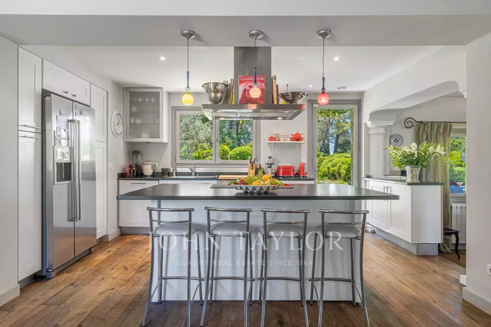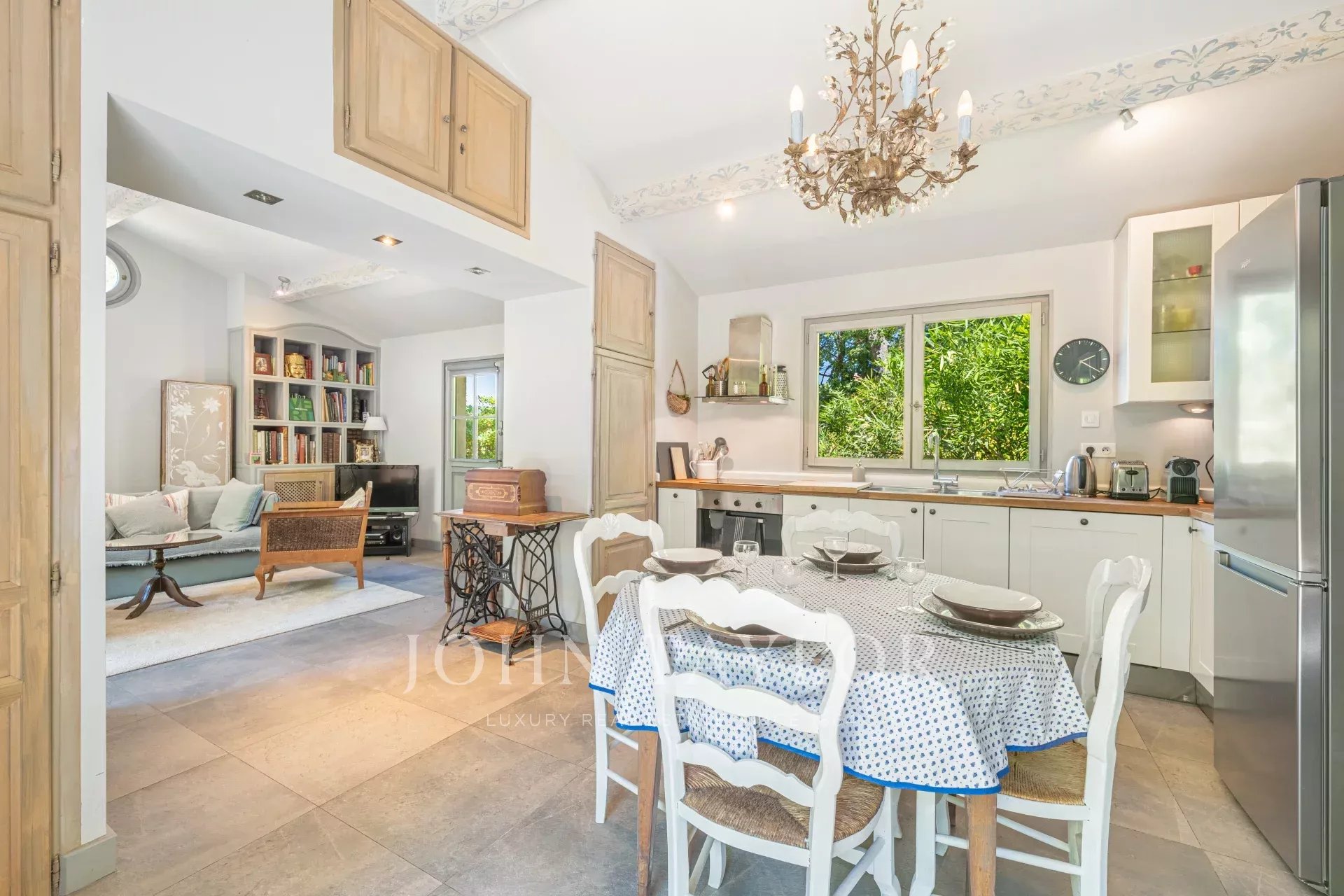 A cozinha aberta, perfeitamente equipada, se abre para uma ampla sala de estar sublimada por uma elegante lareira, convidando a momentos de convivialidade refinada.