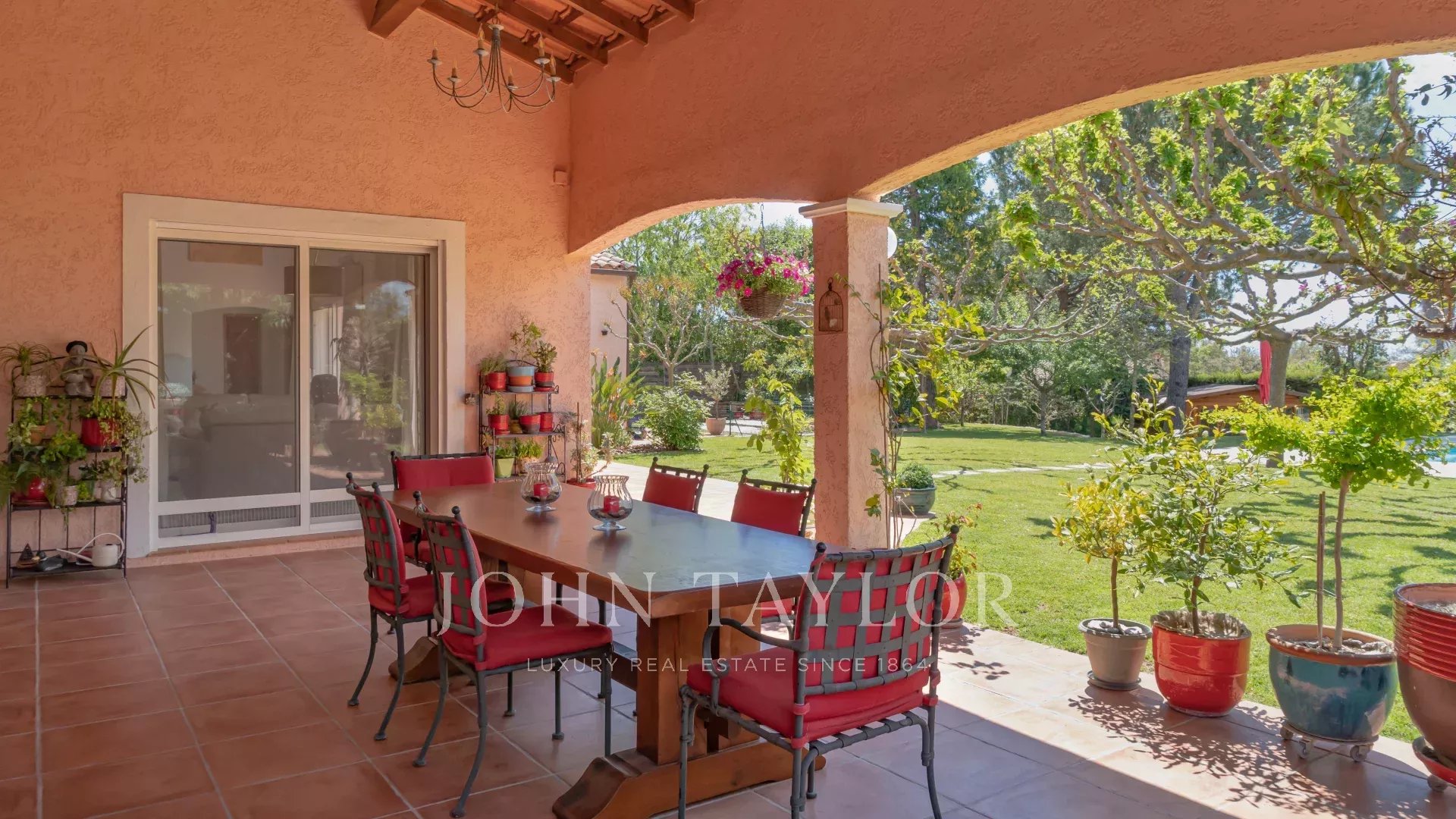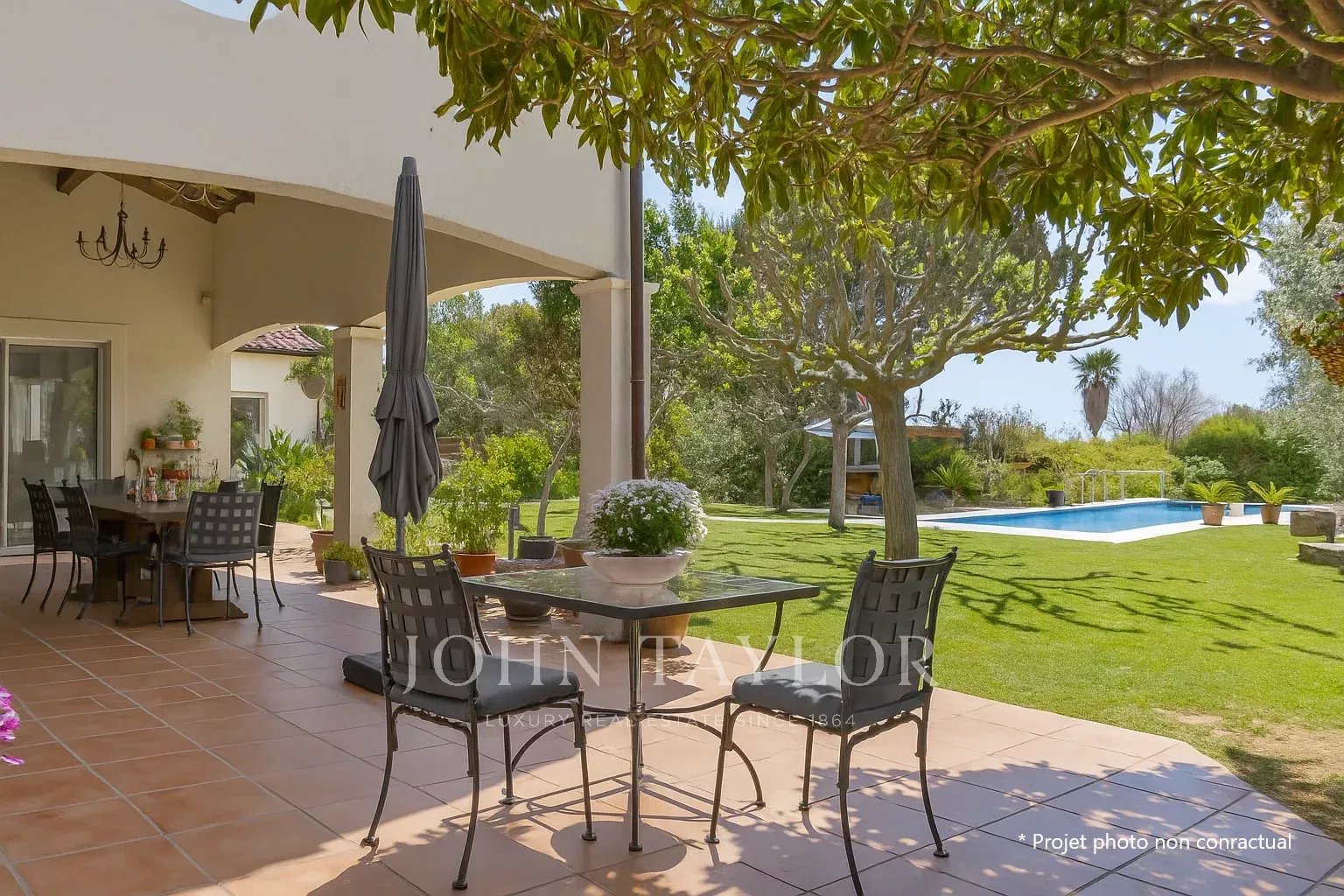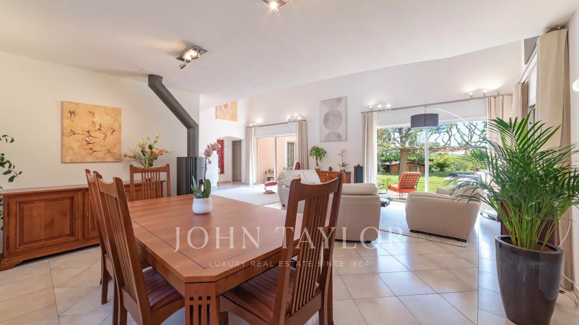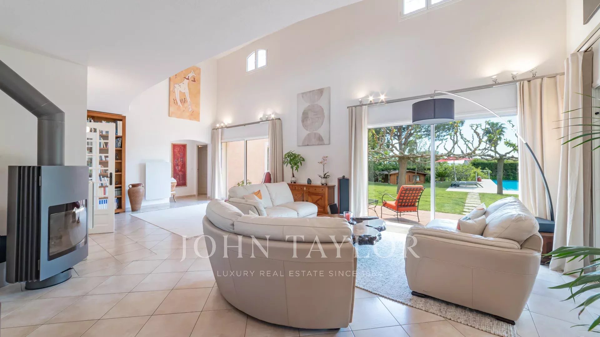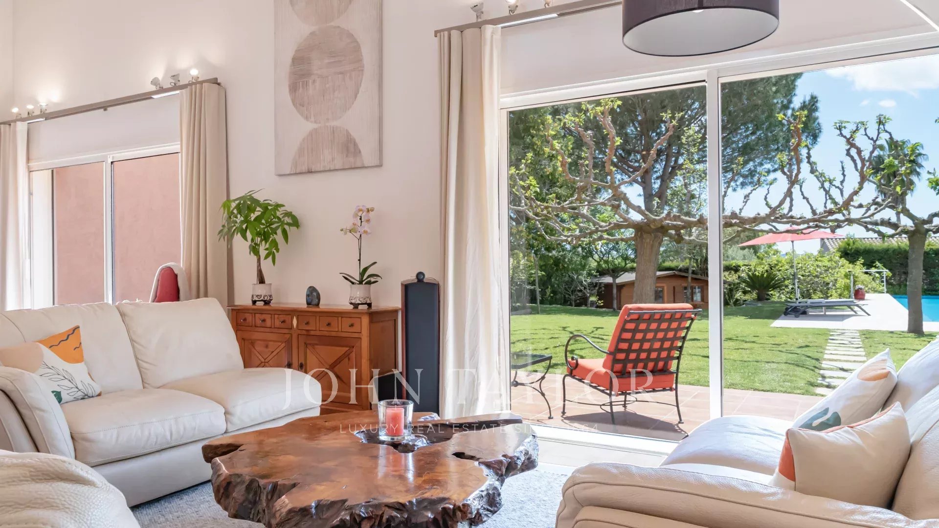 Uma sala de estar espaçosa e luminosa com tectos altos e vistas sobre o jardim bem cuidado e a piscina.