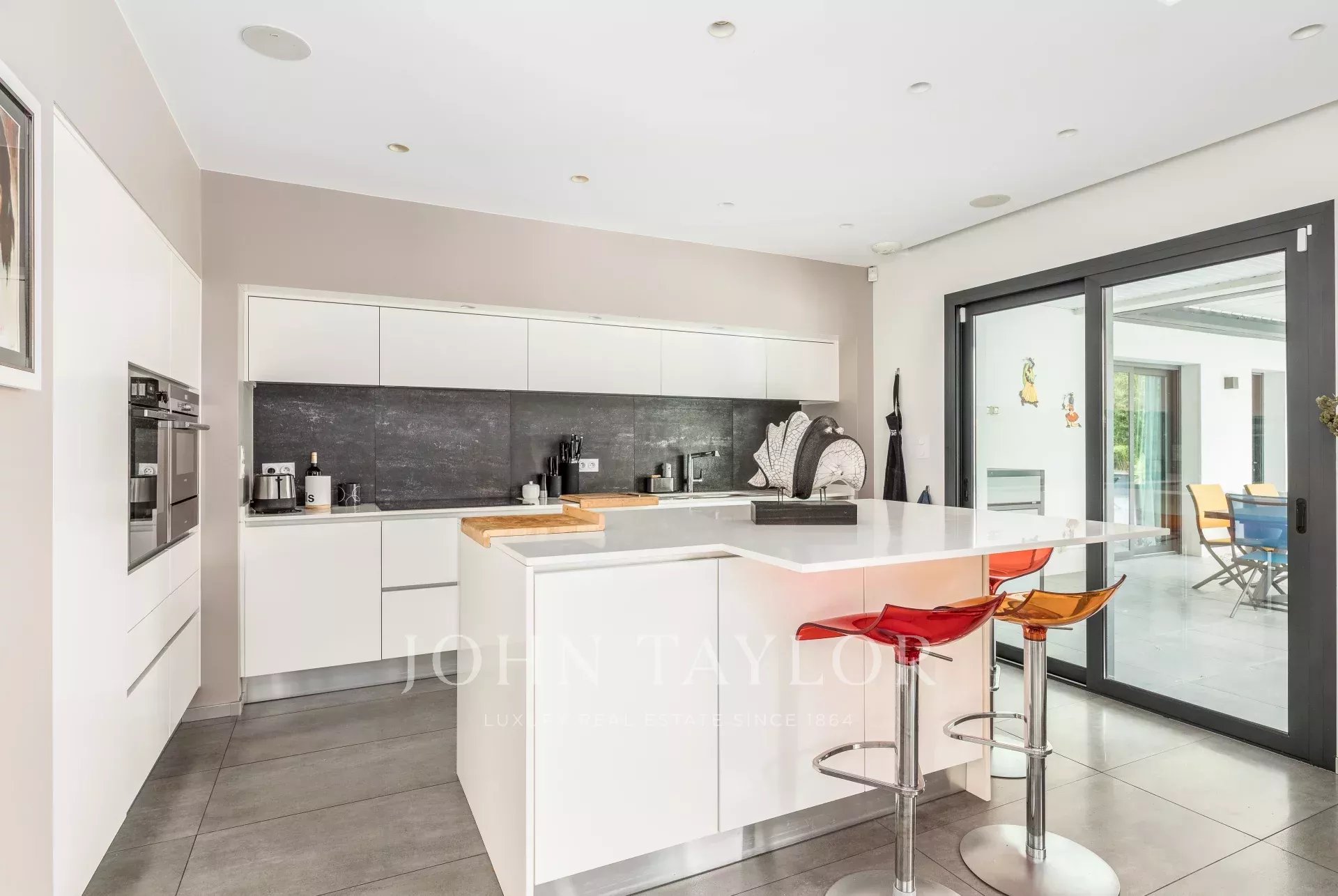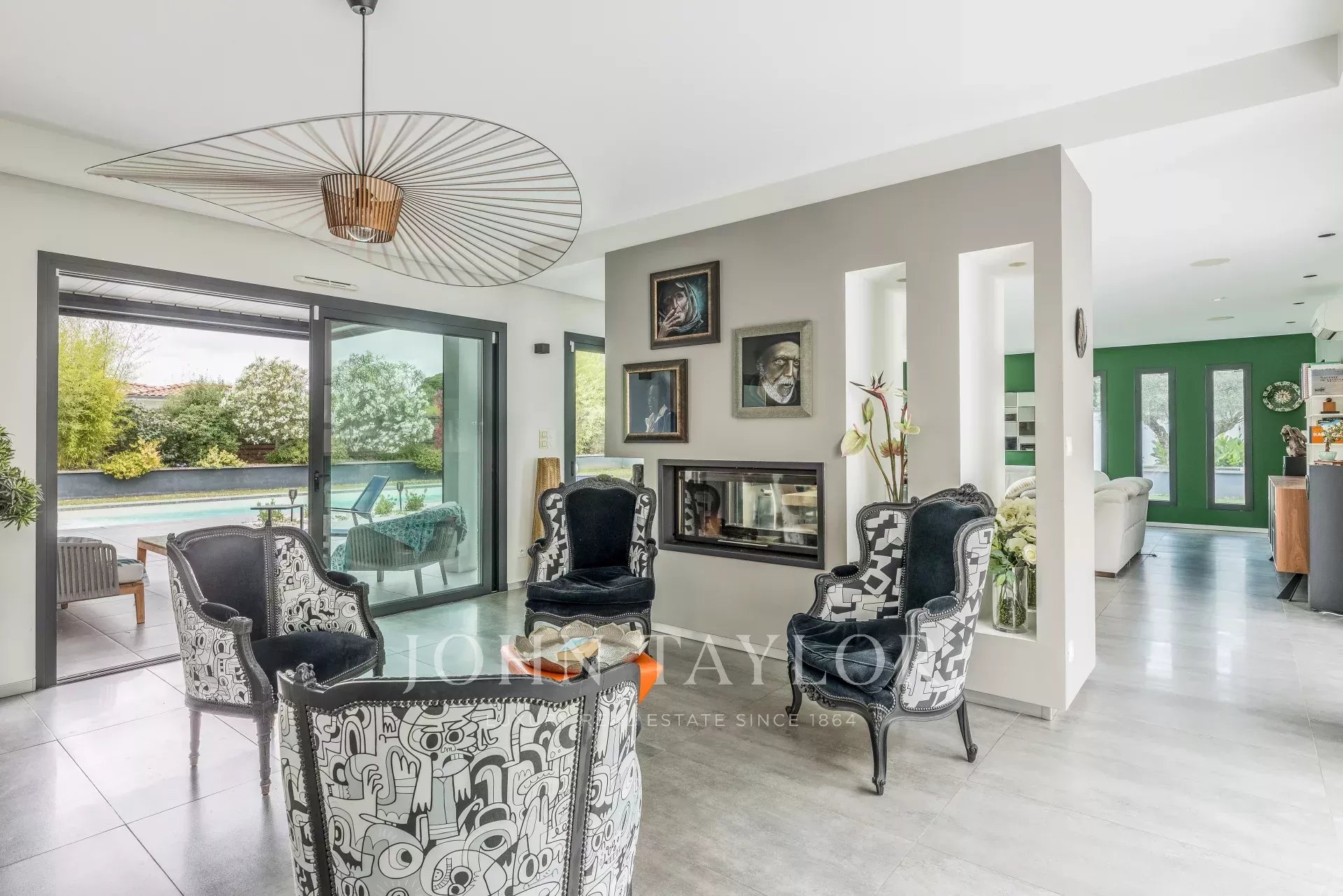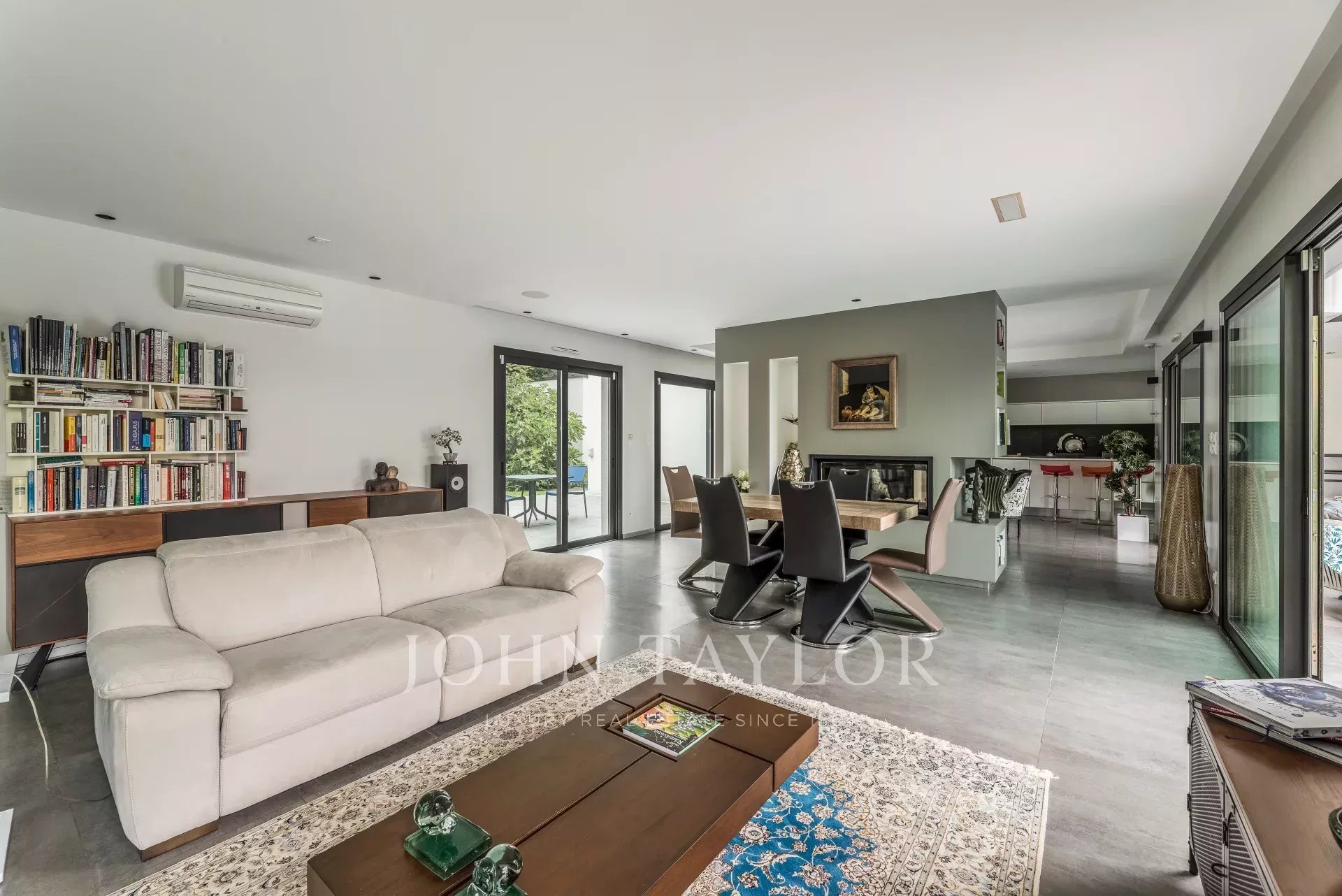 A maior parte da moradia está construída num só piso, e a sua amplitude, luz e um toque resolutamente contemporâneo são imediatamente apelativos. A sala de receção de 90 m², banhada de luz graças às suas grandes janelas panorâmicas, abre-se para vários terraços e possui uma elegante lareira de dois bicos. Uma cozinha totalmente equipada em plano aberto completa o espaço de vida.