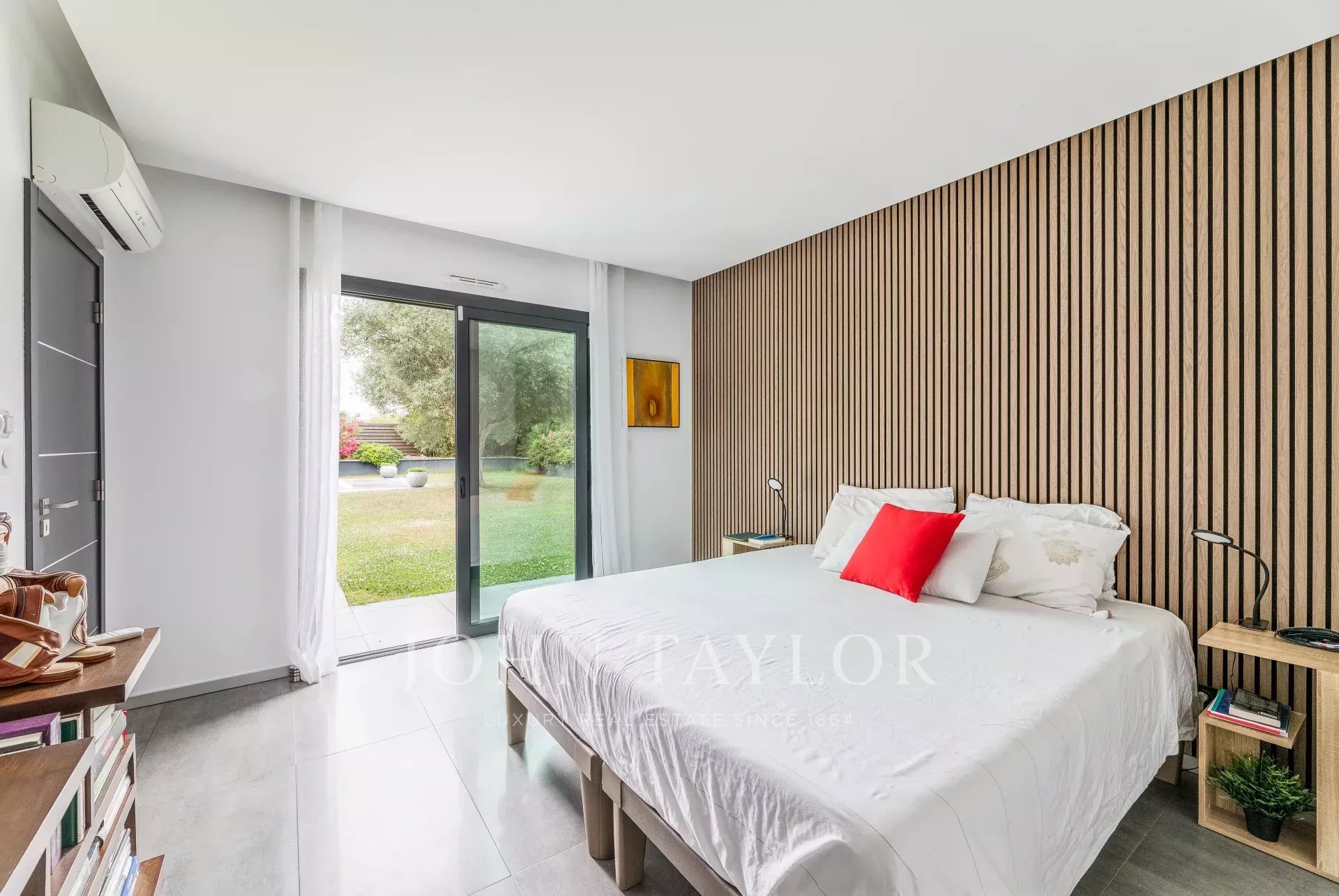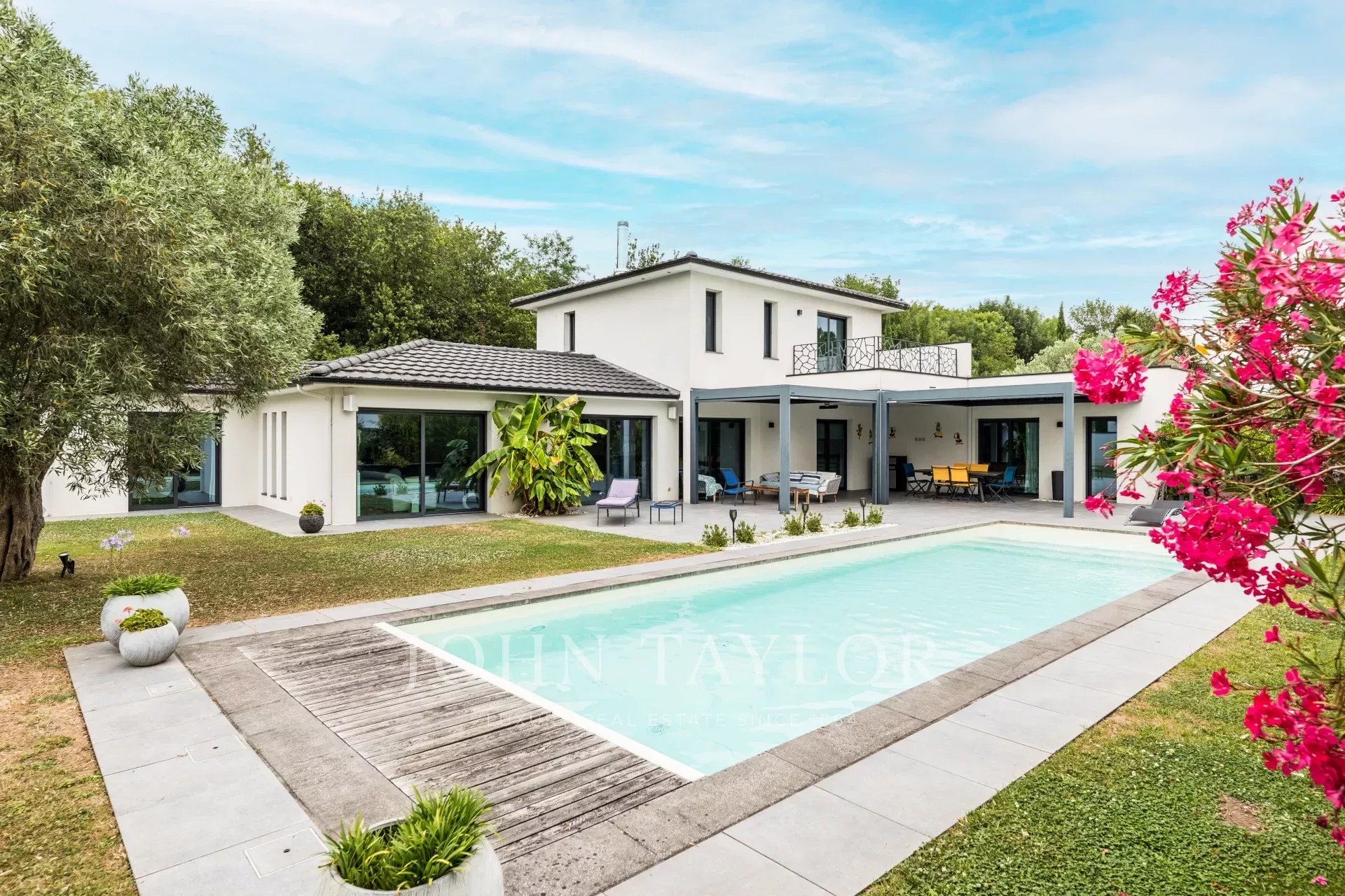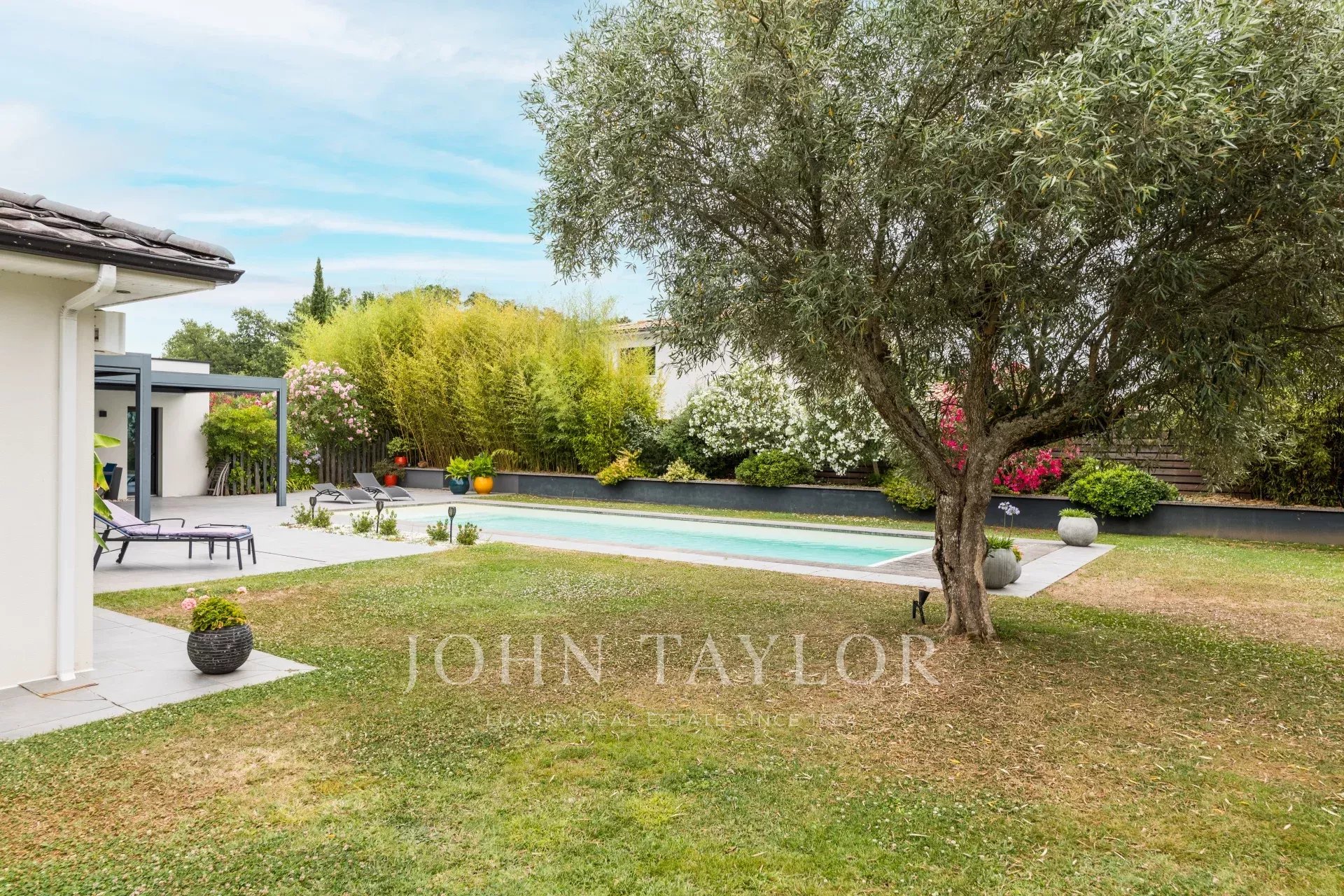 Escondida no final de um caminho de acesso privado, situa-se num soberbo terreno ajardinado com mais de 2.000 m², virado a sul e realçado por uma piscina de água salgada aquecida de 13 x 4 metros com cortina eléctrica submersa.