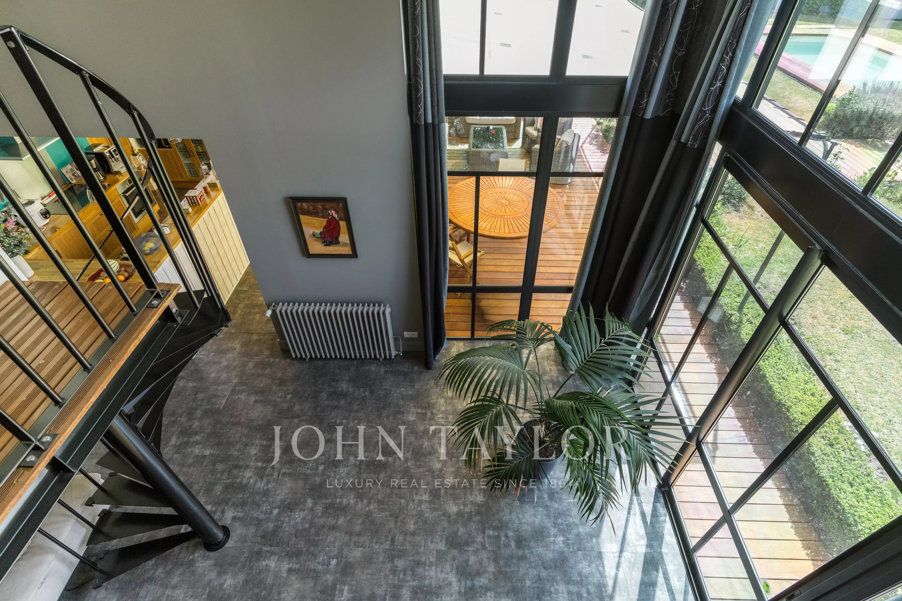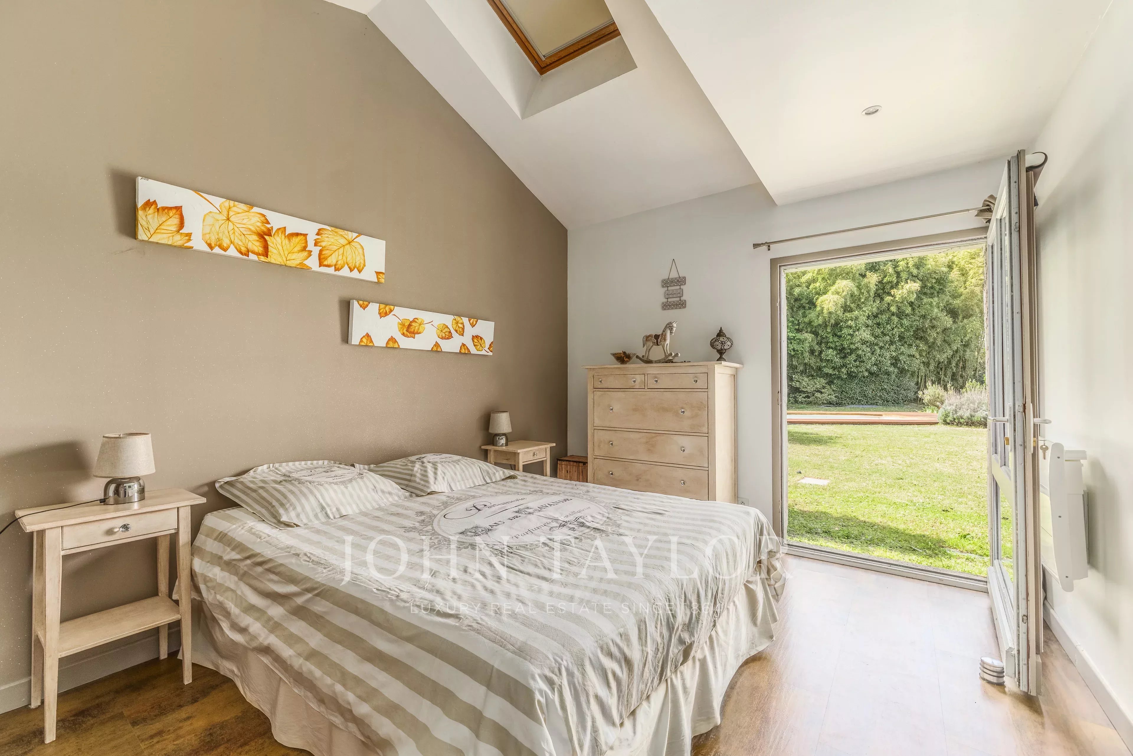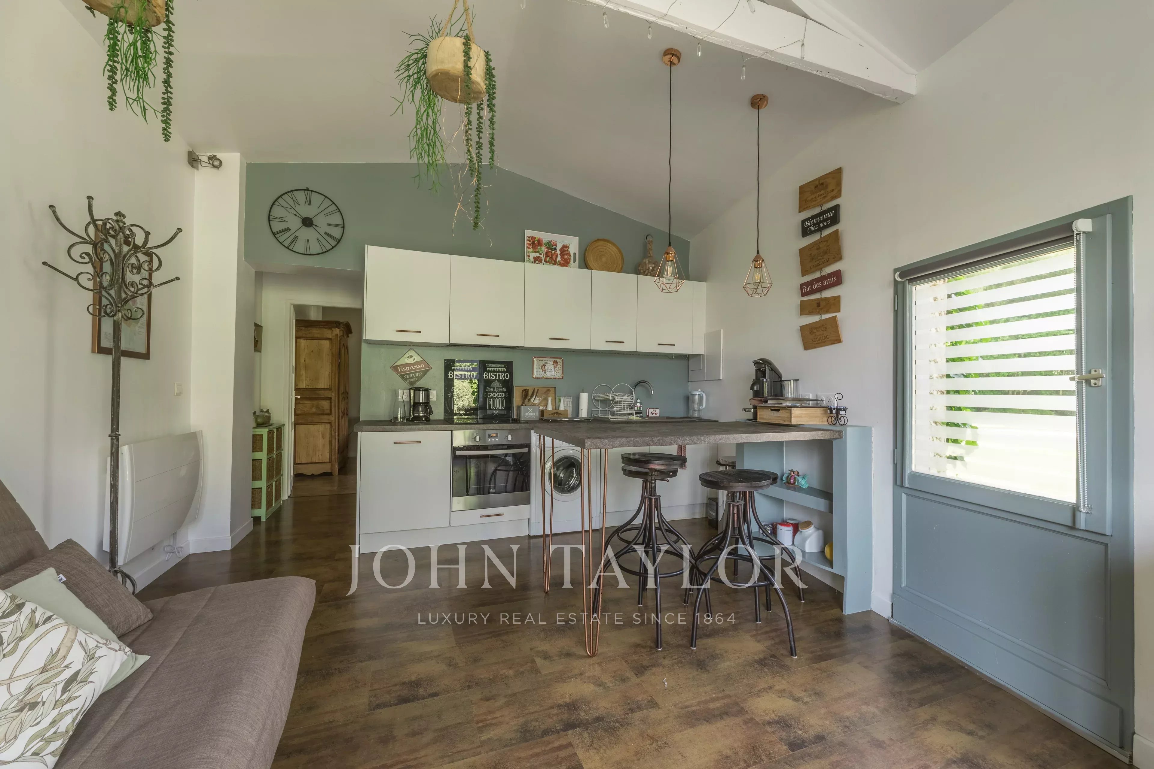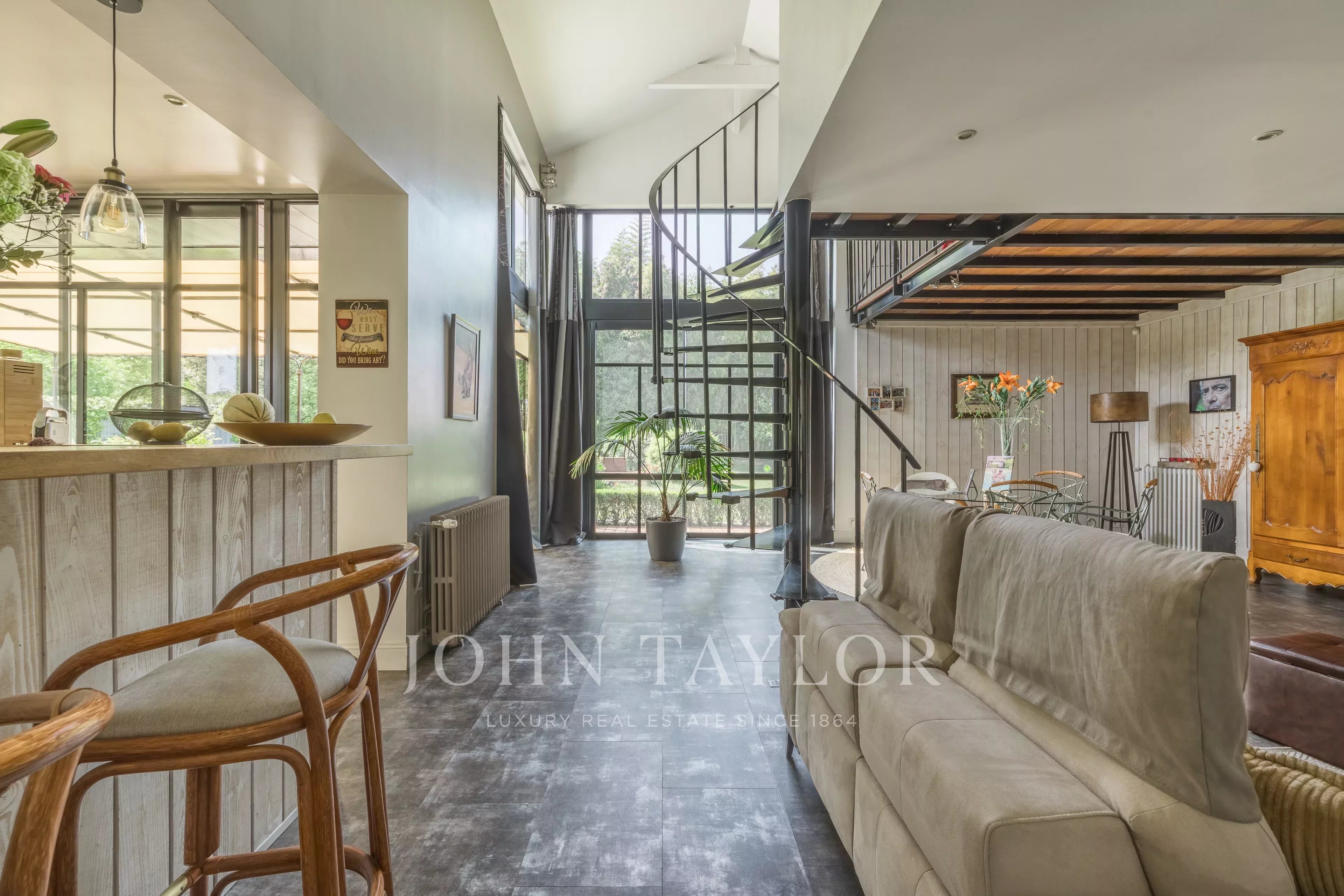 Depois de passar a entrada, fica-se seduzido pela sala principal de estar de 49 m², banhada de luz, com uma altura de teto de 5,4 metros. Ela se abre para um grande espaço de cozinha de 24m², prolongado por uma varanda de madeira exótica, perfeita para refeições de verão. A casa dispõe de quatro quartos, uma sala de jogos (com ar-condicionado), duas casas de banho, duas toilettes e uma lavandaria.
