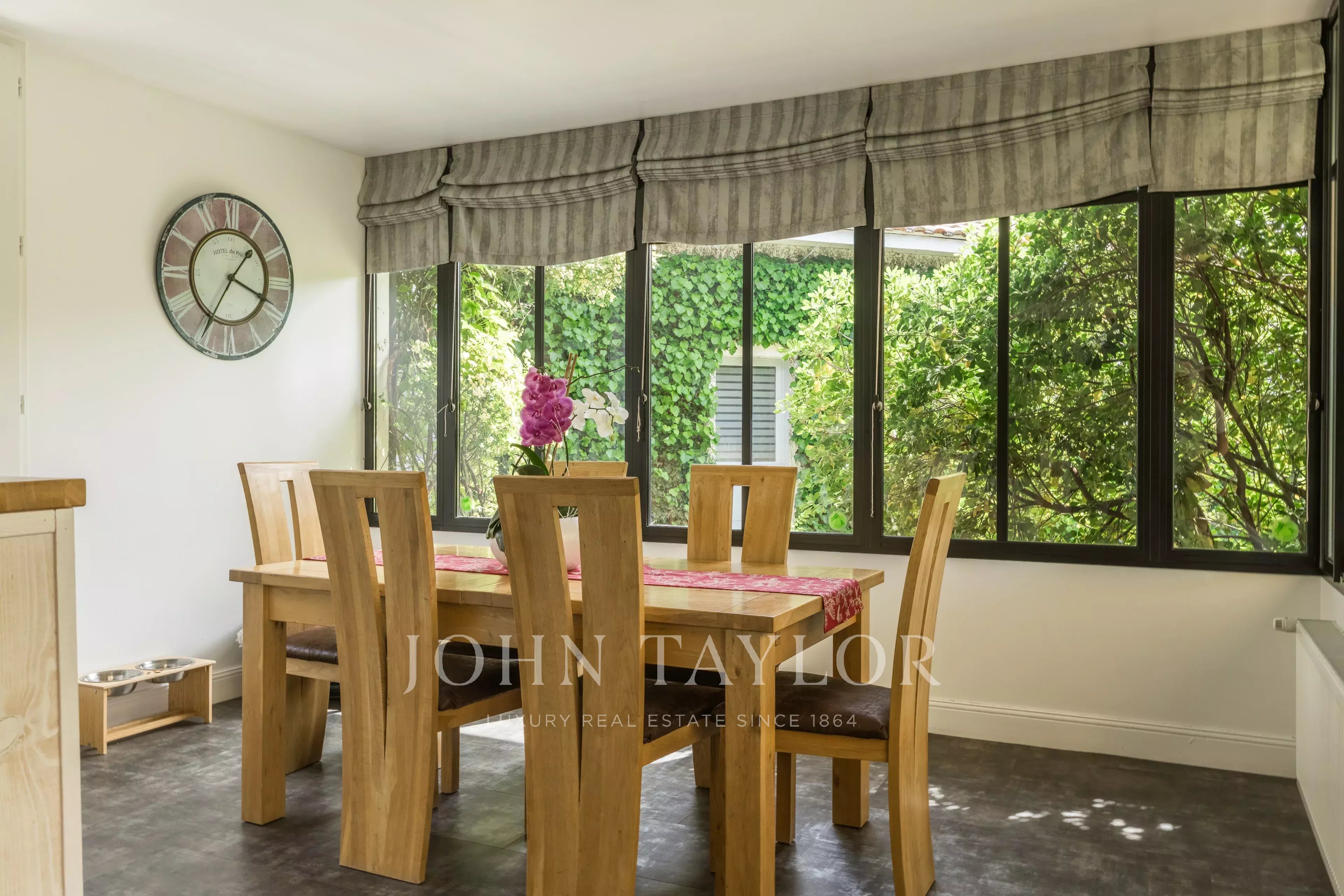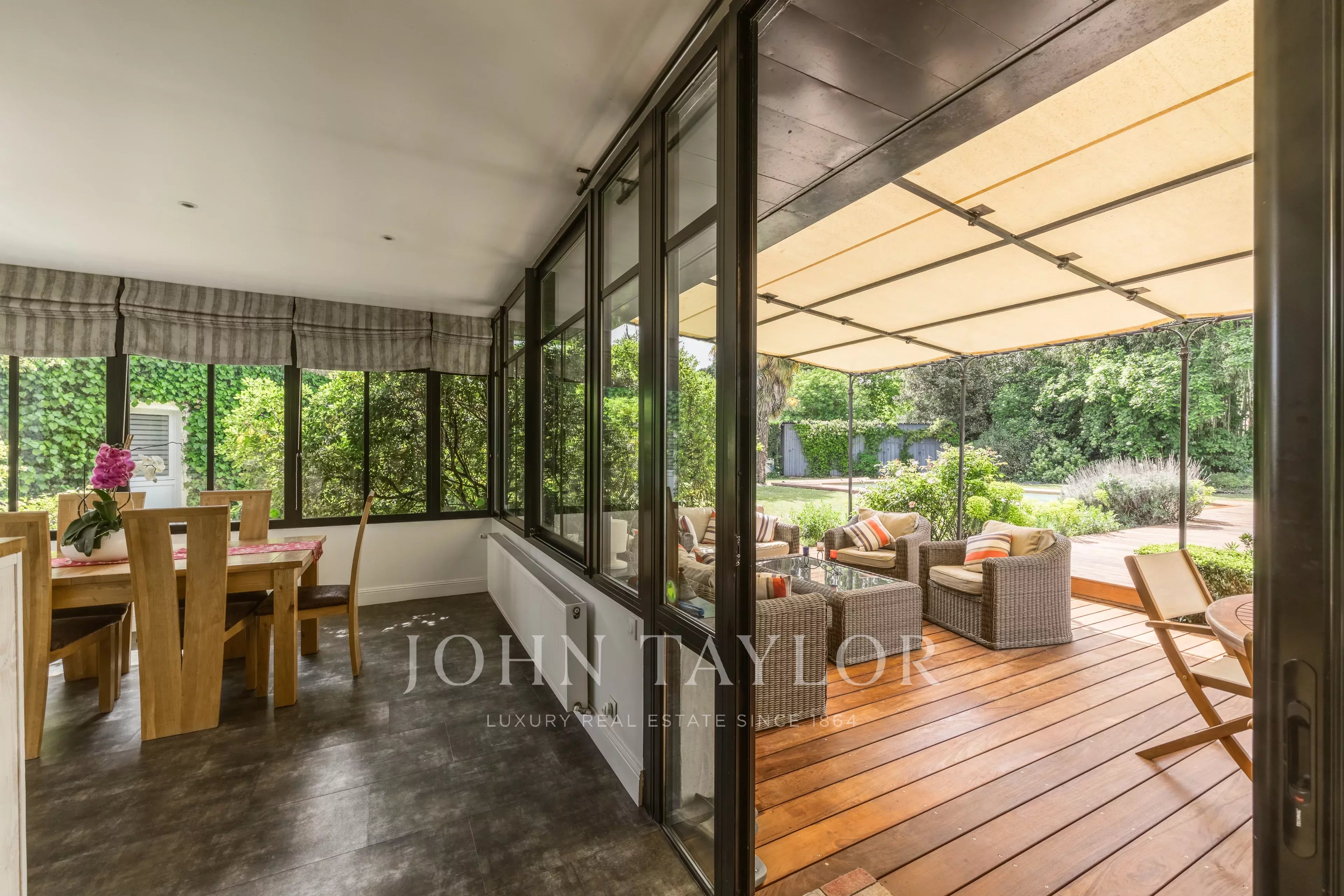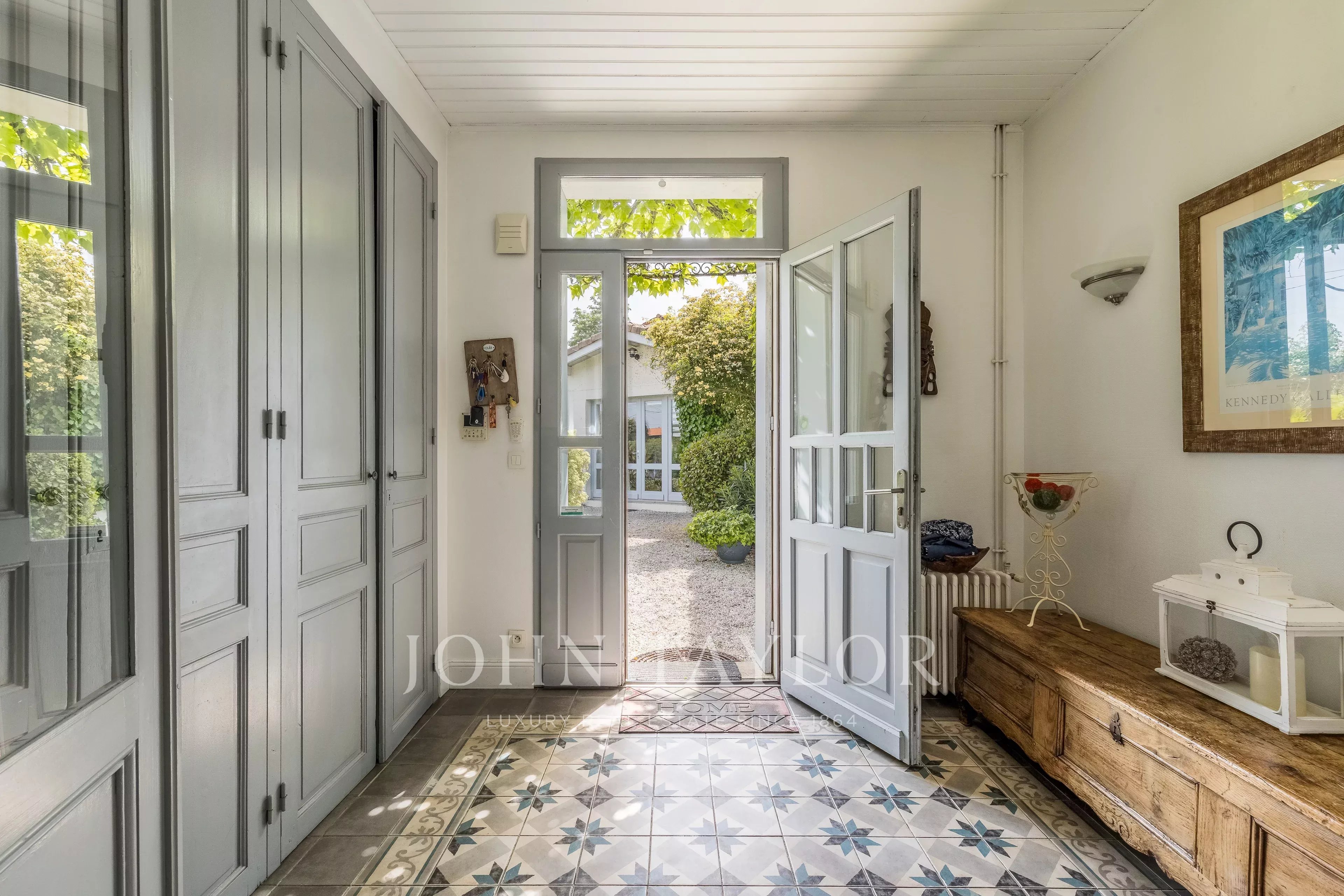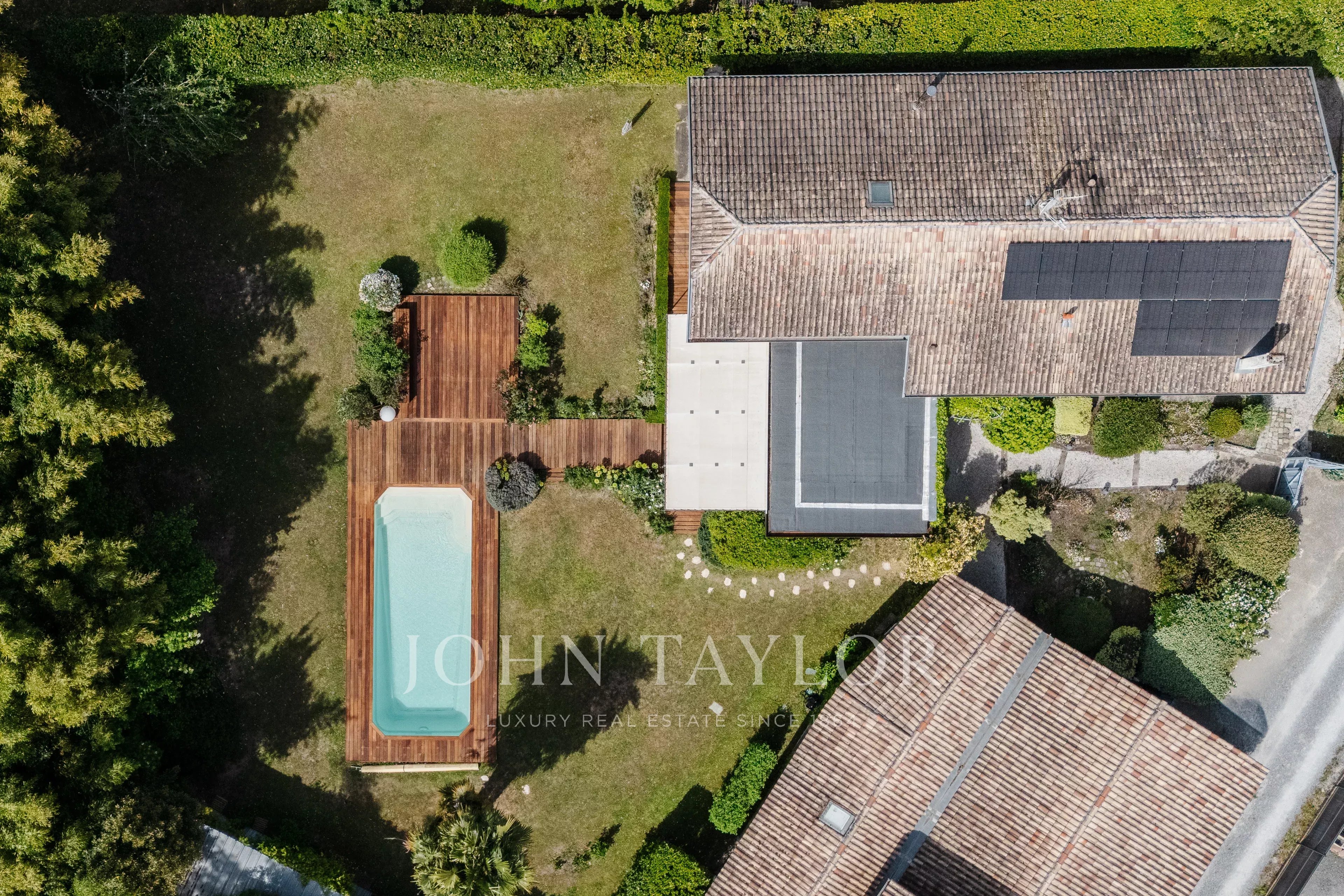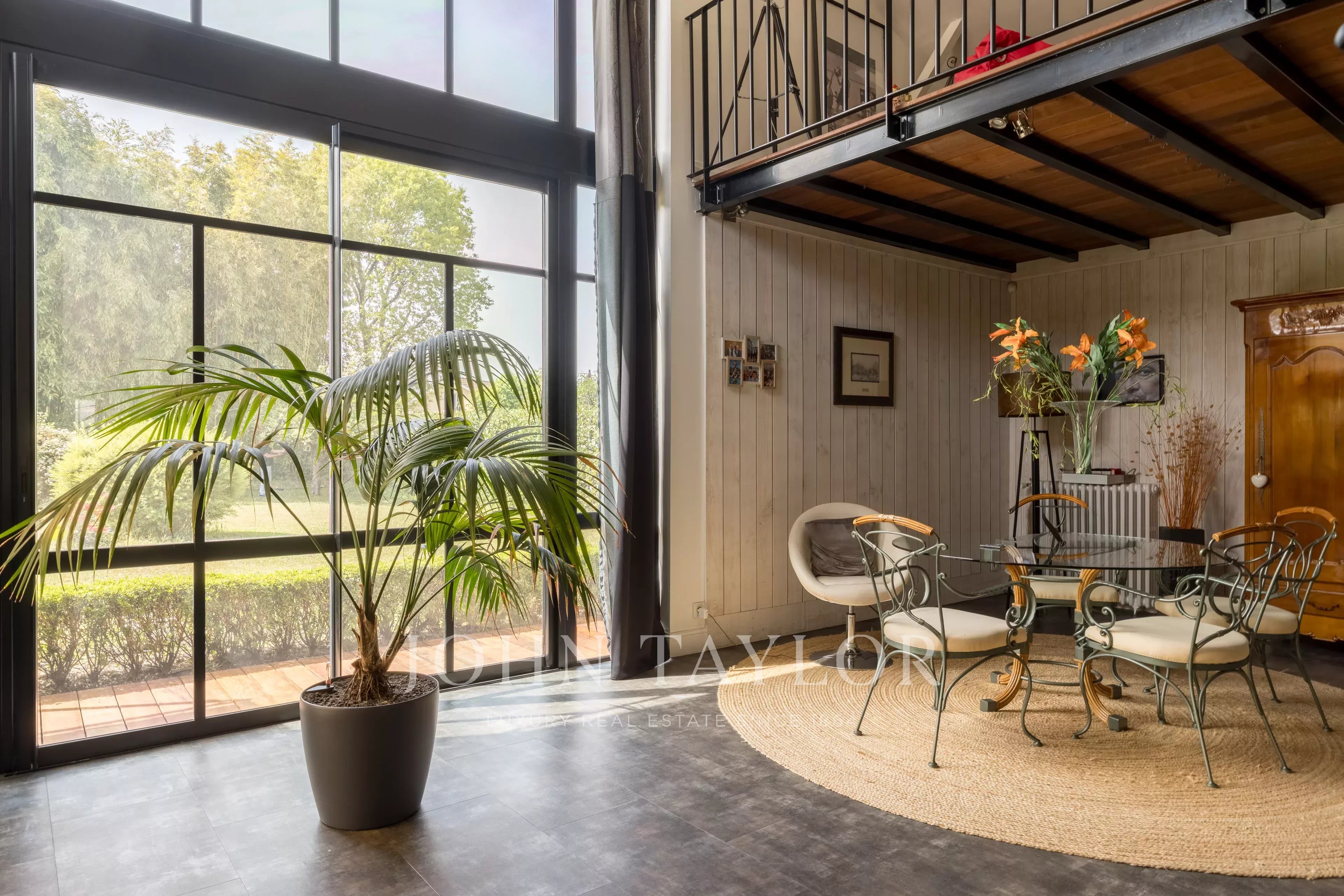 Depois de passar a entrada, fica-se seduzido pela sala principal de estar de 49 m², banhada de luz, com uma altura de teto de 5,4 metros. Ela se abre para um grande espaço de cozinha de 24m², prolongado por uma varanda de madeira exótica, perfeita para refeições de verão. A casa dispõe de quatro quartos, uma sala de jogos (com ar-condicionado), duas casas de banho, duas toilettes e uma lavandaria.