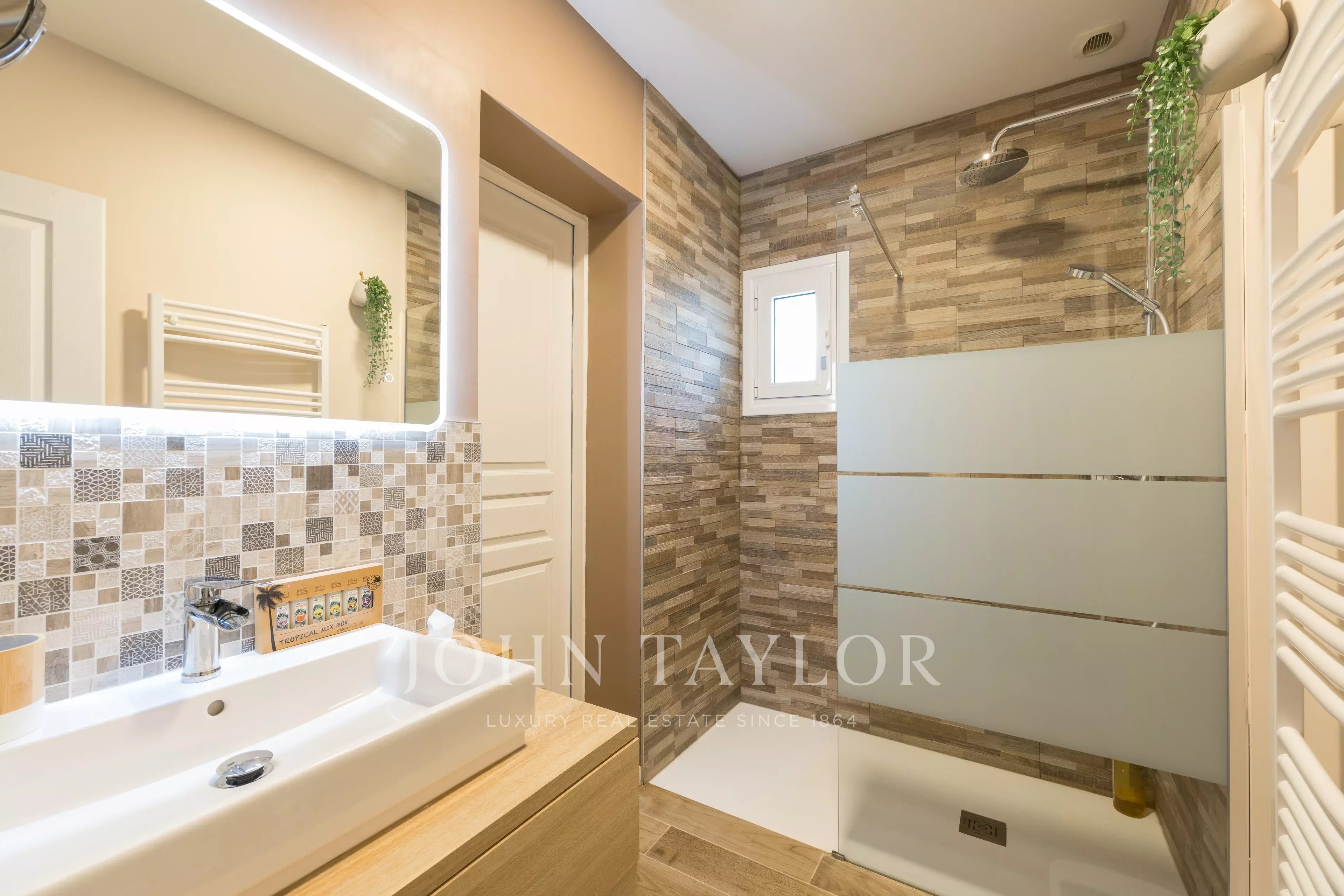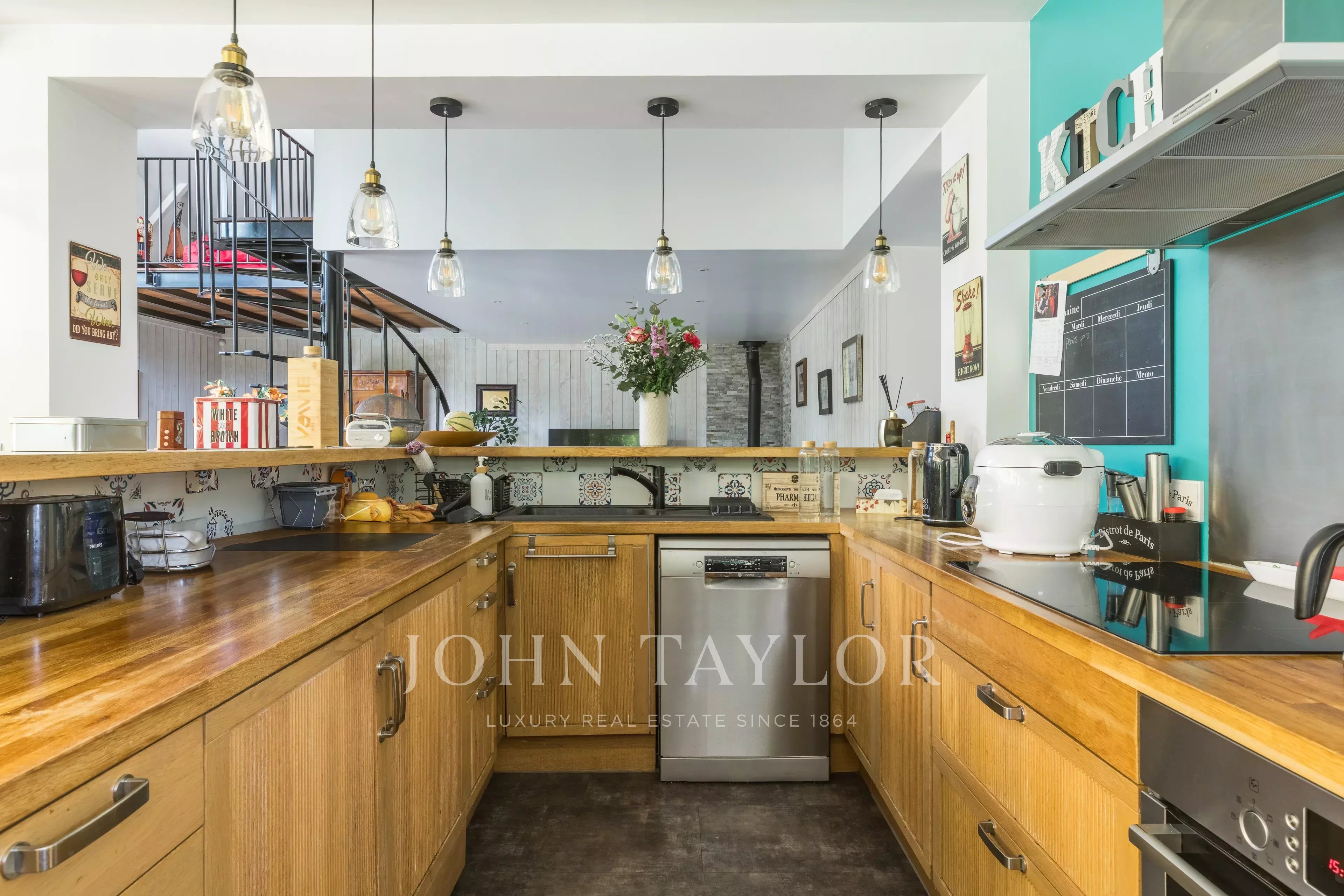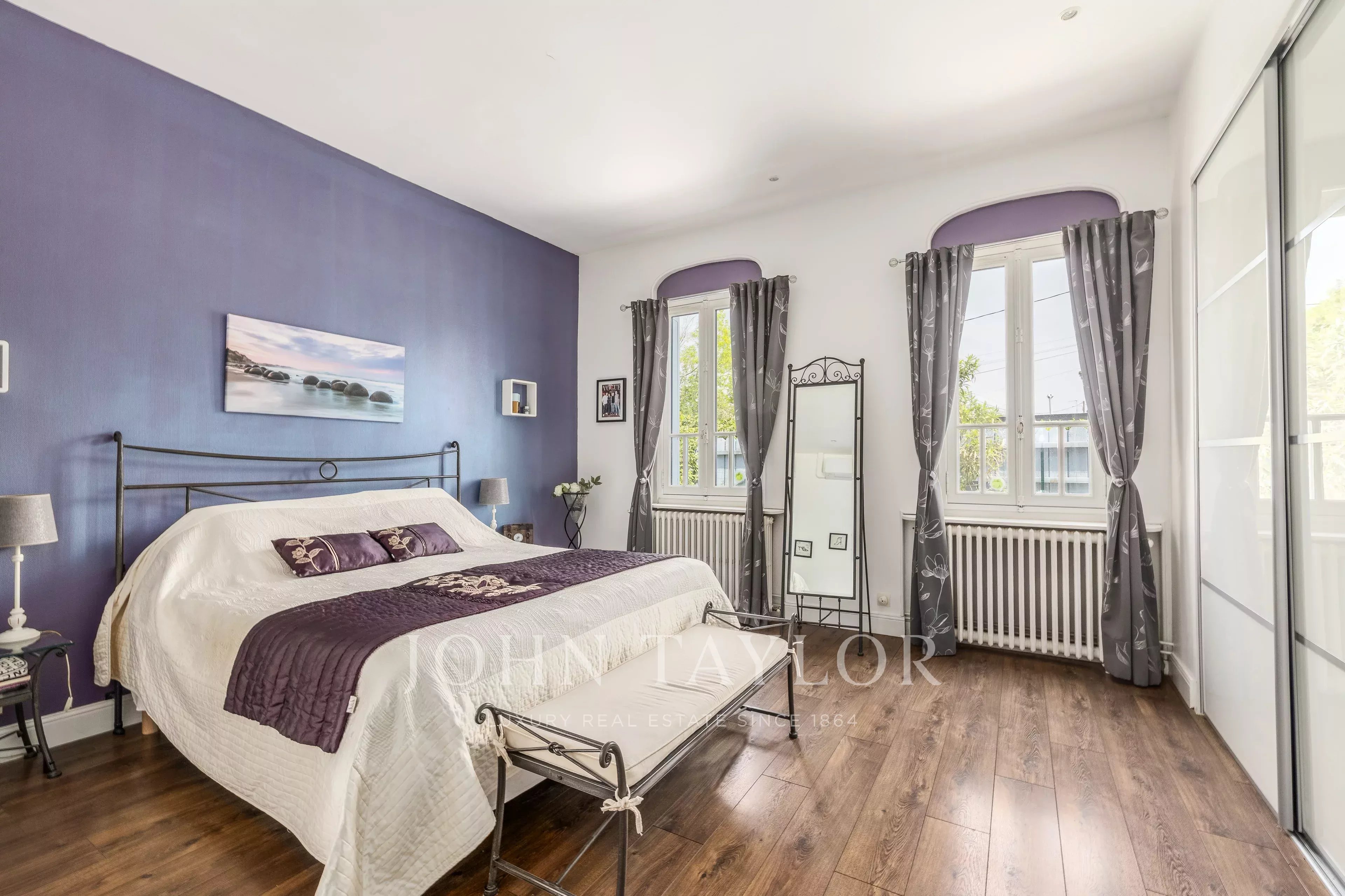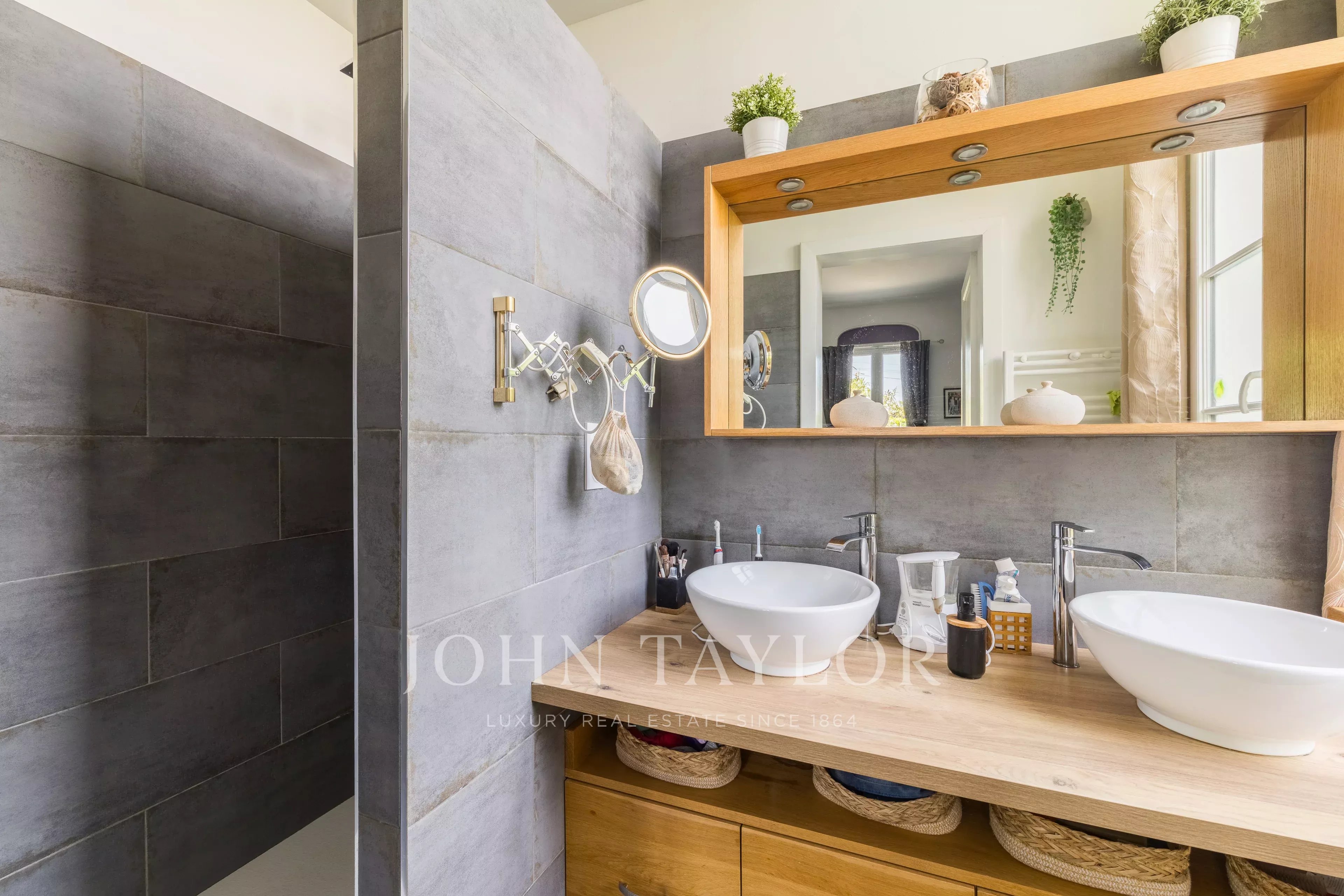 Depois de passar a entrada, fica-se seduzido pela sala principal de estar de 49 m², banhada de luz, com uma altura de teto de 5,4 metros. Ela se abre para um grande espaço de cozinha de 24m², prolongado por uma varanda de madeira exótica, perfeita para refeições de verão. A casa dispõe de quatro quartos, uma sala de jogos (com ar-condicionado), duas casas de banho, duas toilettes e uma lavandaria.