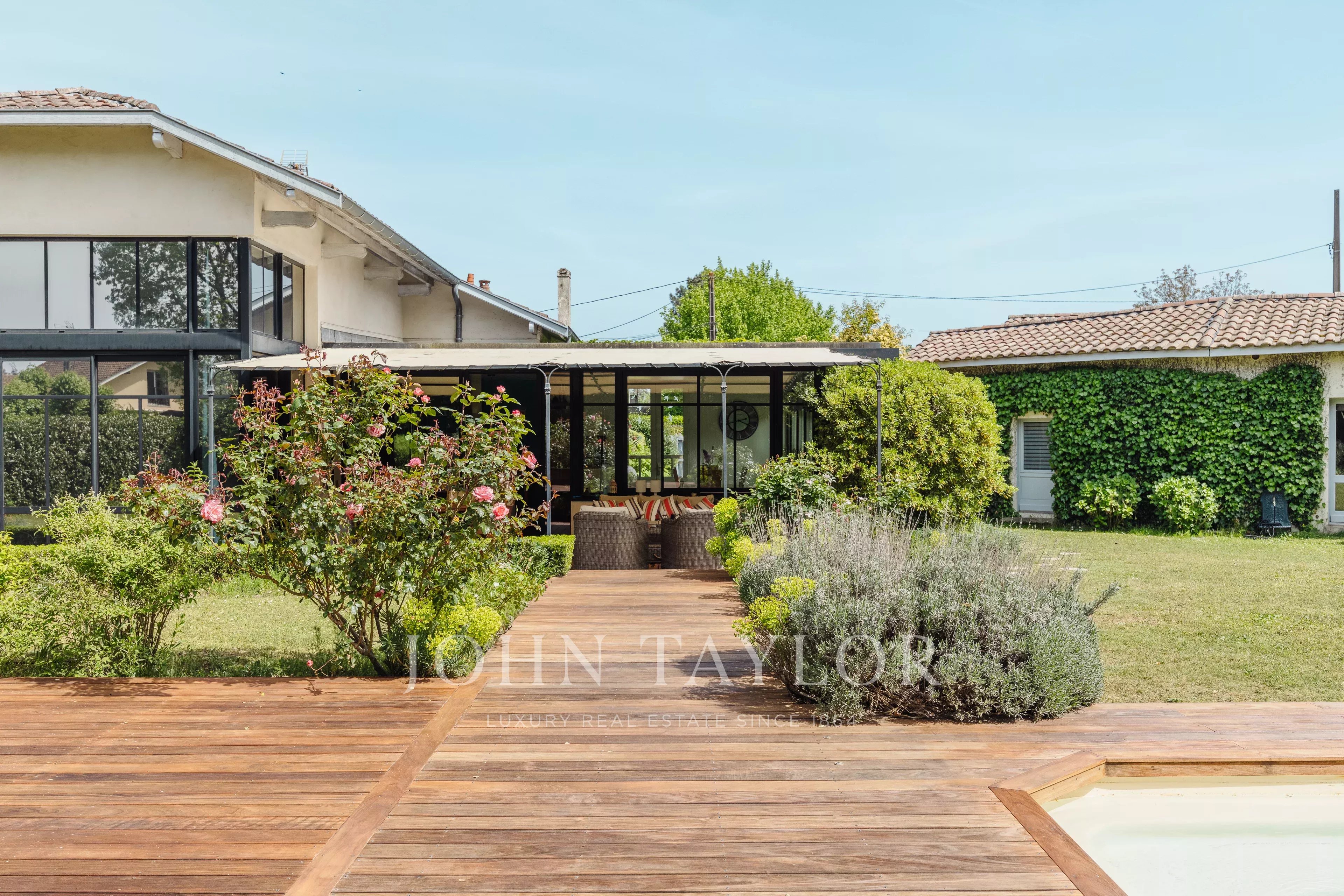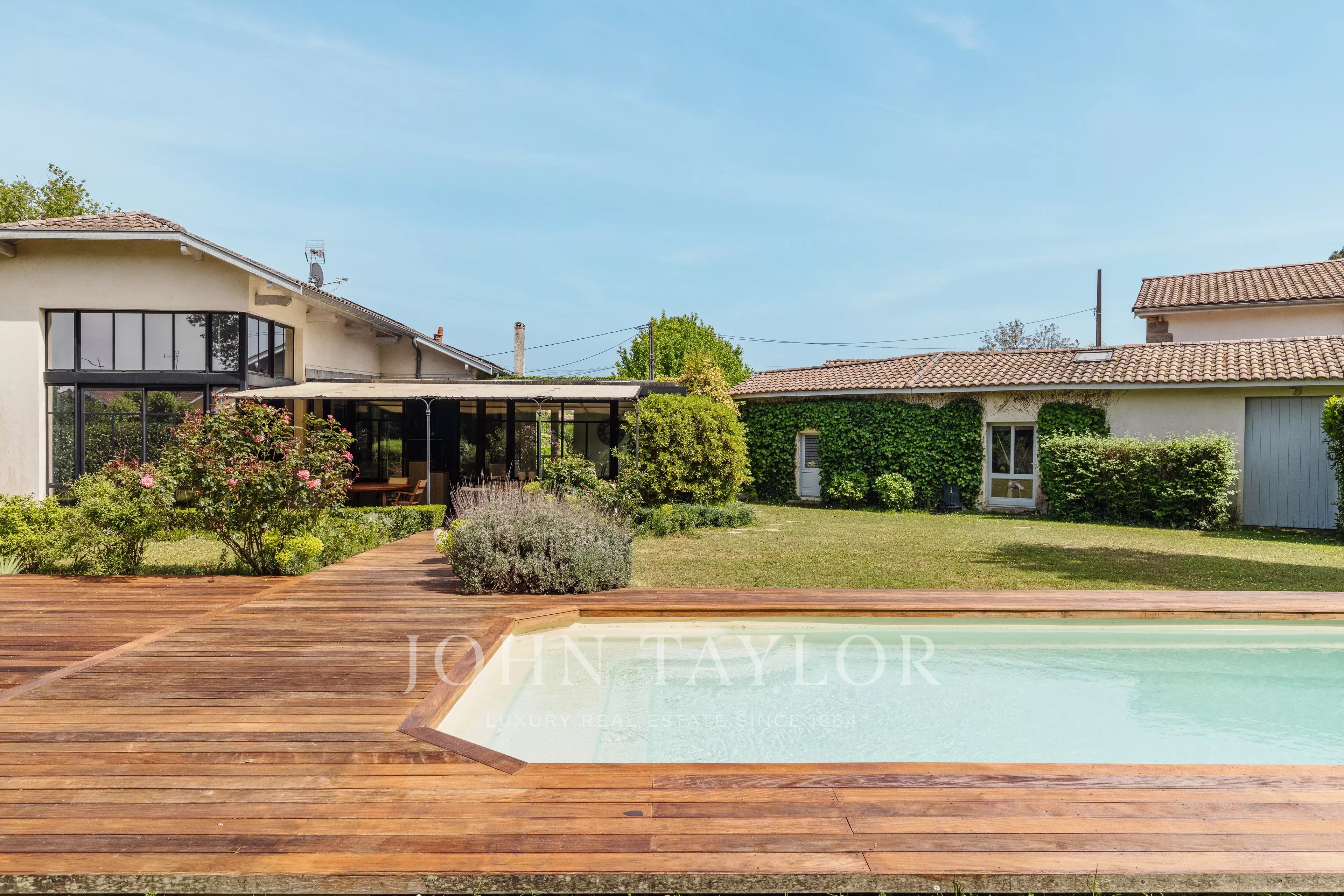 Esta antiga casa de viticultor de estilo arcachonnais desenvolve, entre a casa principal e suas dependências, cerca de 238 m² habitáveis no coração de um belo terreno arborizado de 1900 m² com piscina. Renovada com cuidado, combina o charme do antigo com o conforto moderno.