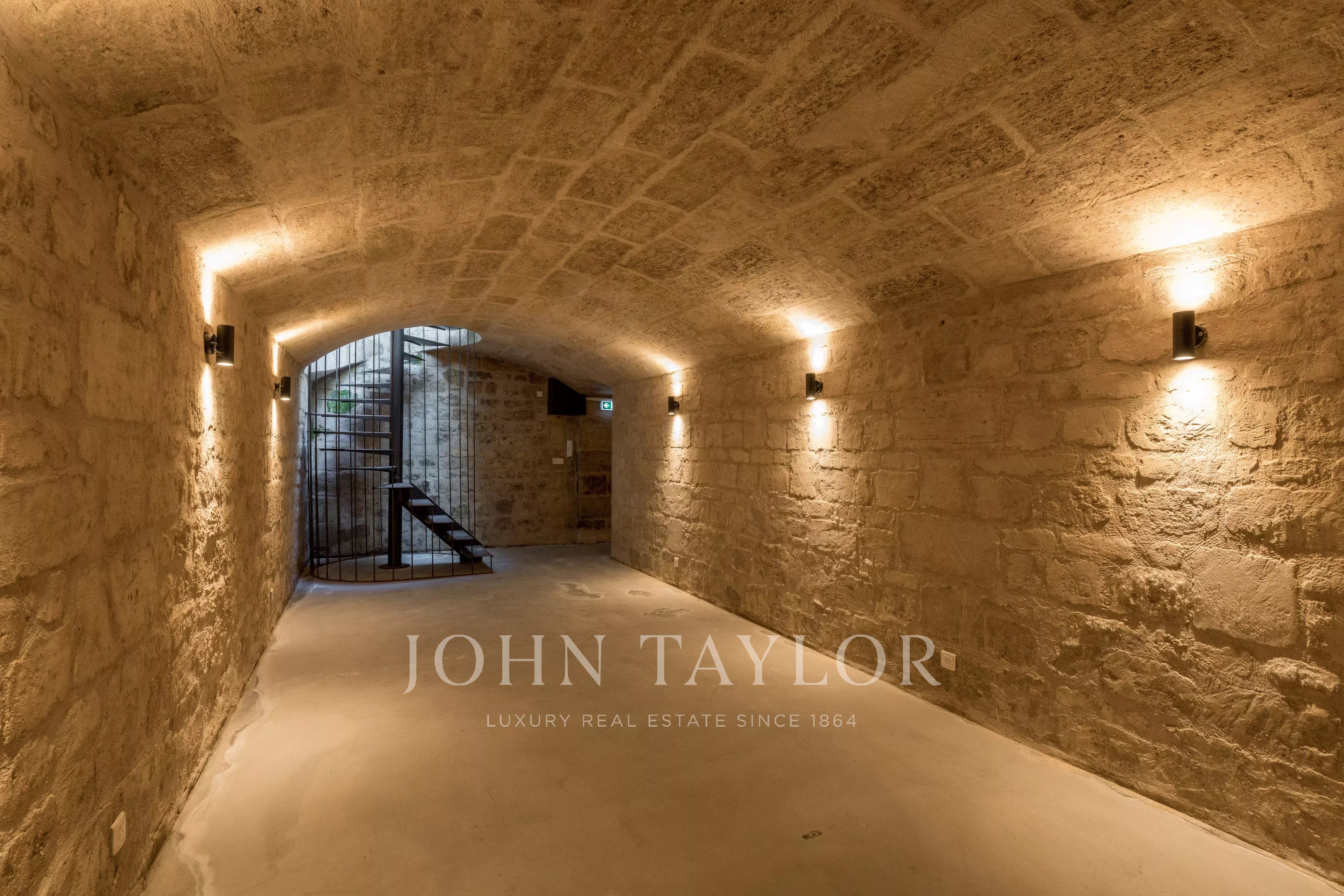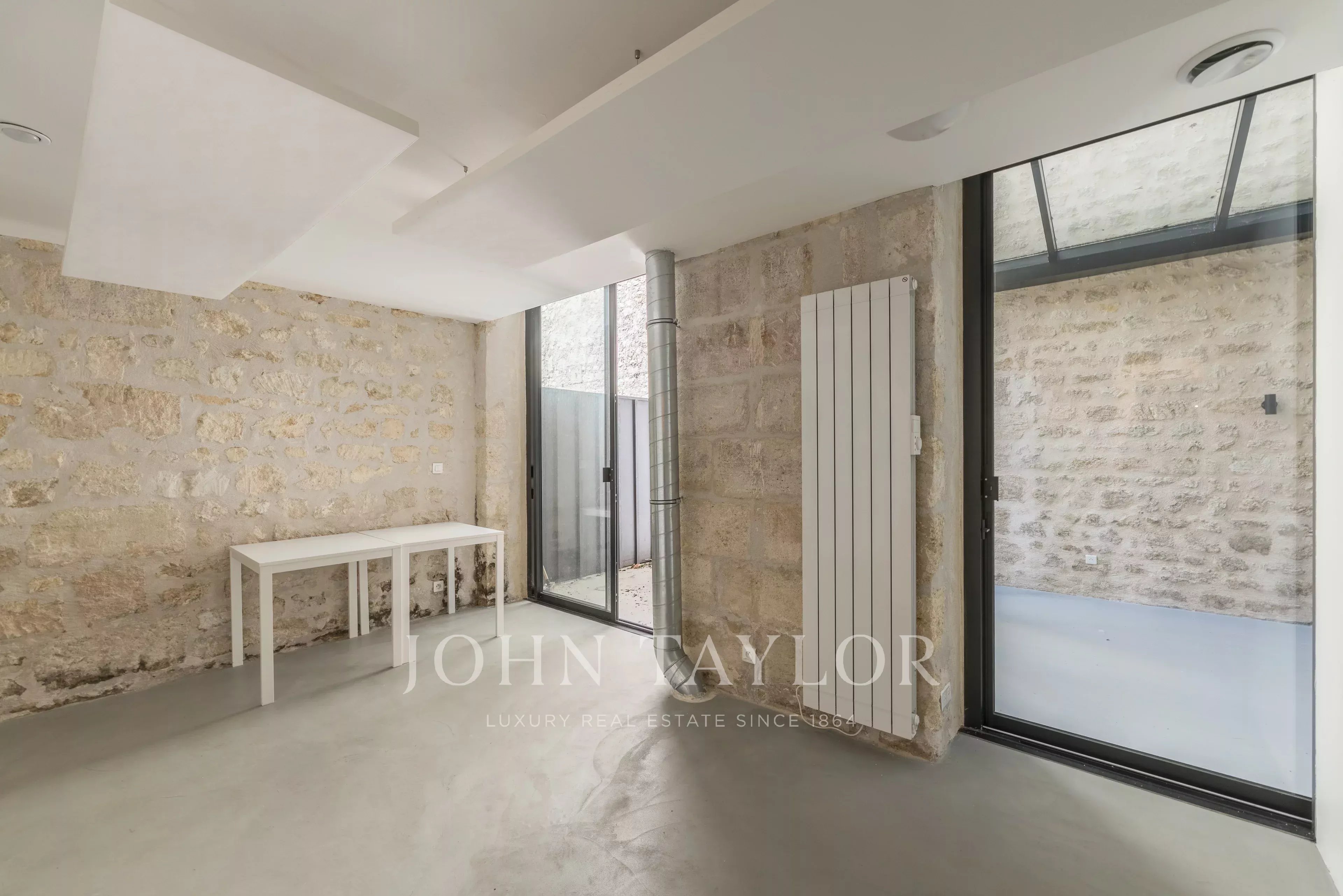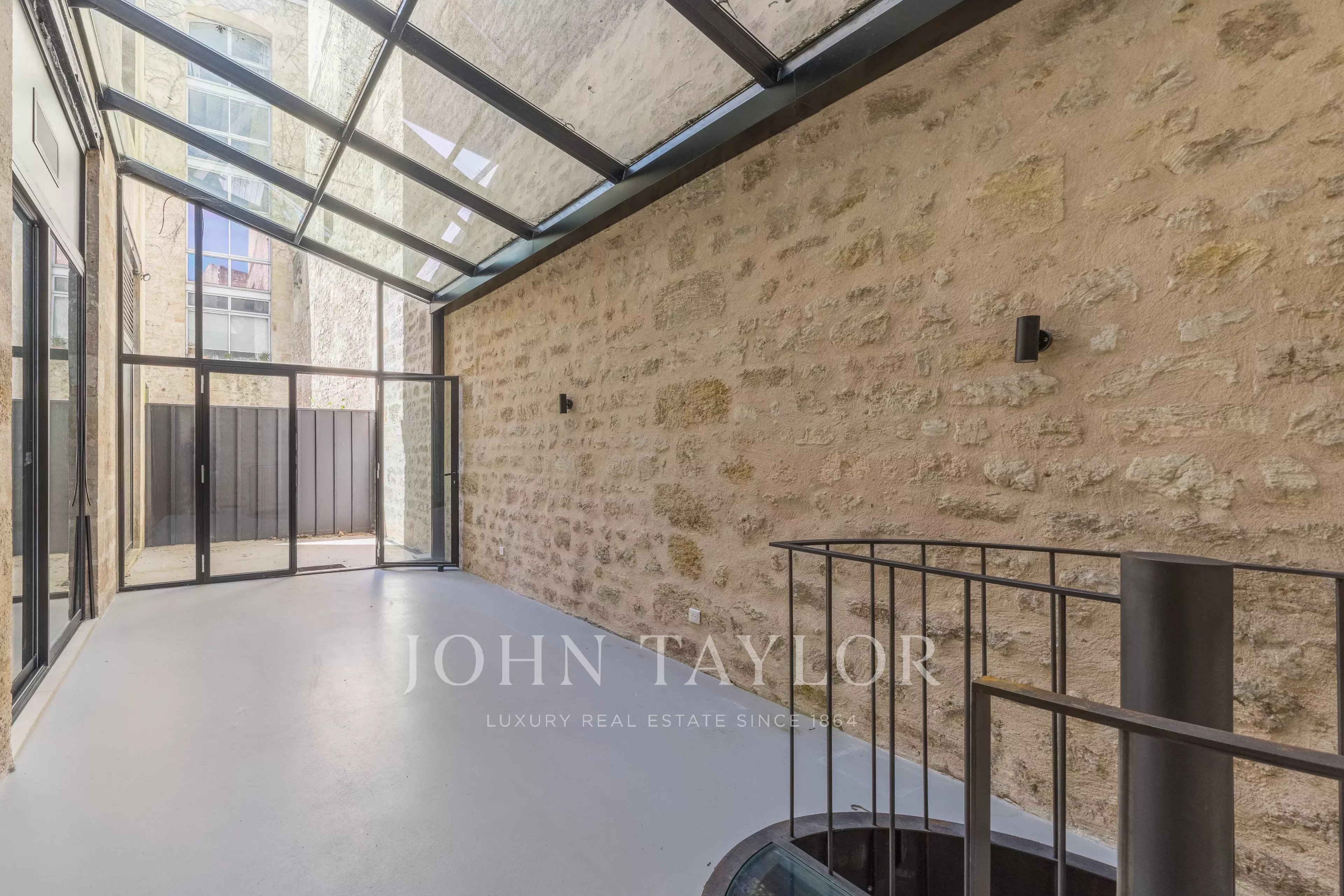Térreo completamente bem distribuído e organizado em várias áreas distintas. Oferece espaços de trabalho, incluindo uma grande sala sob um teto de vidro que traz luz e carácter, além de um pátio privativo agradável, uma verdadeira vantagem no coração da cidade. No subsolo, uma sala abobadada de 55 m² cheia de charme, ideal para um espaço de relaxamento ou recepção.