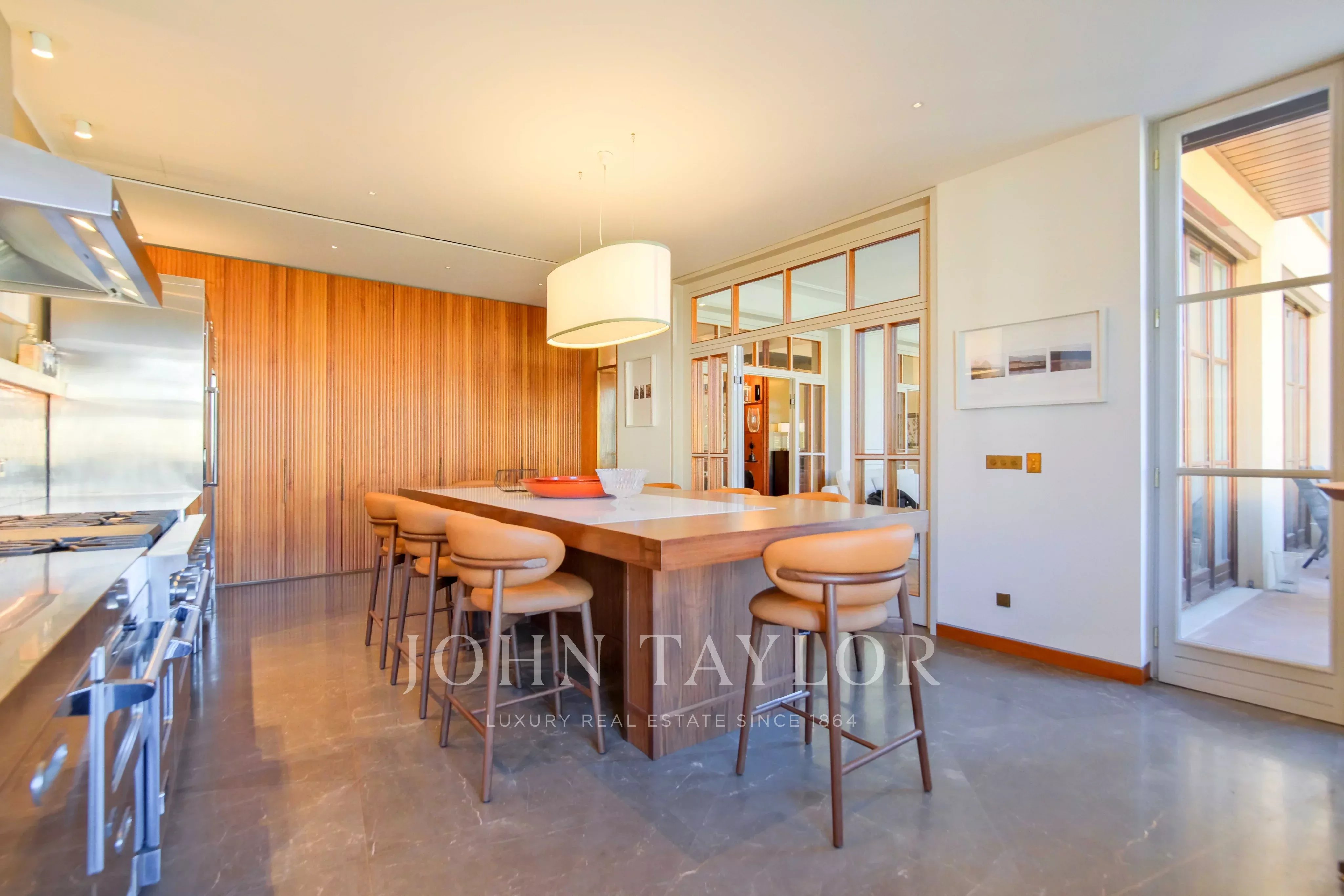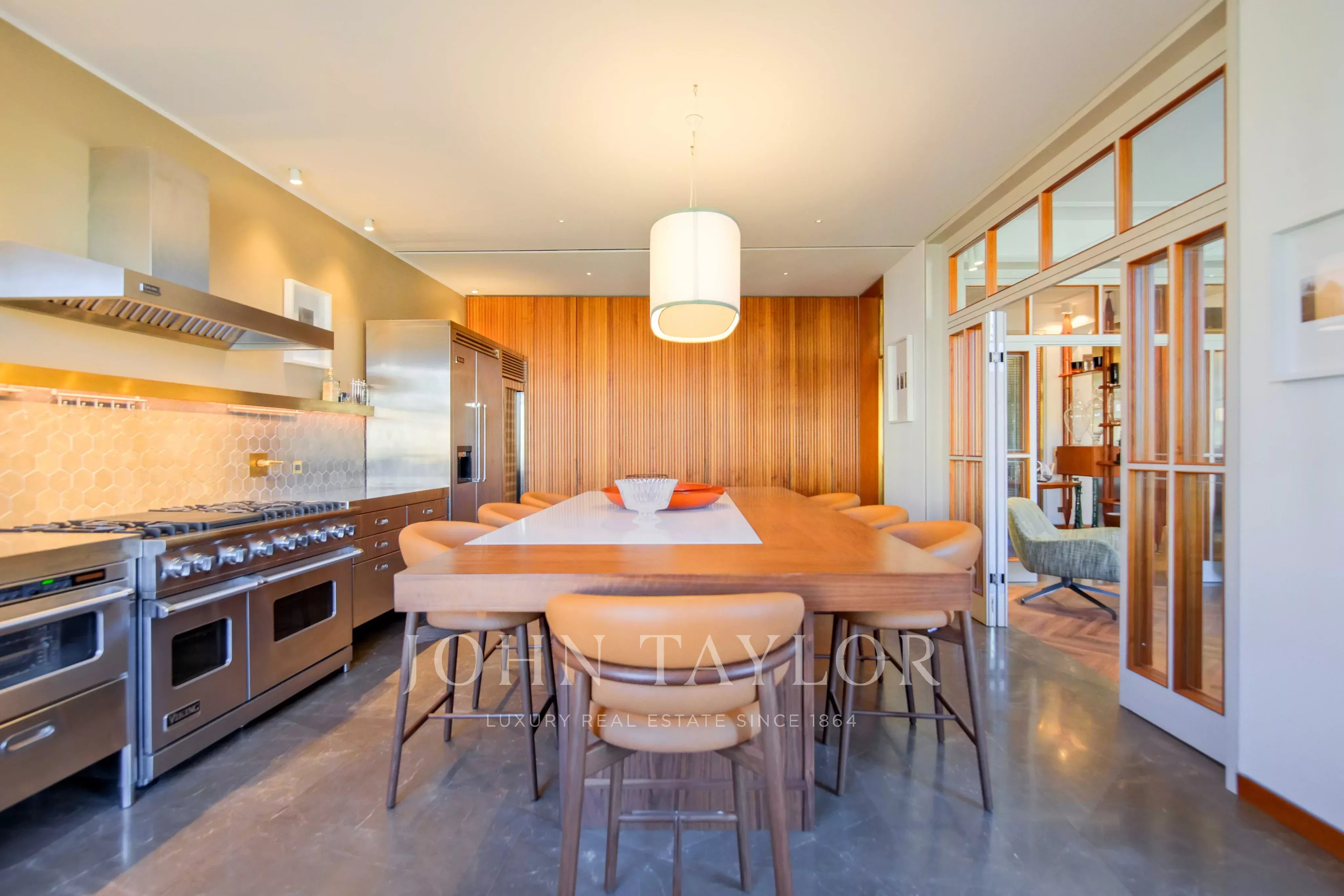 A cozinha distingue-se por uma estrutura de latão e teca feita à medida que envolve a mesa de pequeno-almoço, perfeitamente posicionada para desfrutar de uma vista evocativa da Galeria Uffizi, transformando a vida quotidiana numa experiência de rara atmosfera.