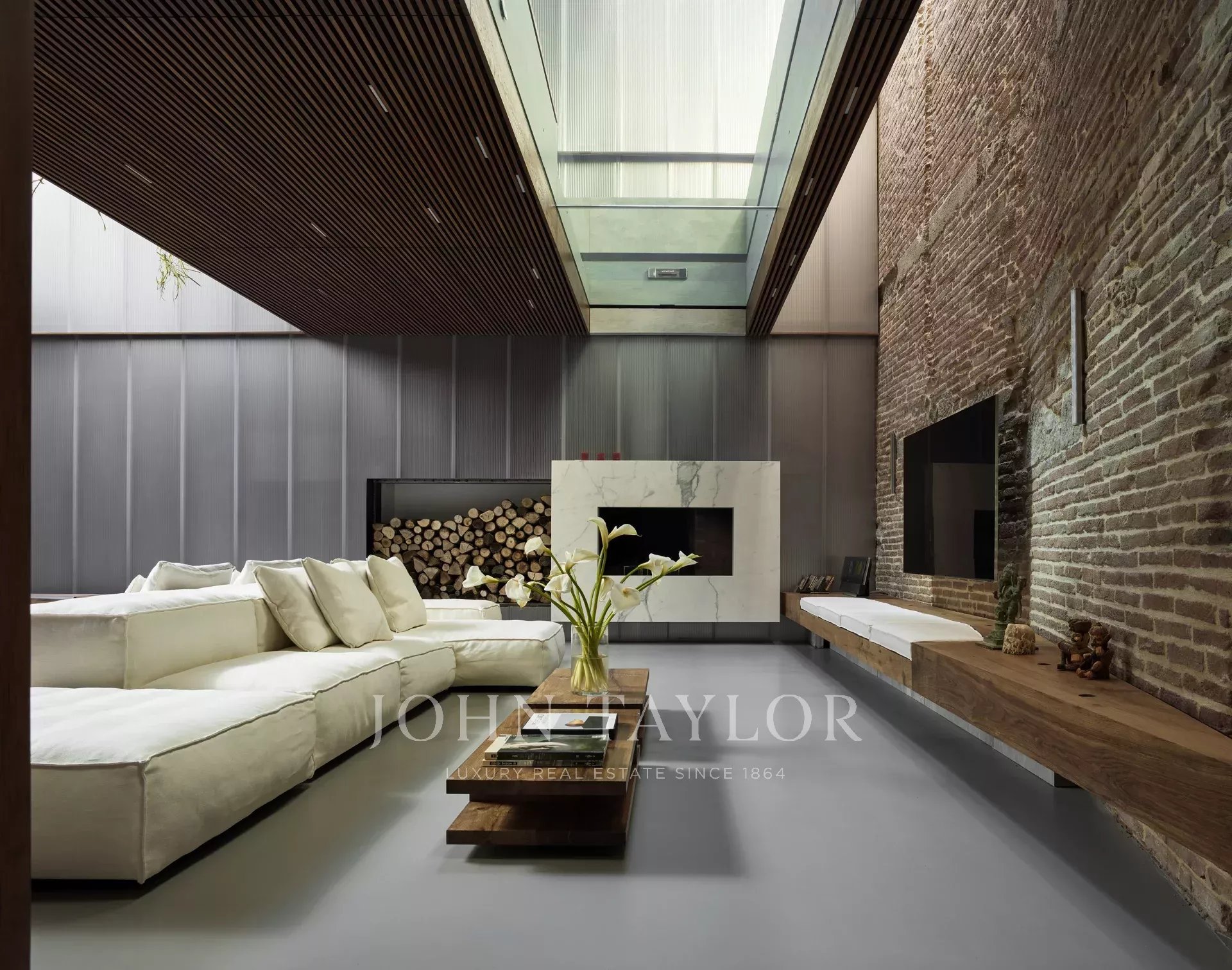 A sala de estar em plano aberto, com três alturas, apresenta mobiliário de design personalizado e uma lareira, criando um ambiente convidativo.