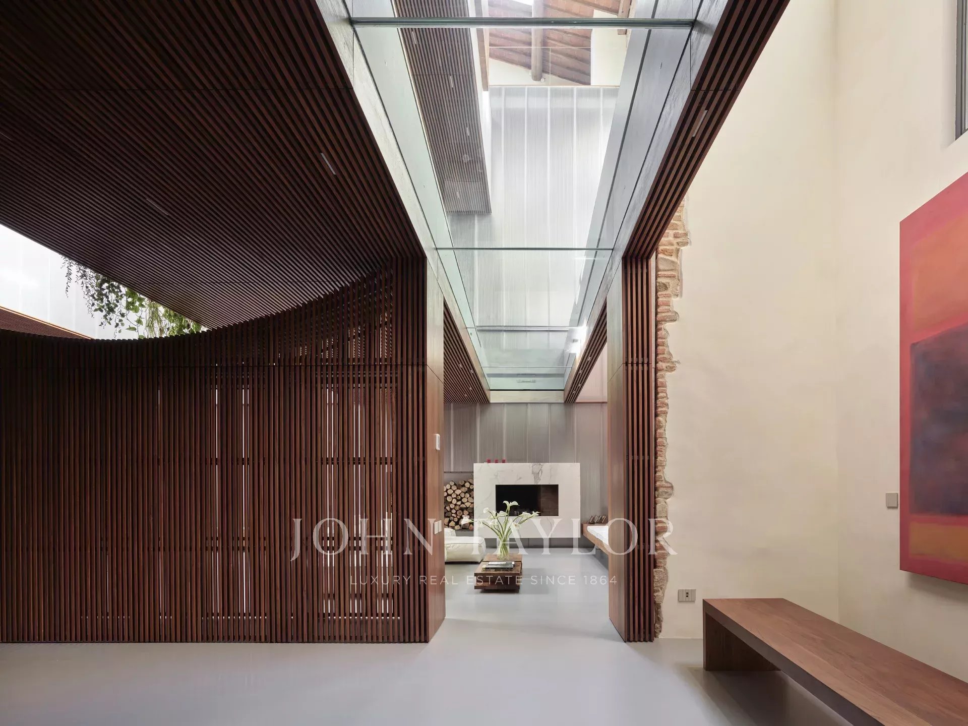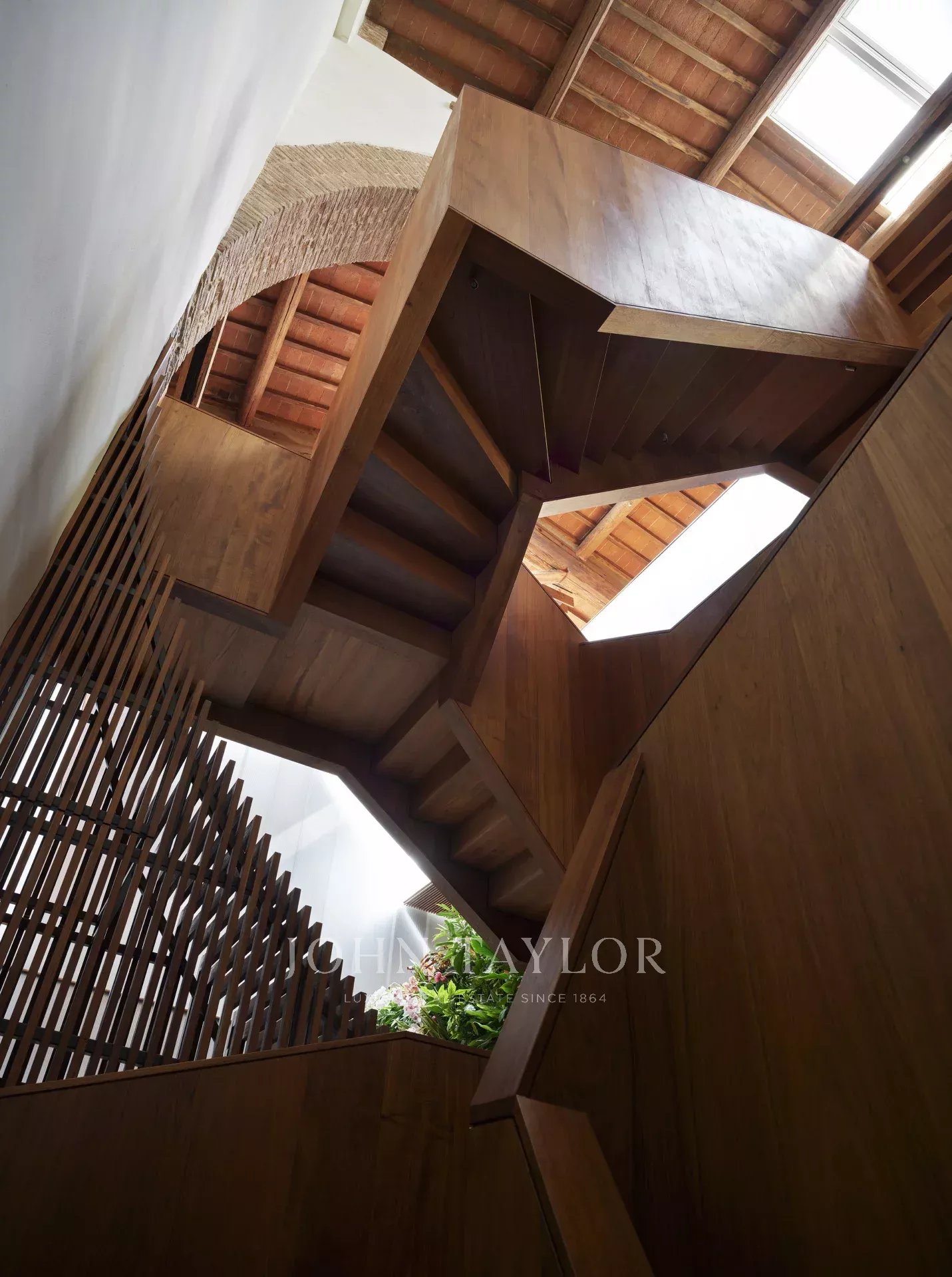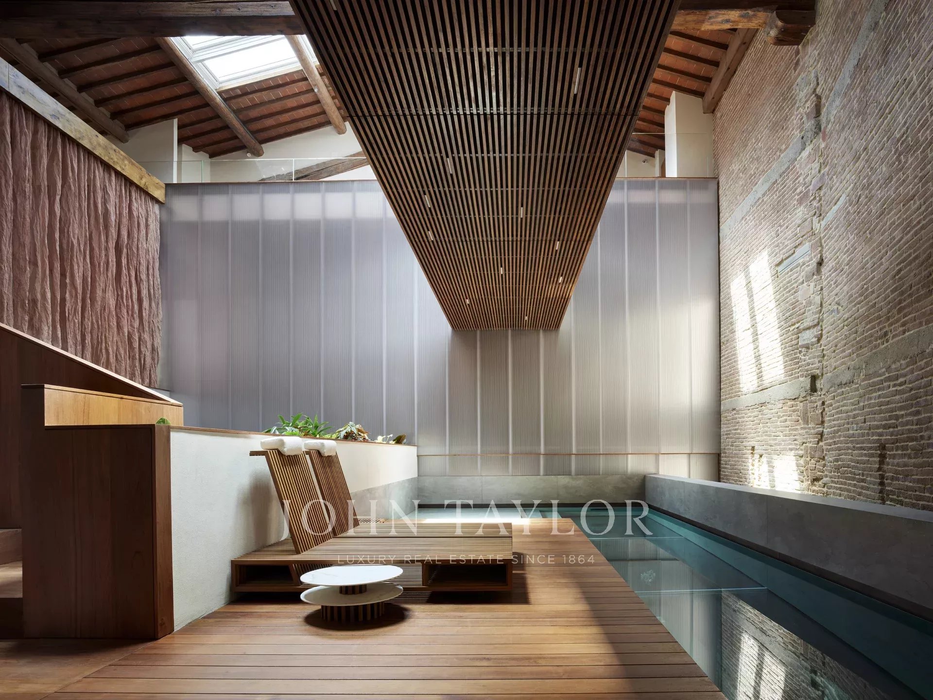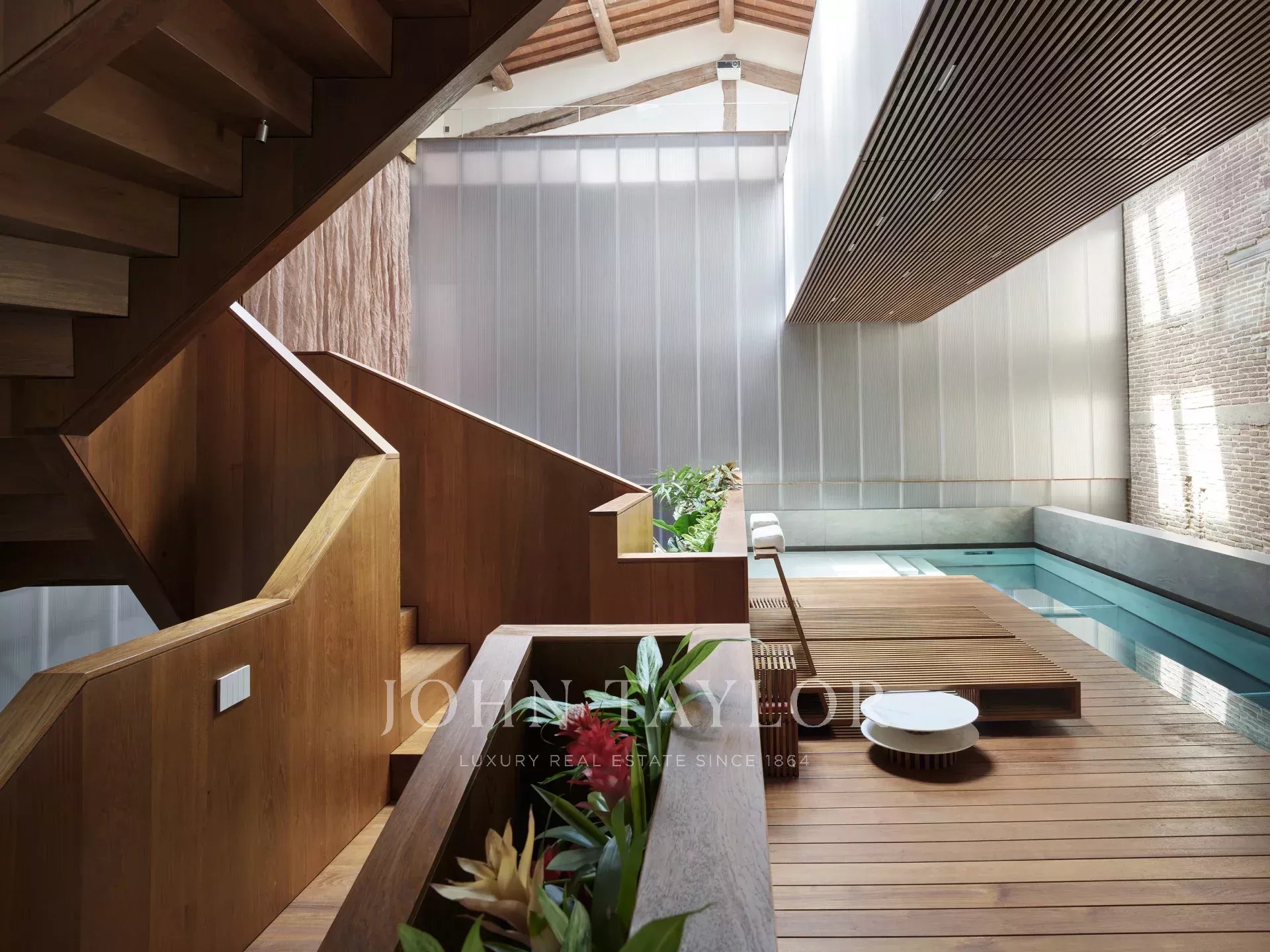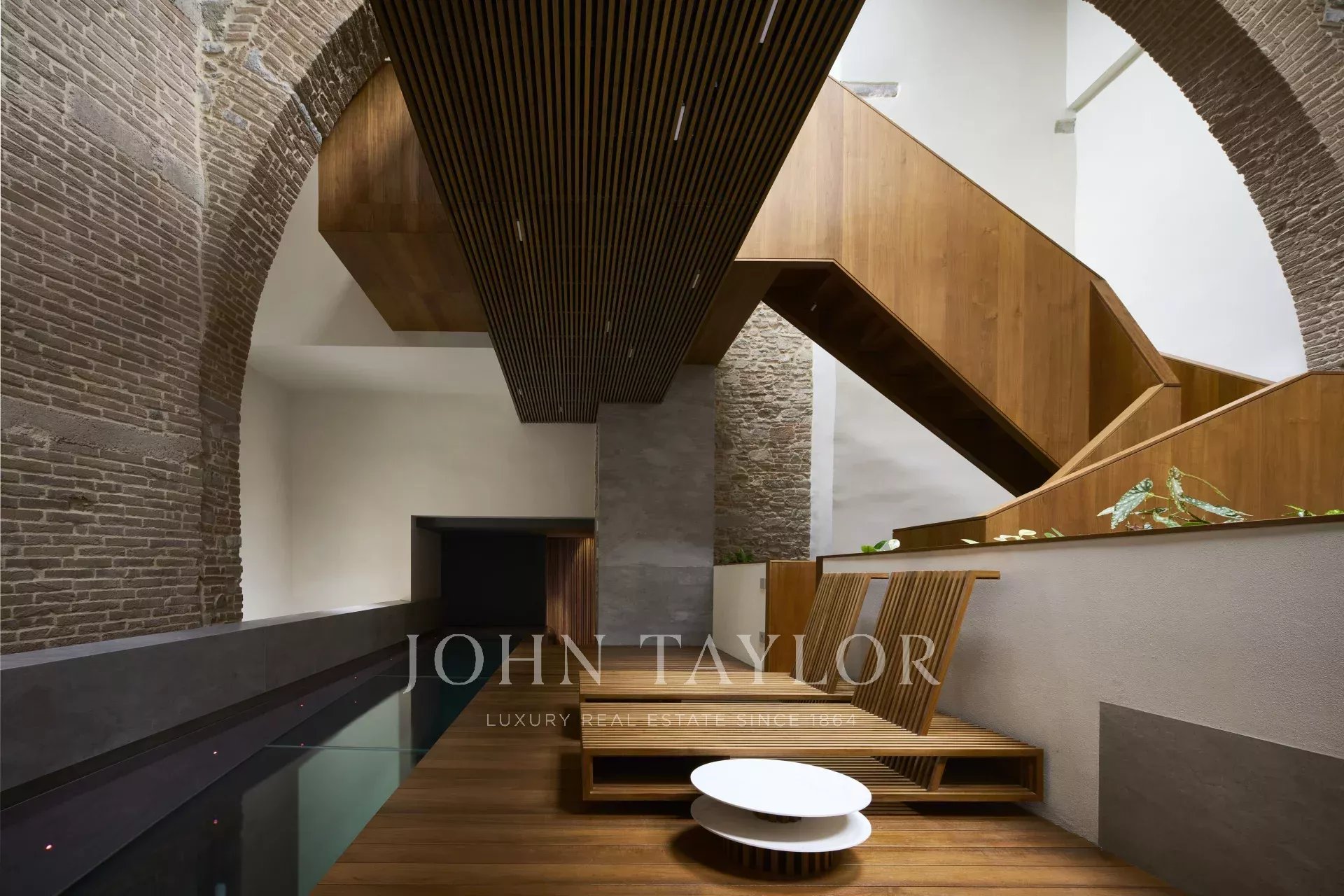 A subida da escadaria central em madeira revela um espaço aberto excecional com vista para o rés do chão. No primeiro andar, uma imponente piscina interior com um chão de vidro e a sua própria área de relaxamento oferece um ambiente sereno e cheio de luz. A piscina está ligada a uma área de fitness equipada com sauna turca, casa de banho e ginásio.