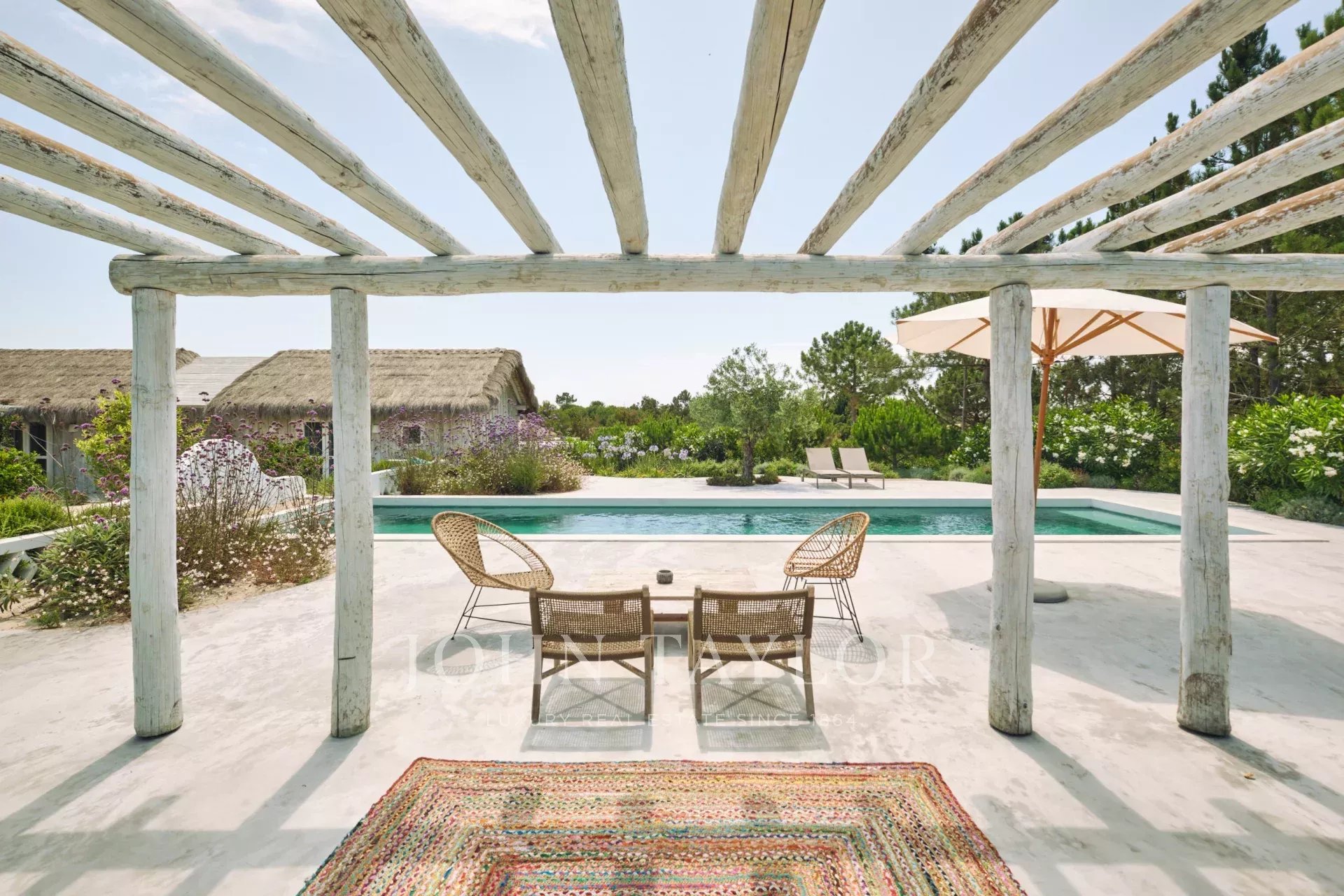 Nos dias quentes, refresque-se na piscina inspirada nos antigos tanques alentejanos, aproveite as pérgulas para relaxar ou para refeições ao ar livre, partilhadas em boa companhia e ao ritmo tranquilo da Comporta.