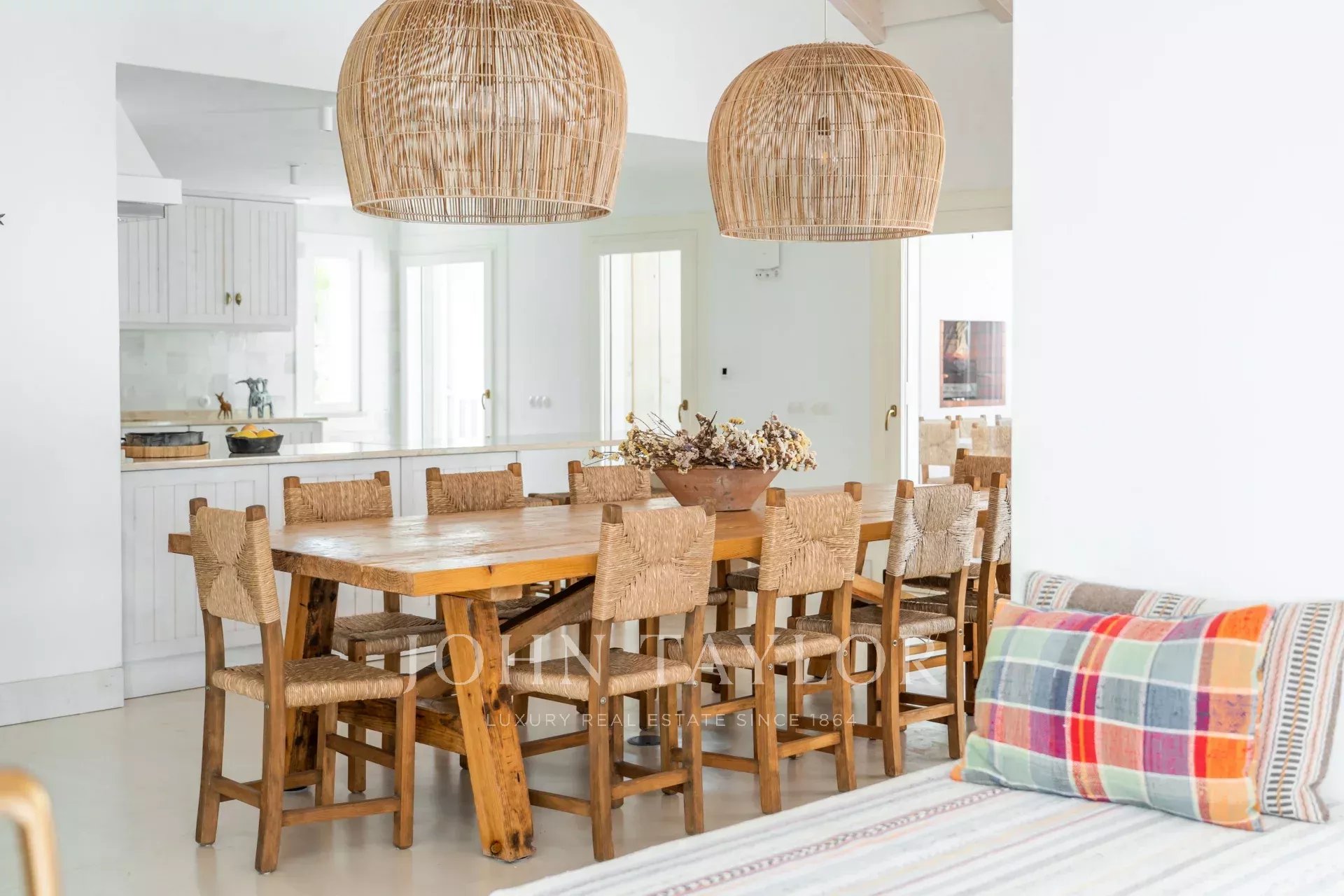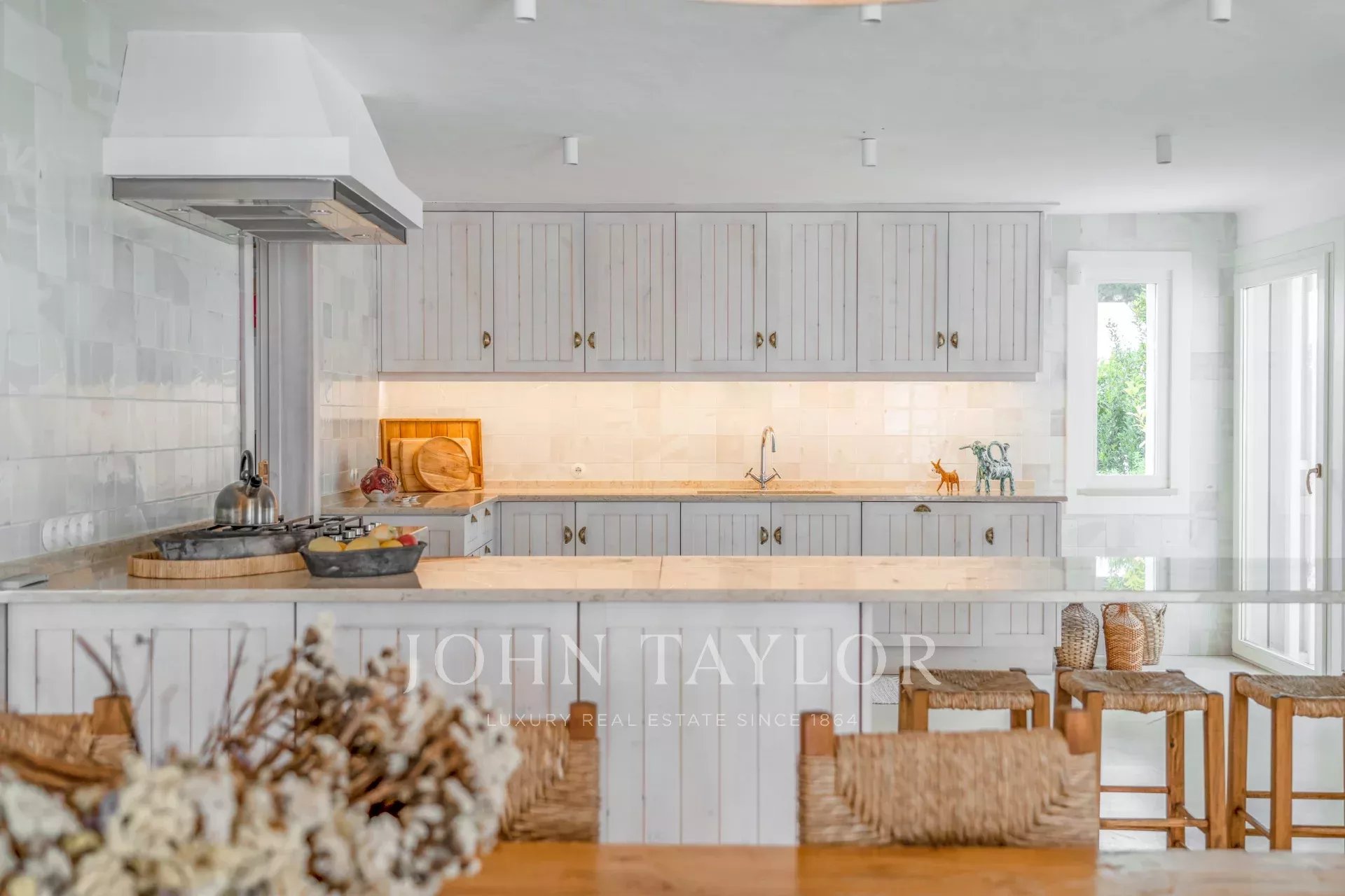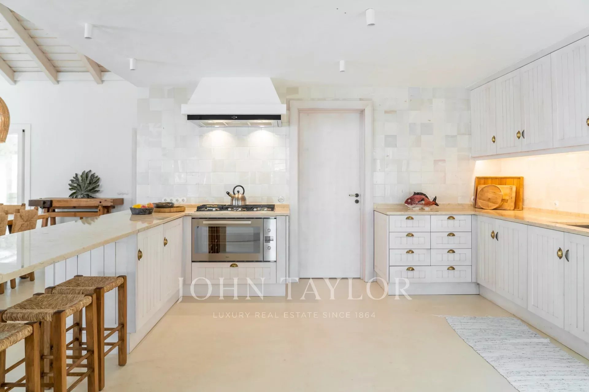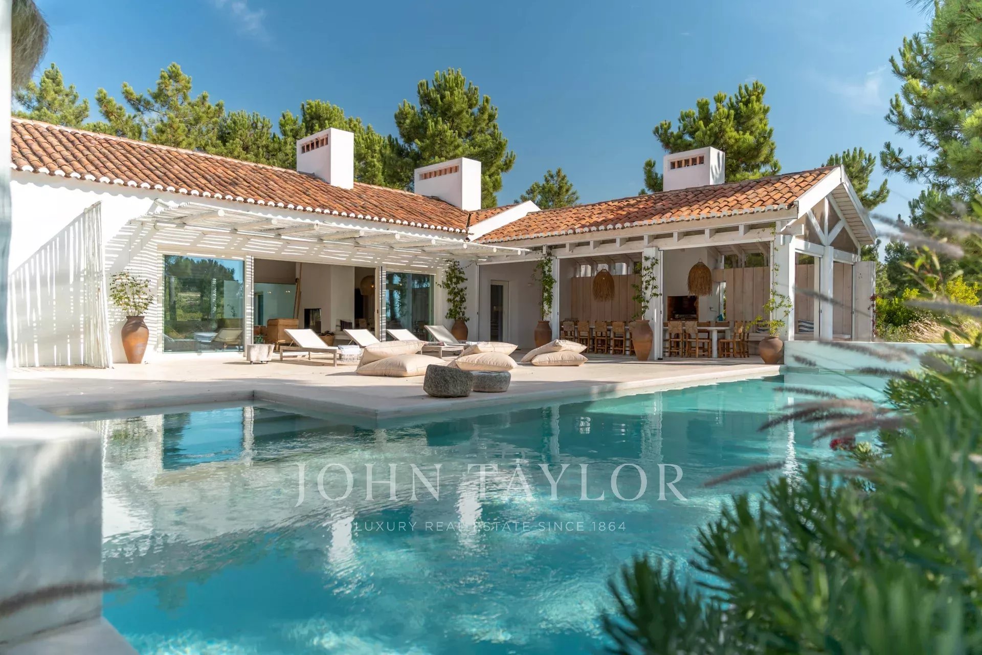 Os espaços interiores estendem-se naturalmente para o exterior, num ambiente acolhedor e descontraído. A cozinha totalmente equipada abre-se para o alpendre e para a zona de refeições ao ar livre, ideal para longos jantares de verão.