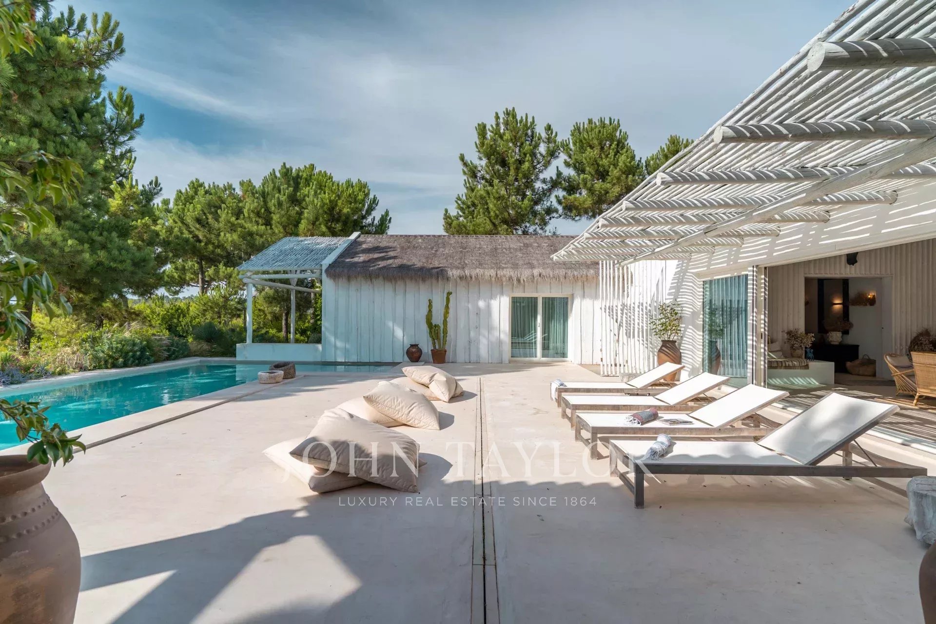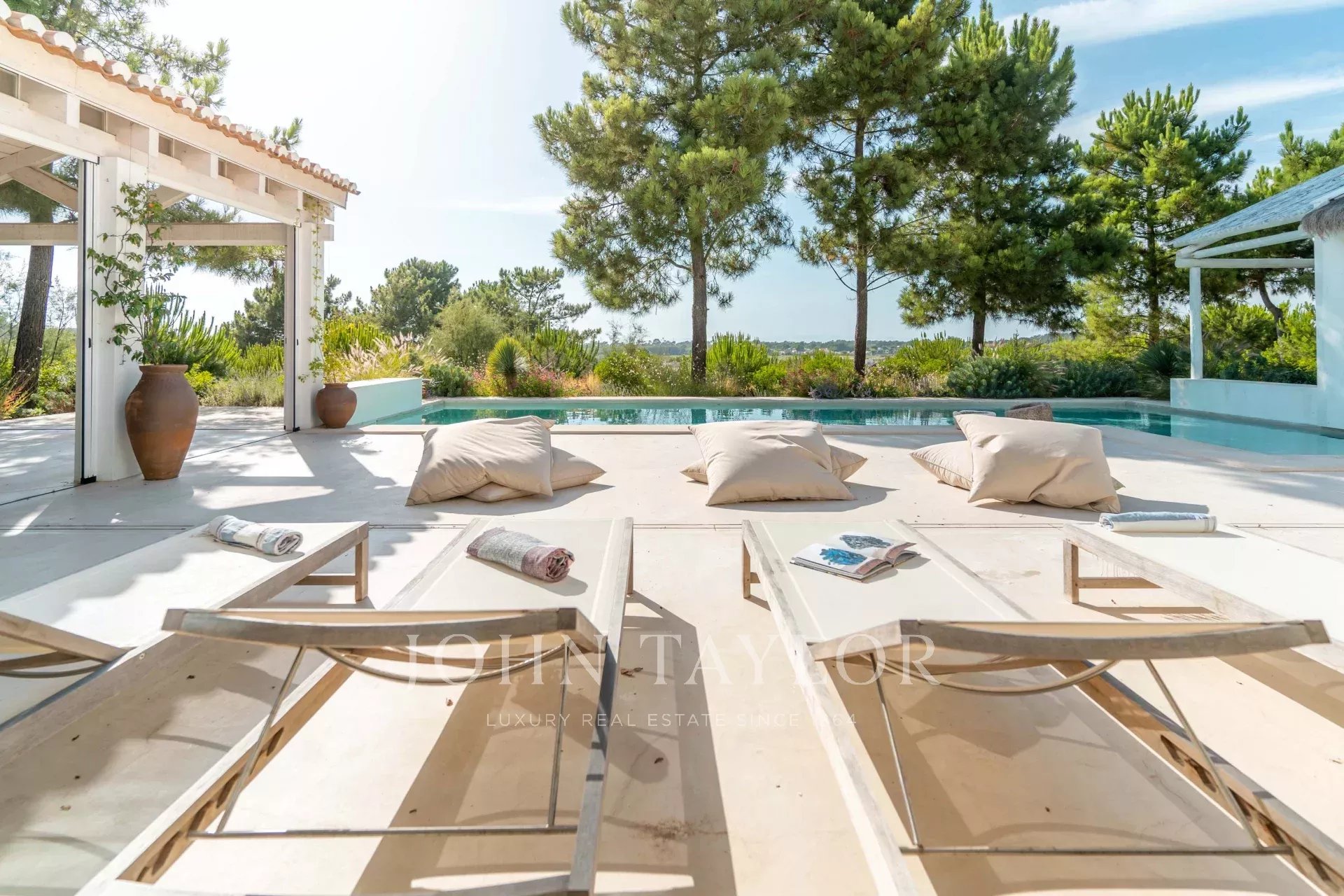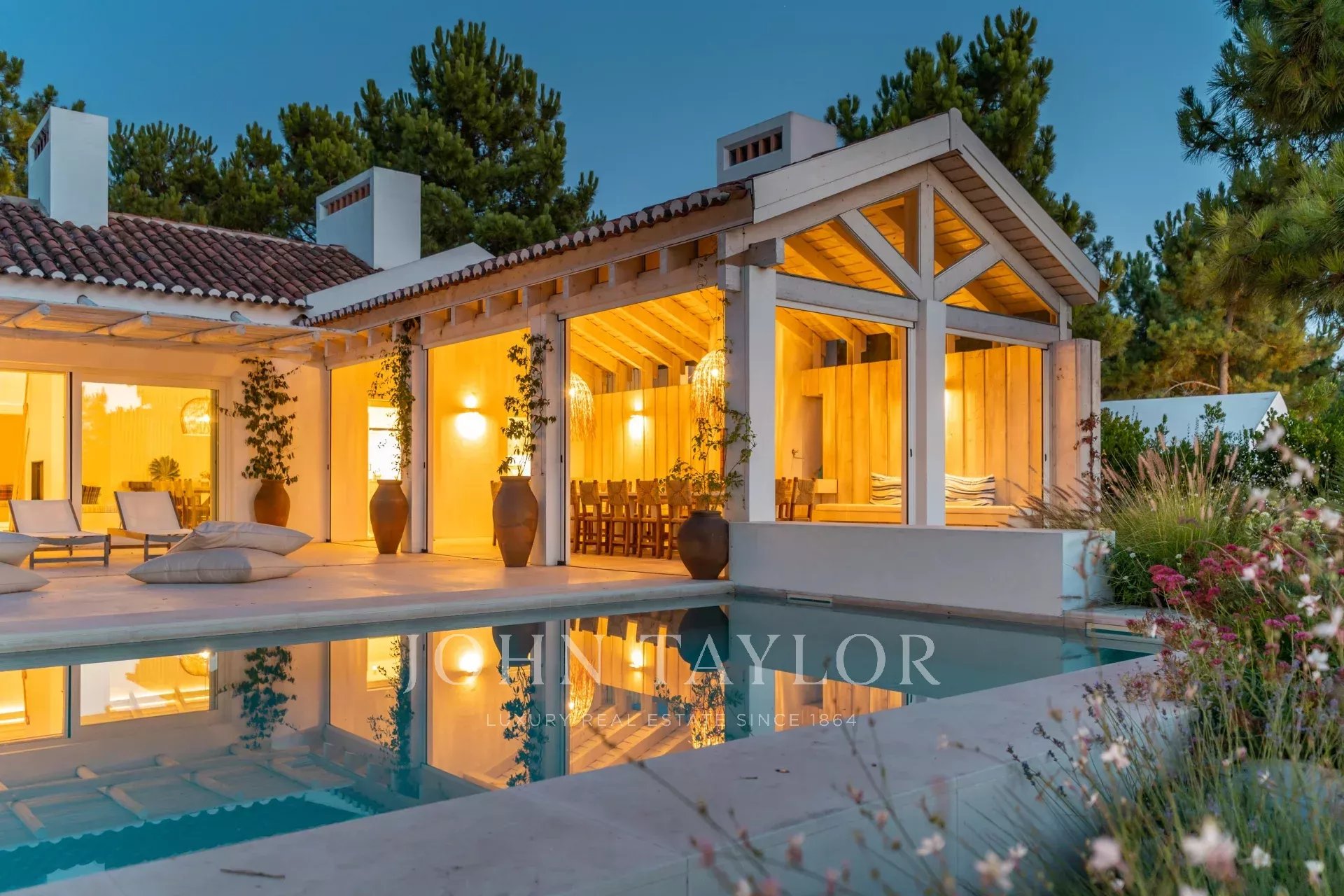 O jardim vedado assegura total privacidade e integra-se em harmonia com a paisagem. A piscina e o terraço com zona lounge convidam a apreciar a tranquilidade dos fins de tarde.