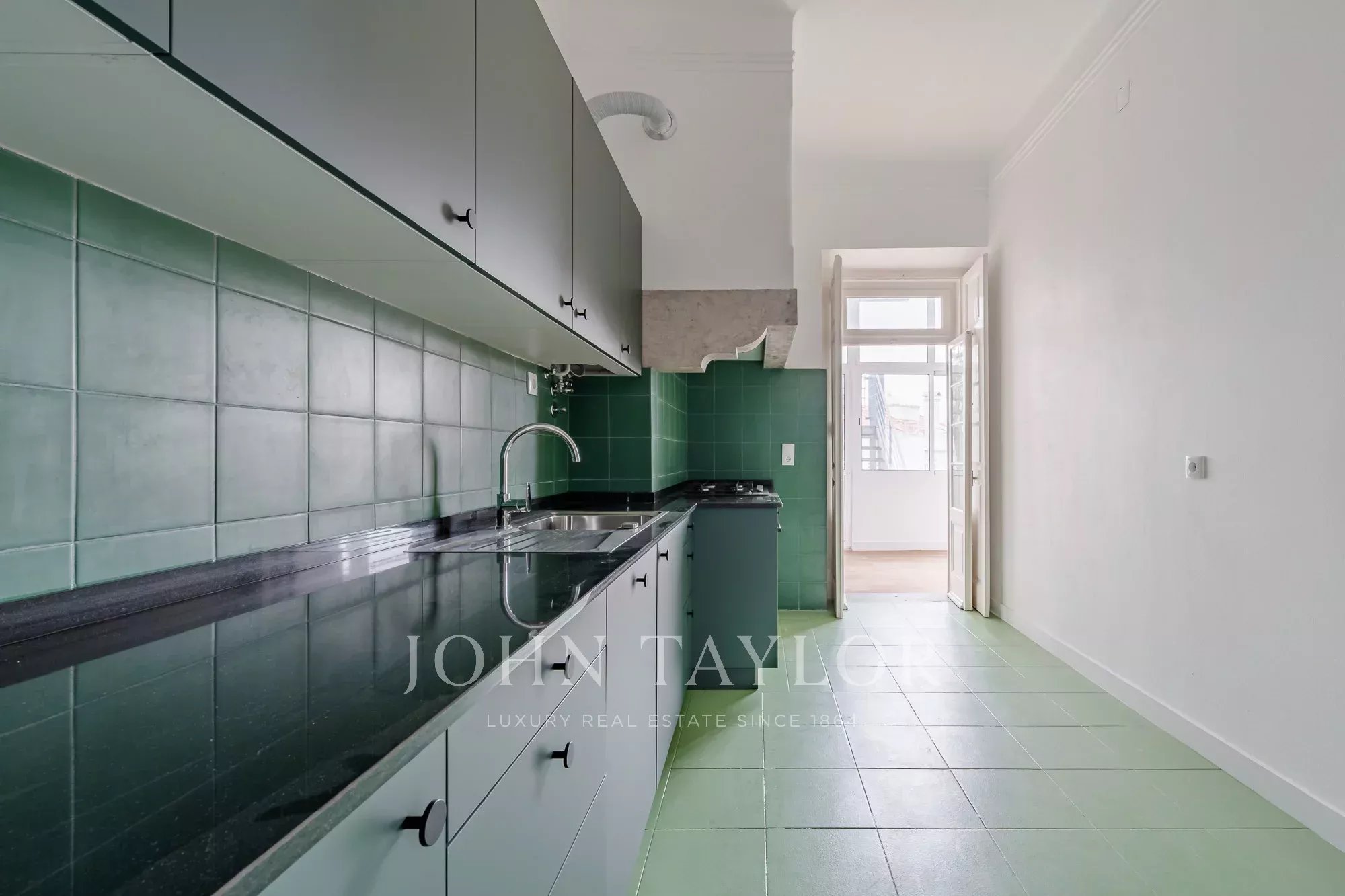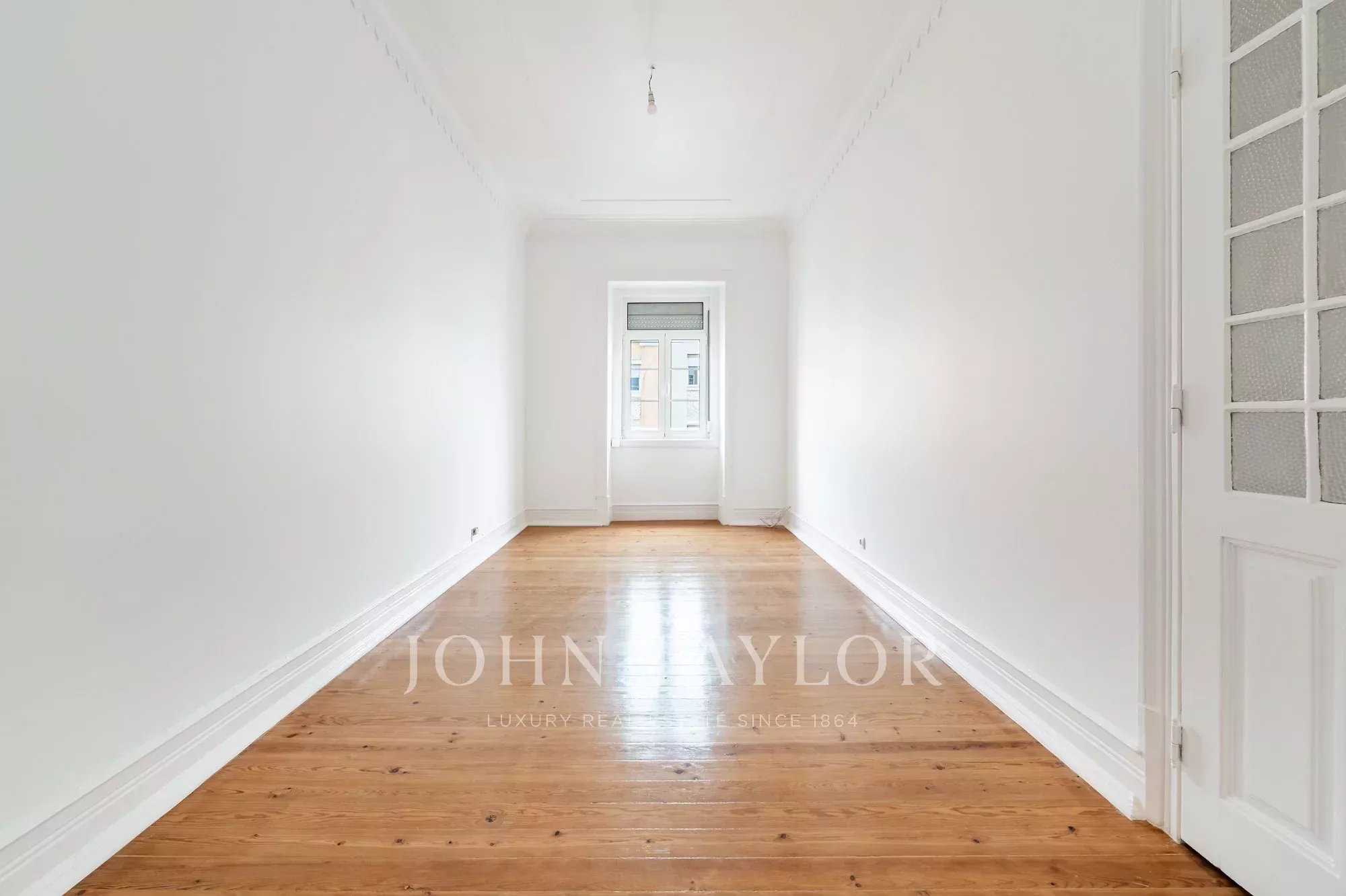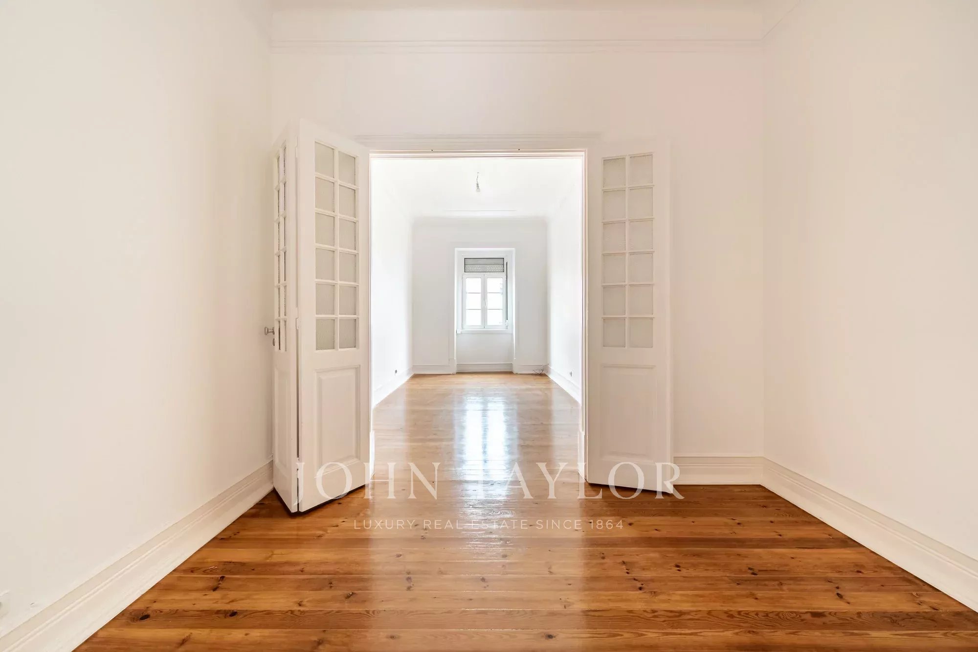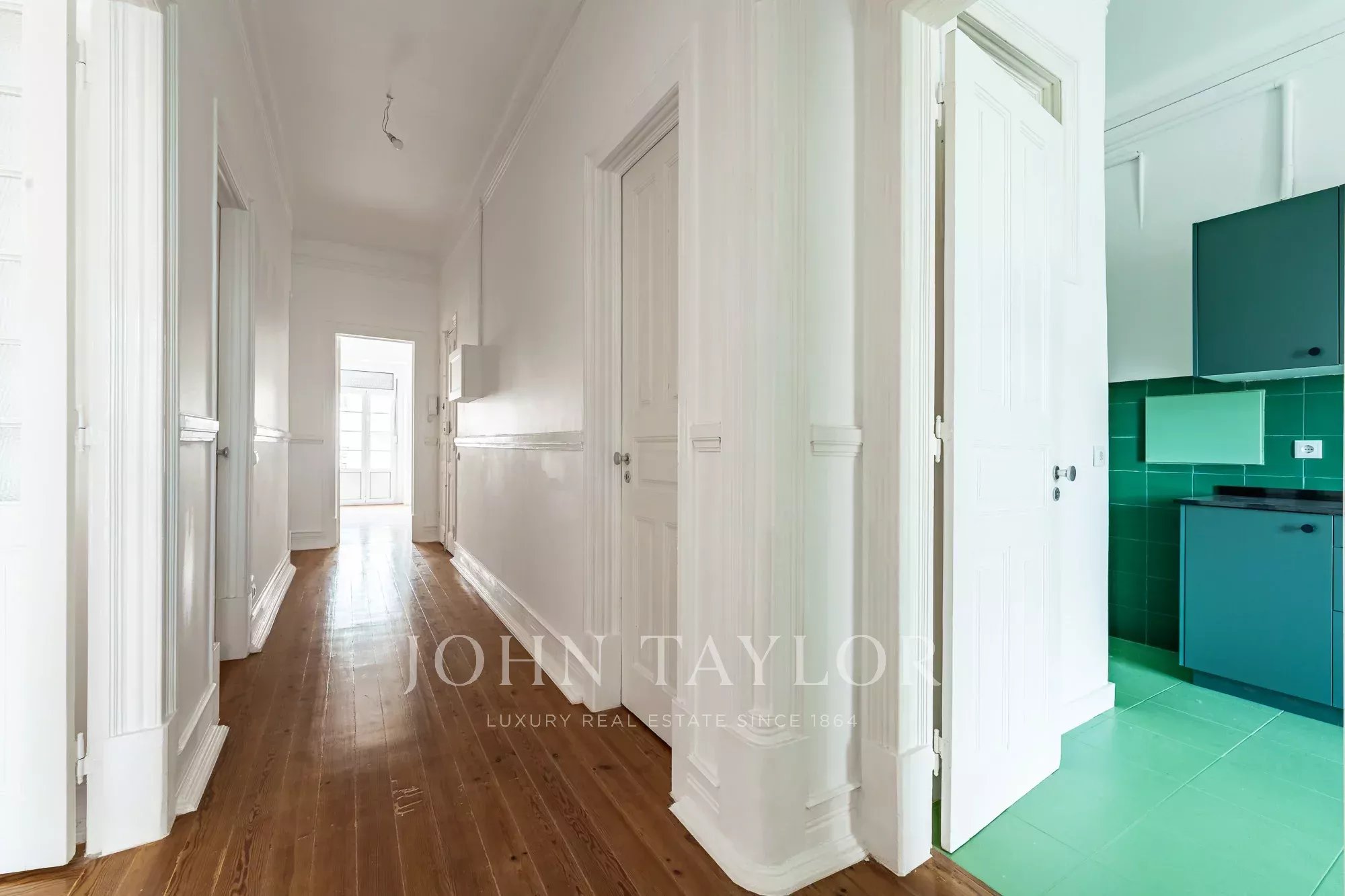 Os pavimentos em madeira envernizada, os tetos altos com 3,20 m e frisos decorativos conferem-lhe um charme clássico e acolhedor, complementado pela cozinha semi-equipada com pavimento em mosaico.