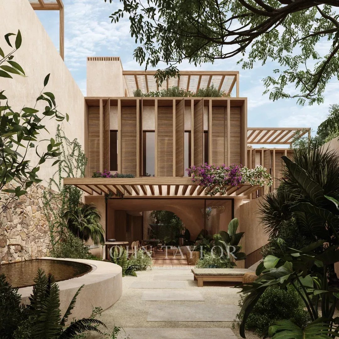 Cada uma das sete moradias conta com quatro suites espaçosas e cerca de 260 m² de área interior, complementados por jardim privado, piscina e terraço, criando um ambiente acolhedor e reservado.