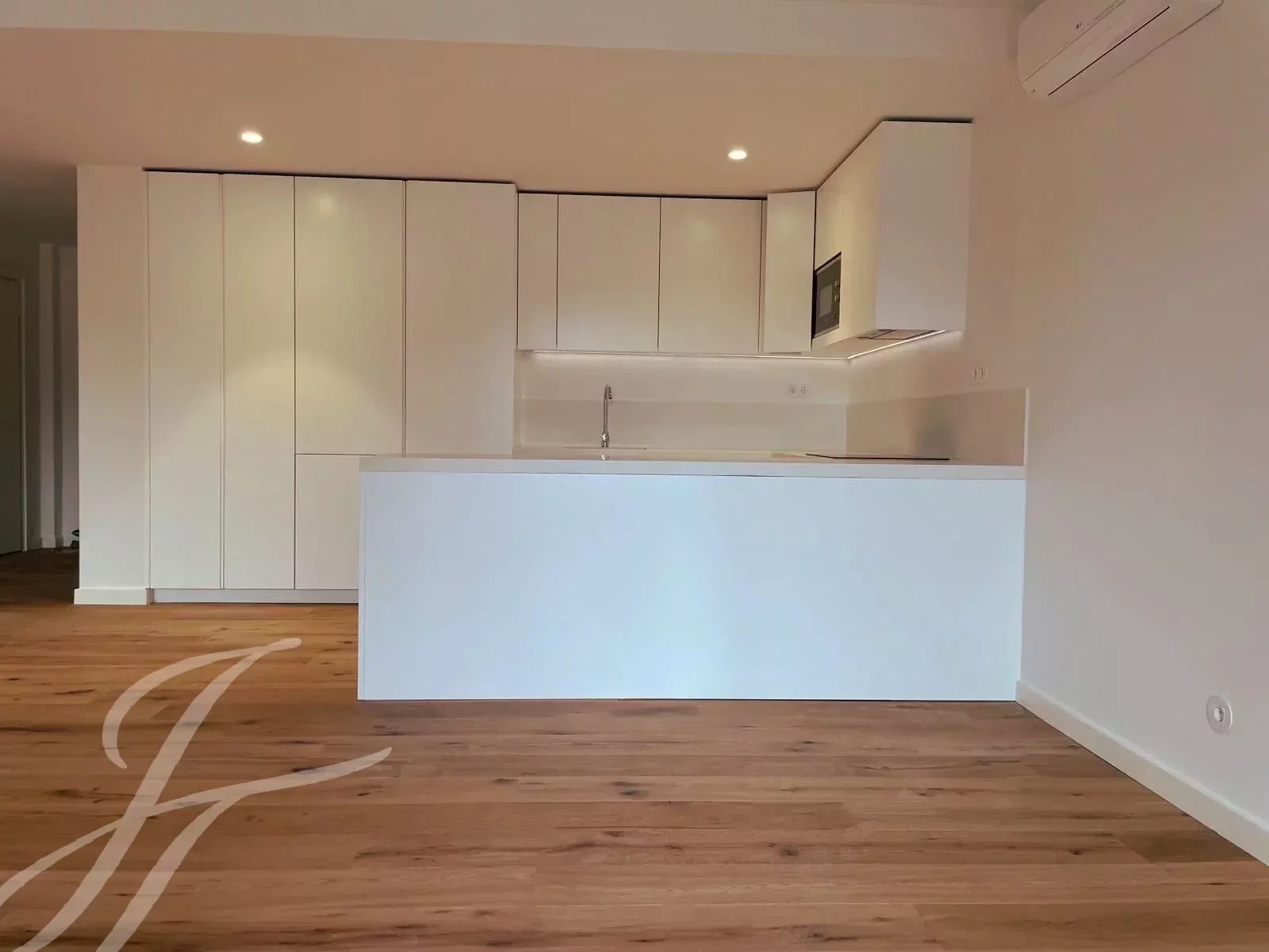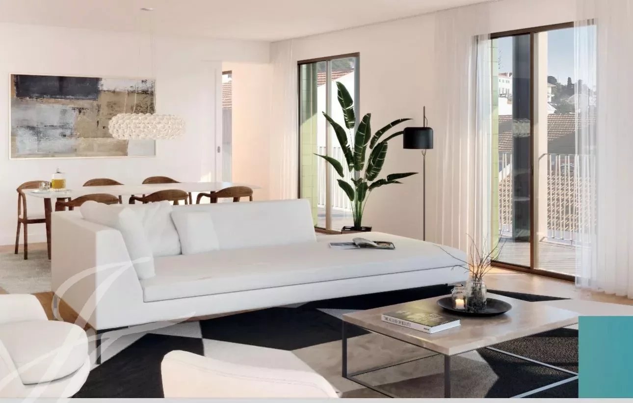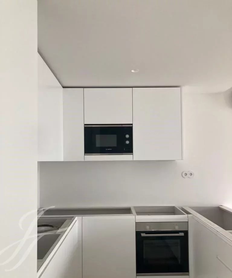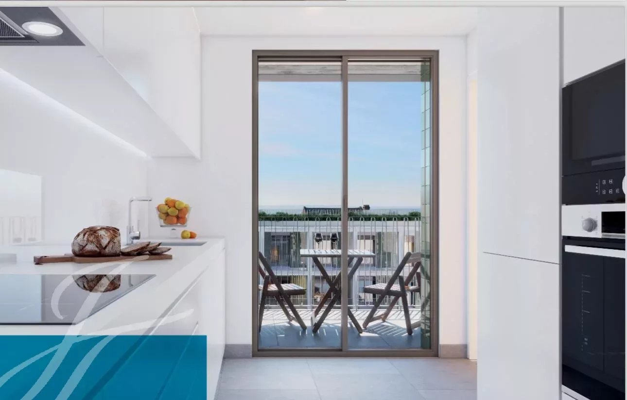 A tipologia do apartamento oferece uma espaçosa sala de estar, uma moderna cozinha aberta totalmente equipada com electrodomésticos Bosch encastrados (frigorífico, forno, máquina de lavar roupa, máquina de lavar louça e micro-ondas).