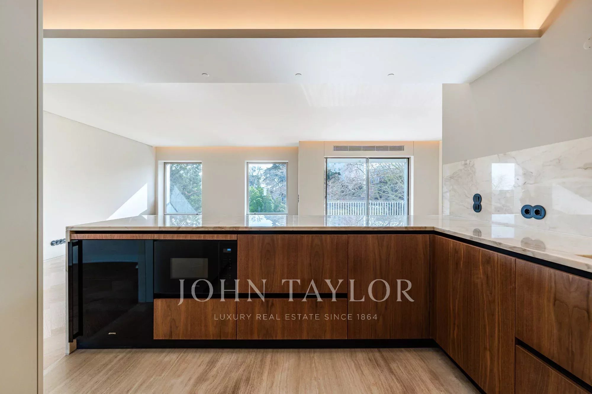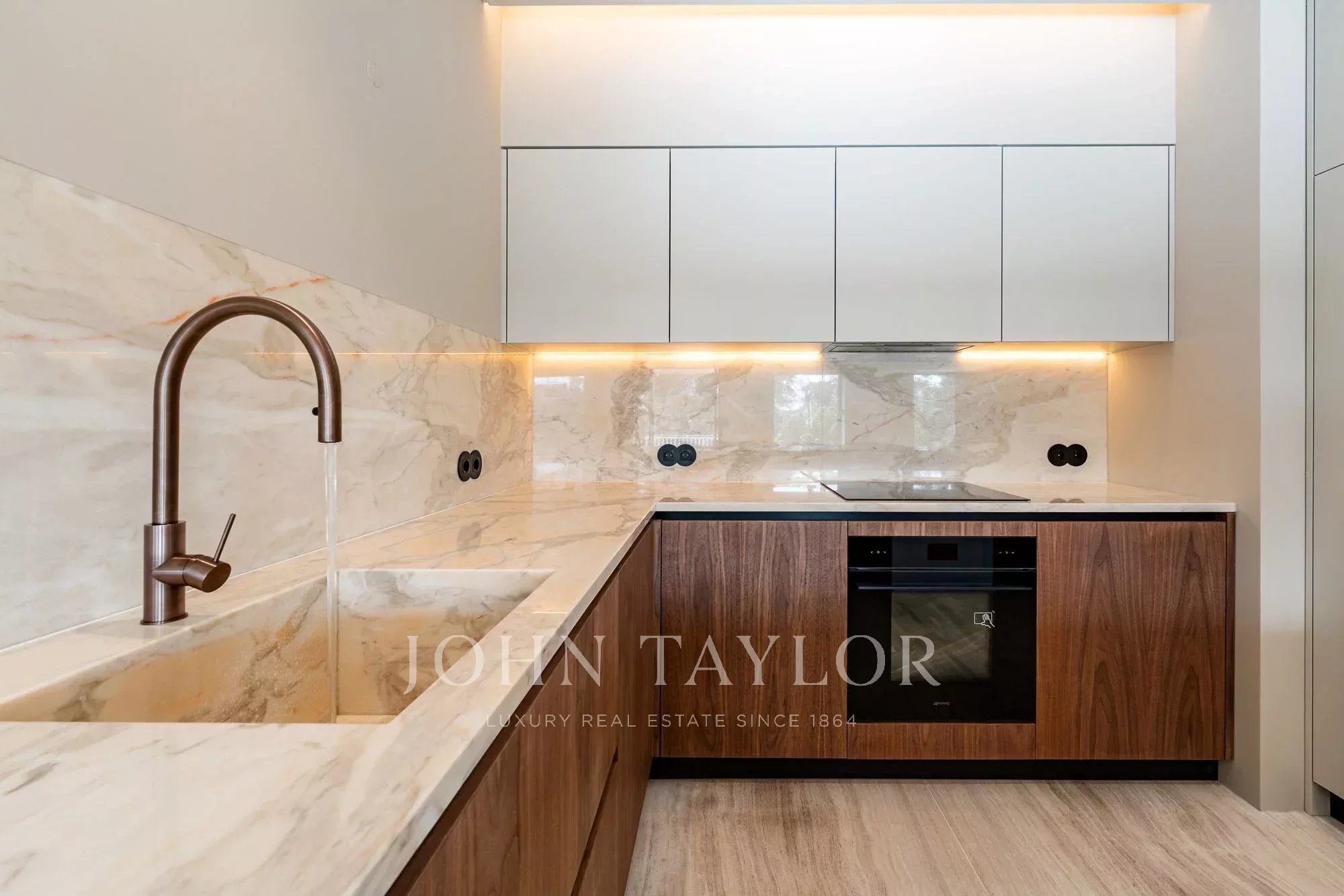Concebida com linhas simples e contemporâneas, a cozinha está equipada com electrodomésticos SMEG integrados, garantindo uma excelente qualidade e desempenho. A iluminação LED integrada sob os armários superiores e no teto realça os materiais e cria uma atmosfera moderna e requintada, tornando o espaço elegante e altamente funcional para a vida quotidiana.