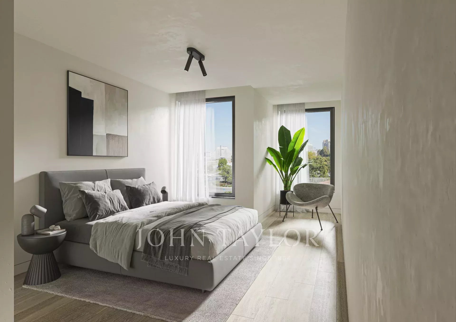 Neste apartamento T2 com 112,1 m2 de área bruta entramos numa sala com grandes janelas e cozinha open space. Ainda neste piso encontramos as duas suites com closet.