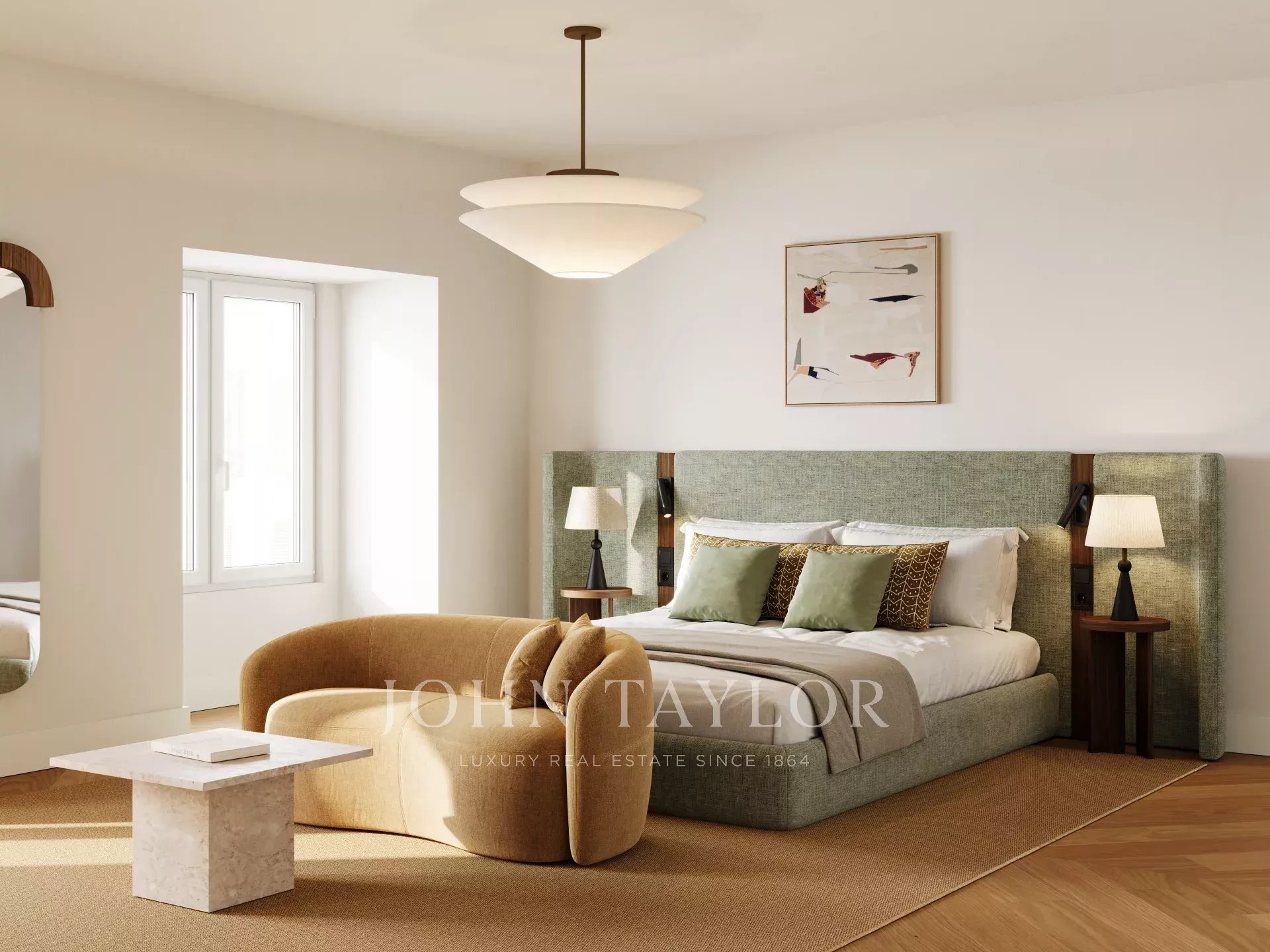 Com cerca de 184 m² de espaço interior e um notável pé-direito de 3,51 metros, este apartamento destaca-se pela sua escala e qualidade. No piso inferior (5.º andar), é recebido por um hall espaçoso que conduz a dois quartos em suite - cada um equipado com roupeiros embutidos, e um dos quais abre para um terraço privado. Uma escada leva-o ao piso superior, onde encontrará uma ampla sala de estar e de jantar com uma cozinha em plano aberto e um segundo terraço com vistas deslumbrantes sobre a cidade e o rio.