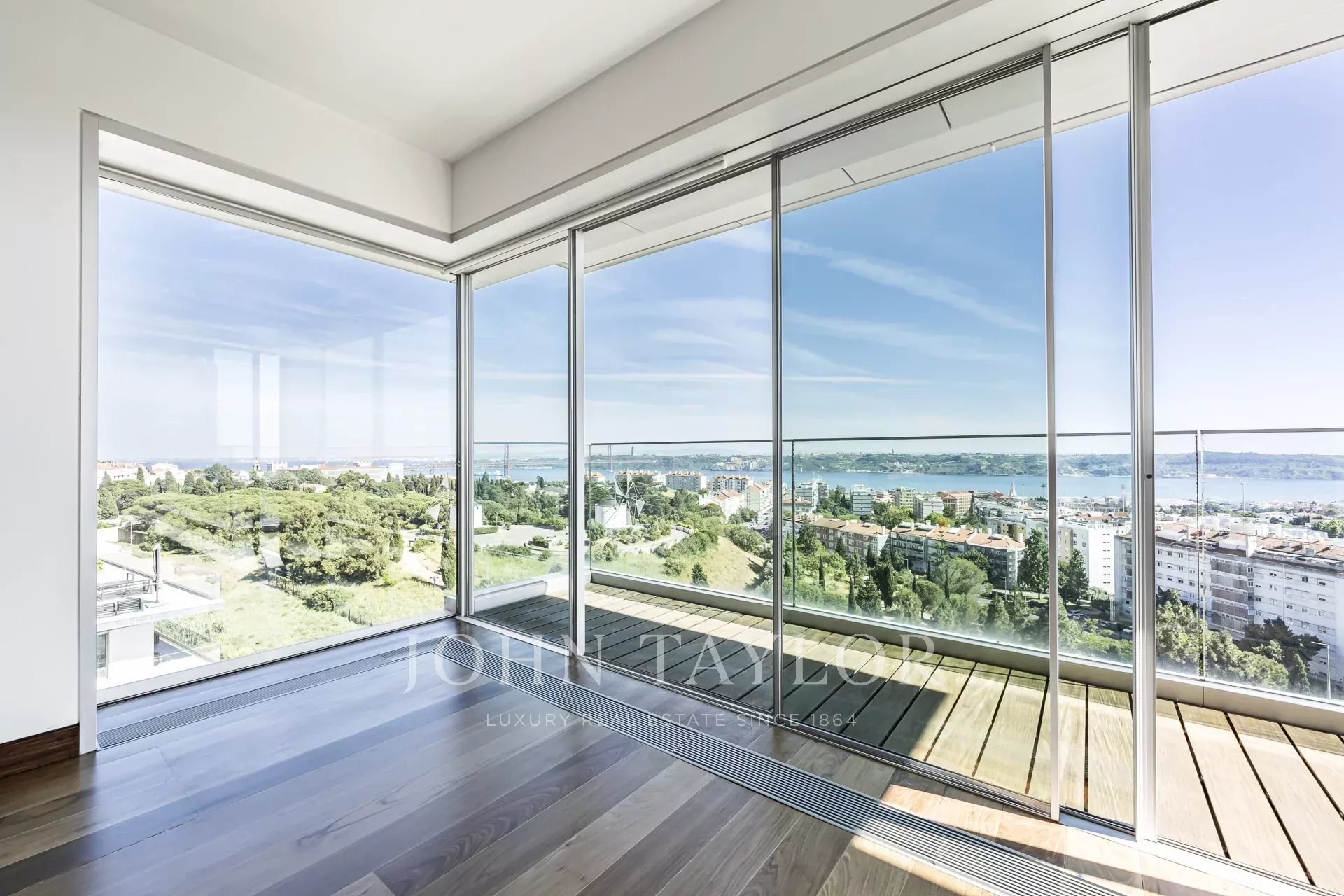 Apartamento T4, com 287 m2 de área bruta privativa e 3 lugares de estacionamento, inserido num condomínio de luxo, com piscina e ginásio, situado na encosta de Belém, com uma fantástica vista sobre a Cidade, sobre o rio Tejo e a serra de Monsanto.