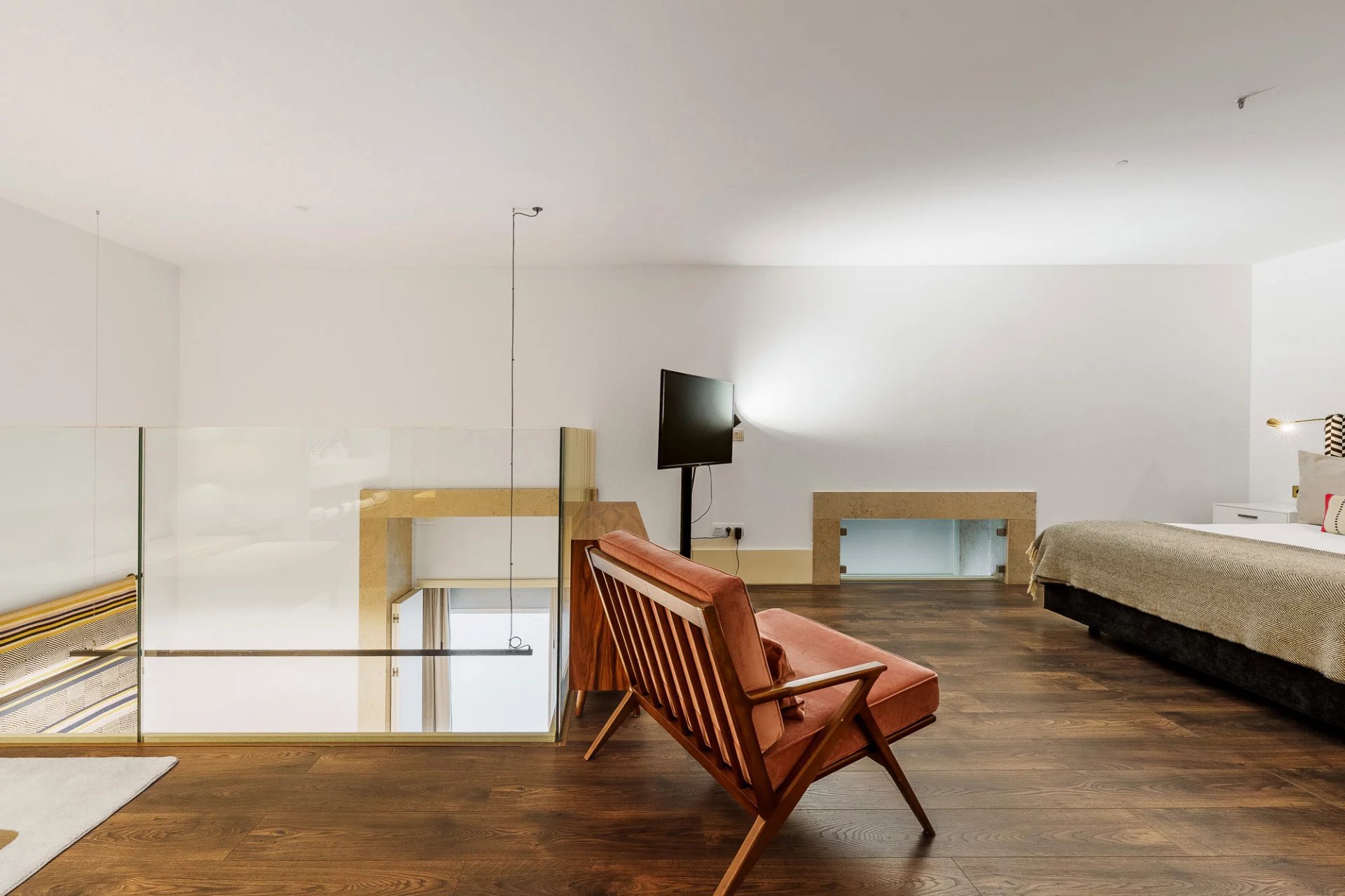 Totalmente mobilado e equipado, o apartamento apresenta um layout em open space com mezzanine, uma suite com cama de casal, cozinha totalmente equipada, duas casas de banho completas, além de arrecadação e estacionamento privado.
