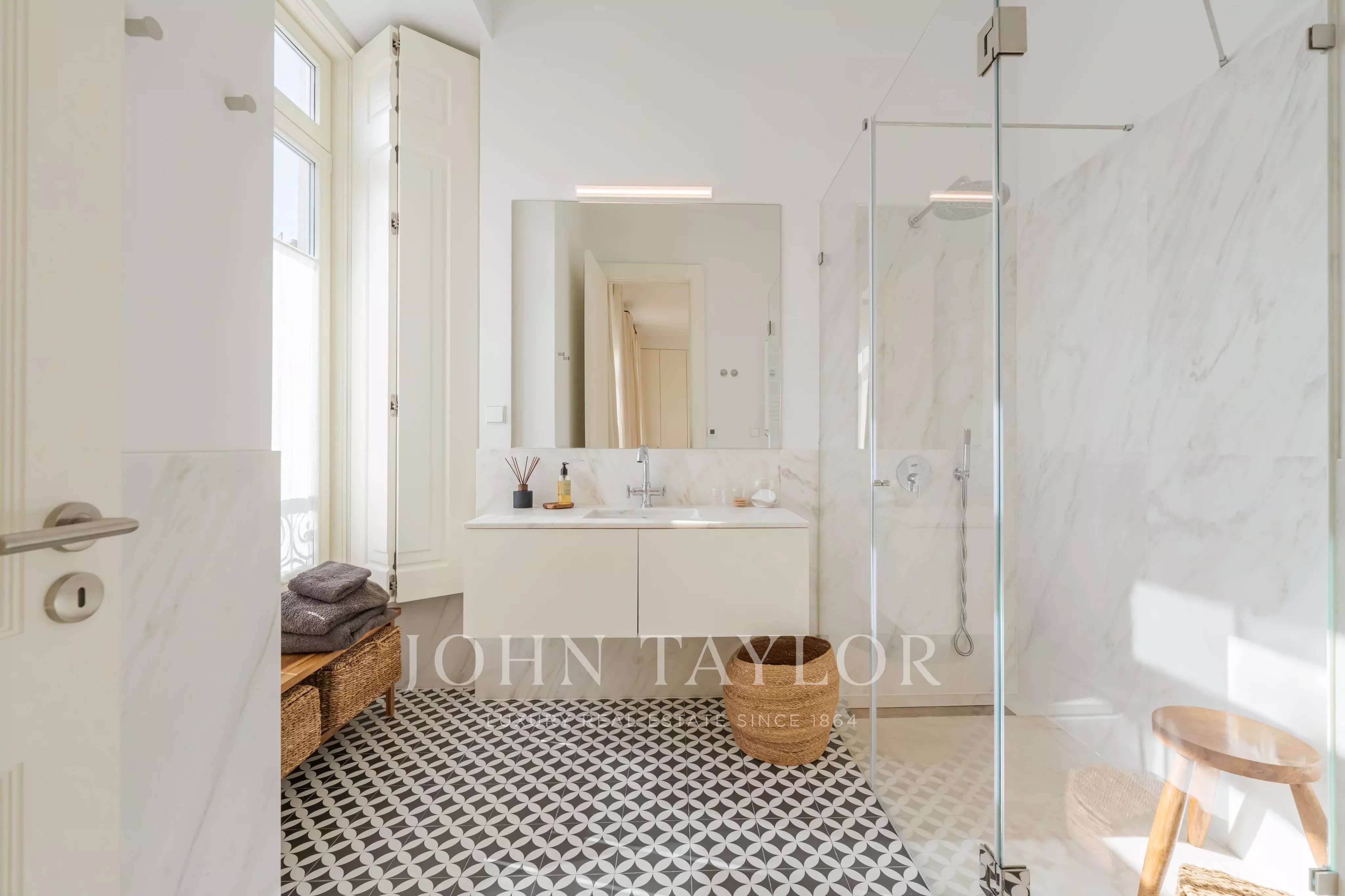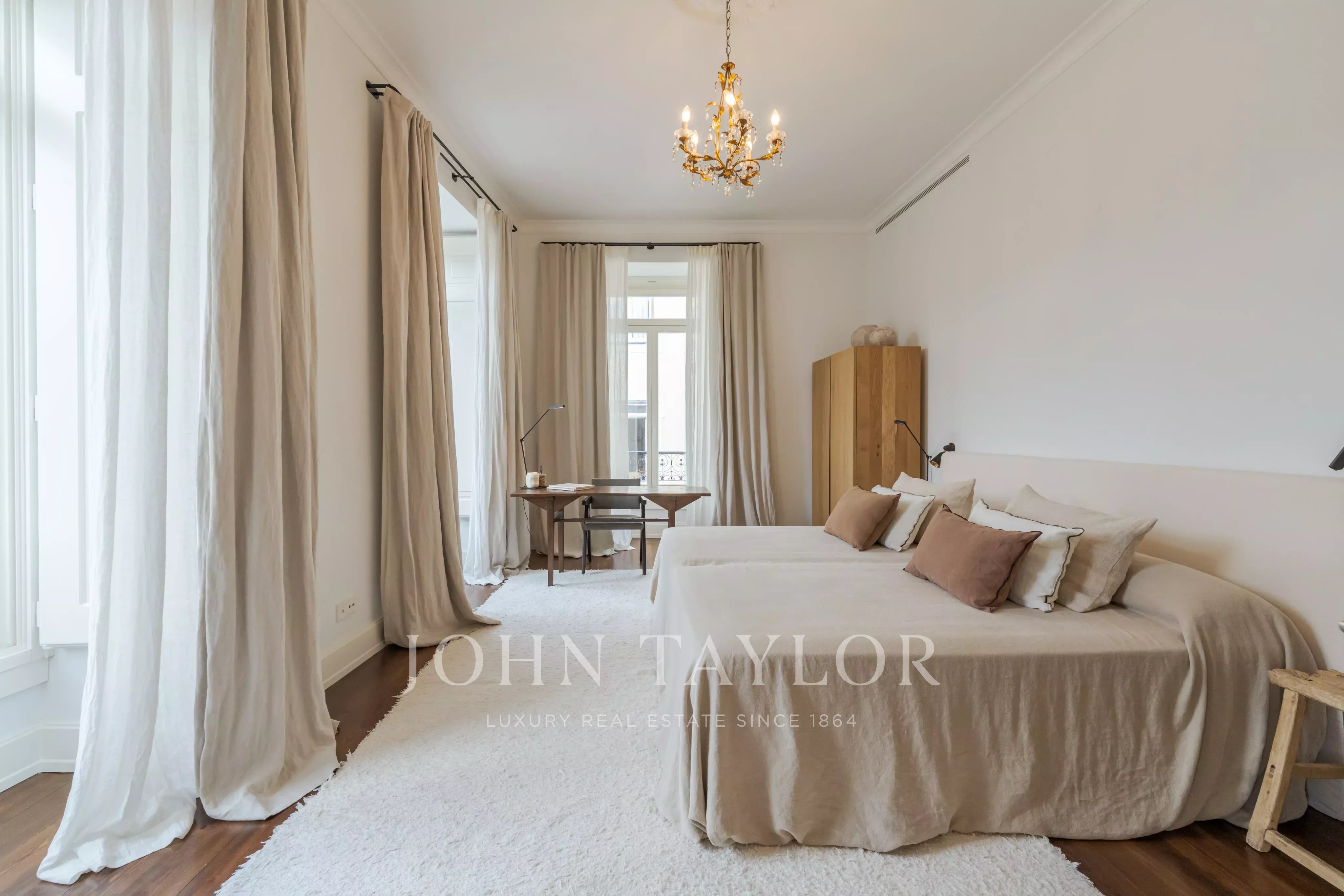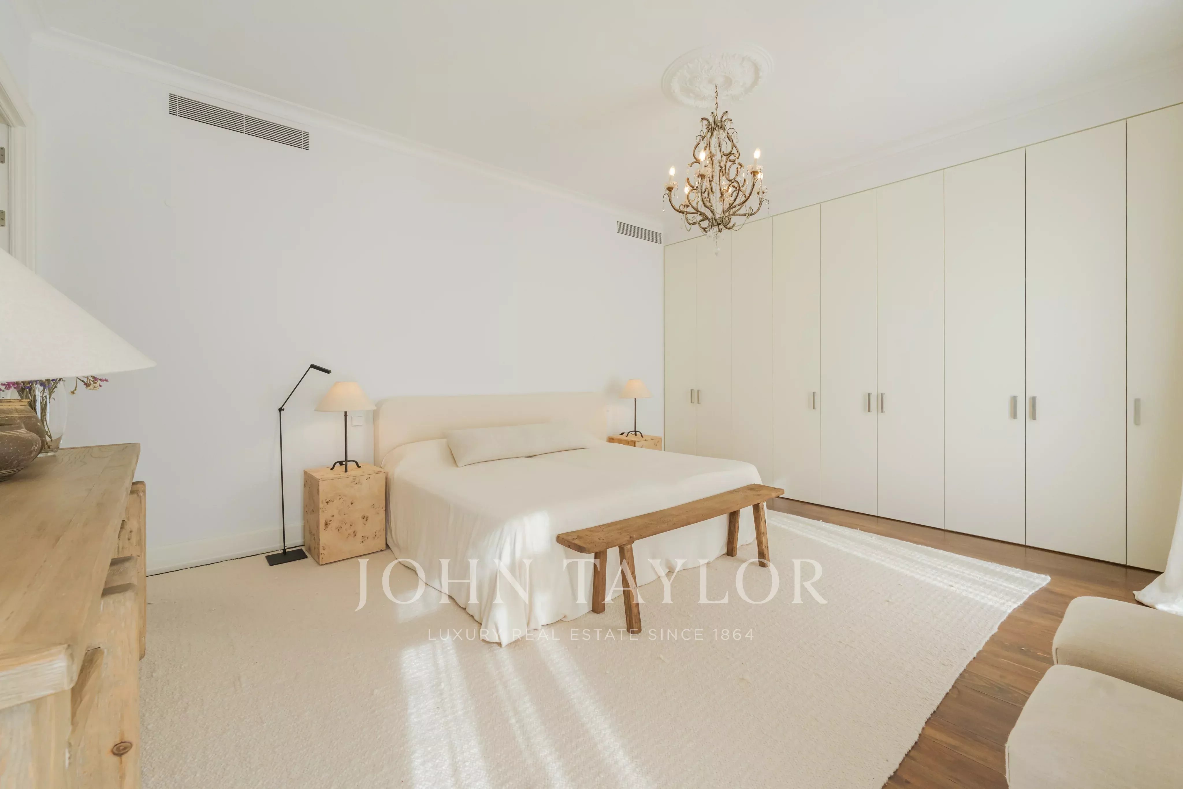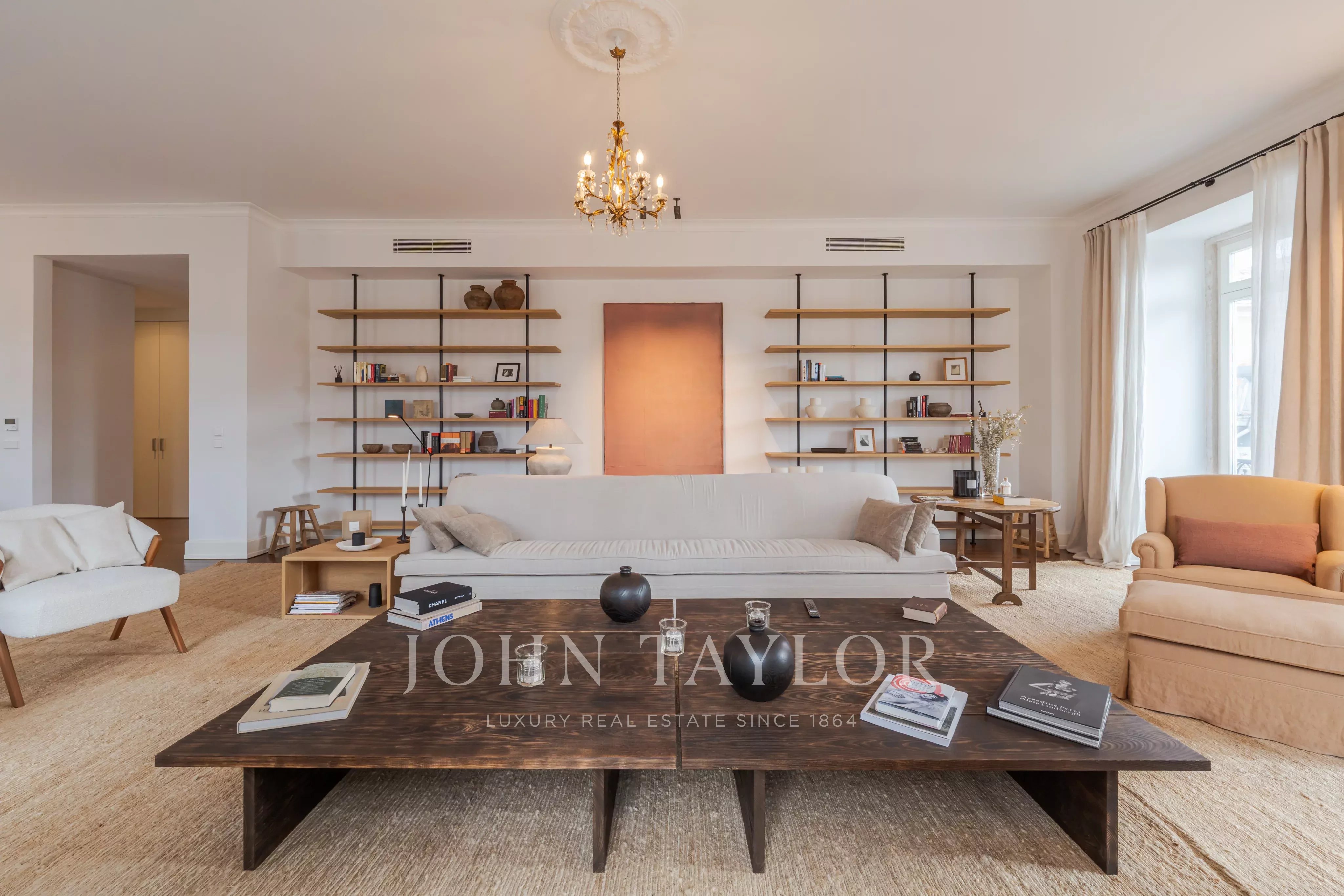 Os interiores revelam-se com clareza e harmonia, definidos por tetos altos, proporções elegantes e acabamentos cuidadosamente selecionados. O apartamento dispõe de quatro quartos, três em suíte, complementados por uma impressionante sala de estar e jantar com cerca de 80 m².
