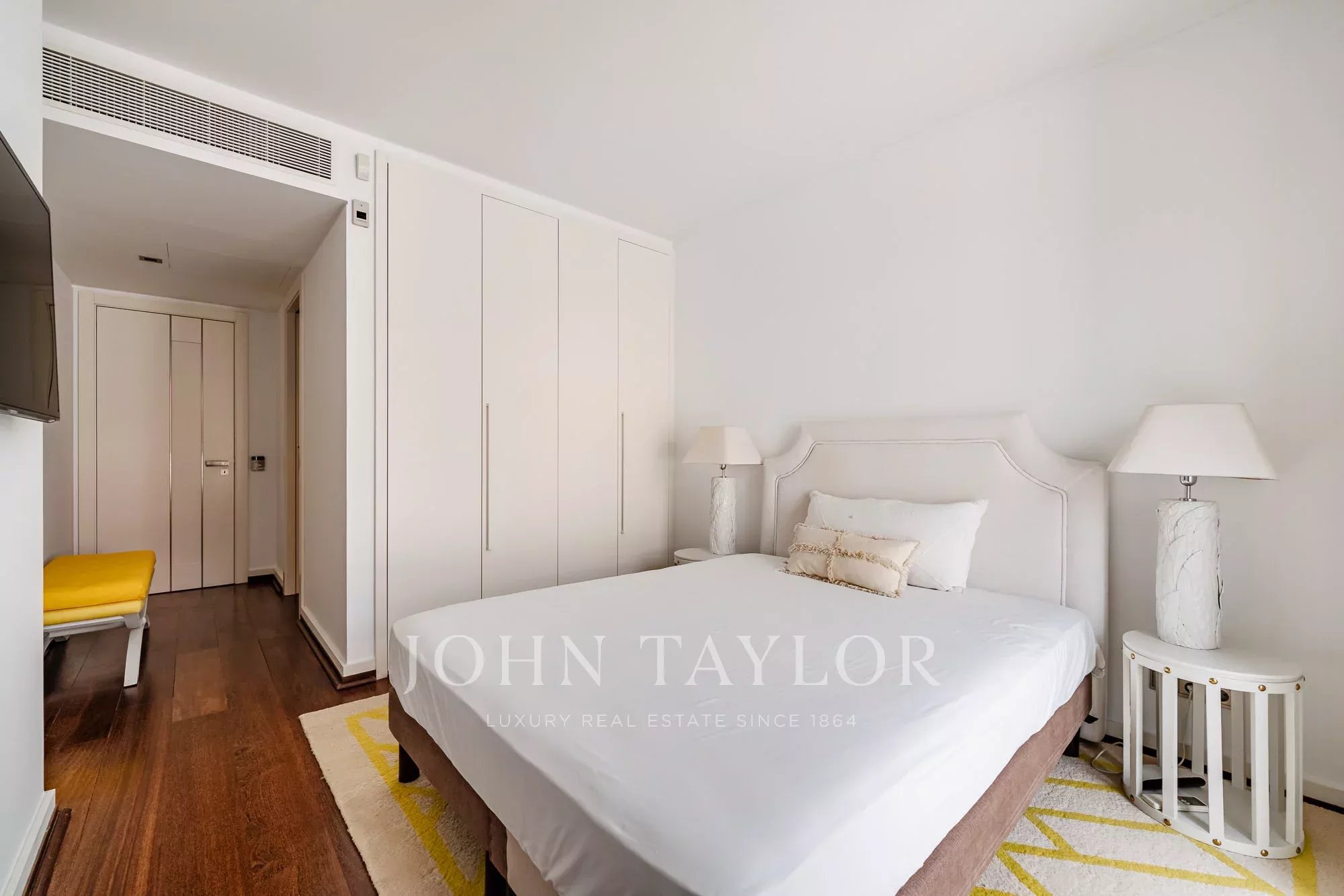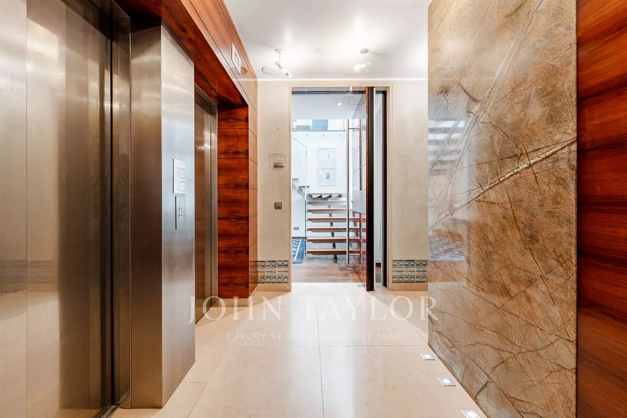 A penthouse está distribuída por dois pisos, com uma clara separação entre as áreas sociais e privadas. O piso de entrada é dedicado às zonas privadas e inclui dois quartos. O quarto principal possui uma área de vestir e uma casa de banho privativa, enquanto o segundo quarto é servido por uma casa de banho separada. Este piso beneficia ainda de uma segunda varanda.