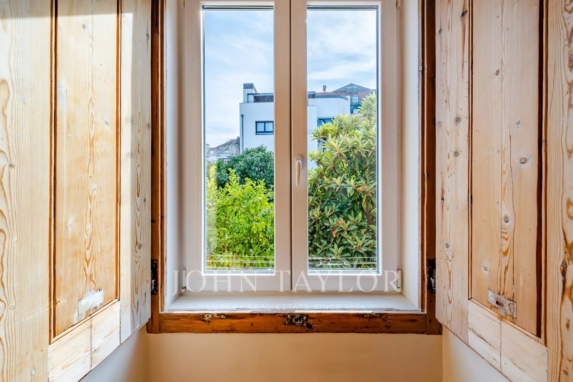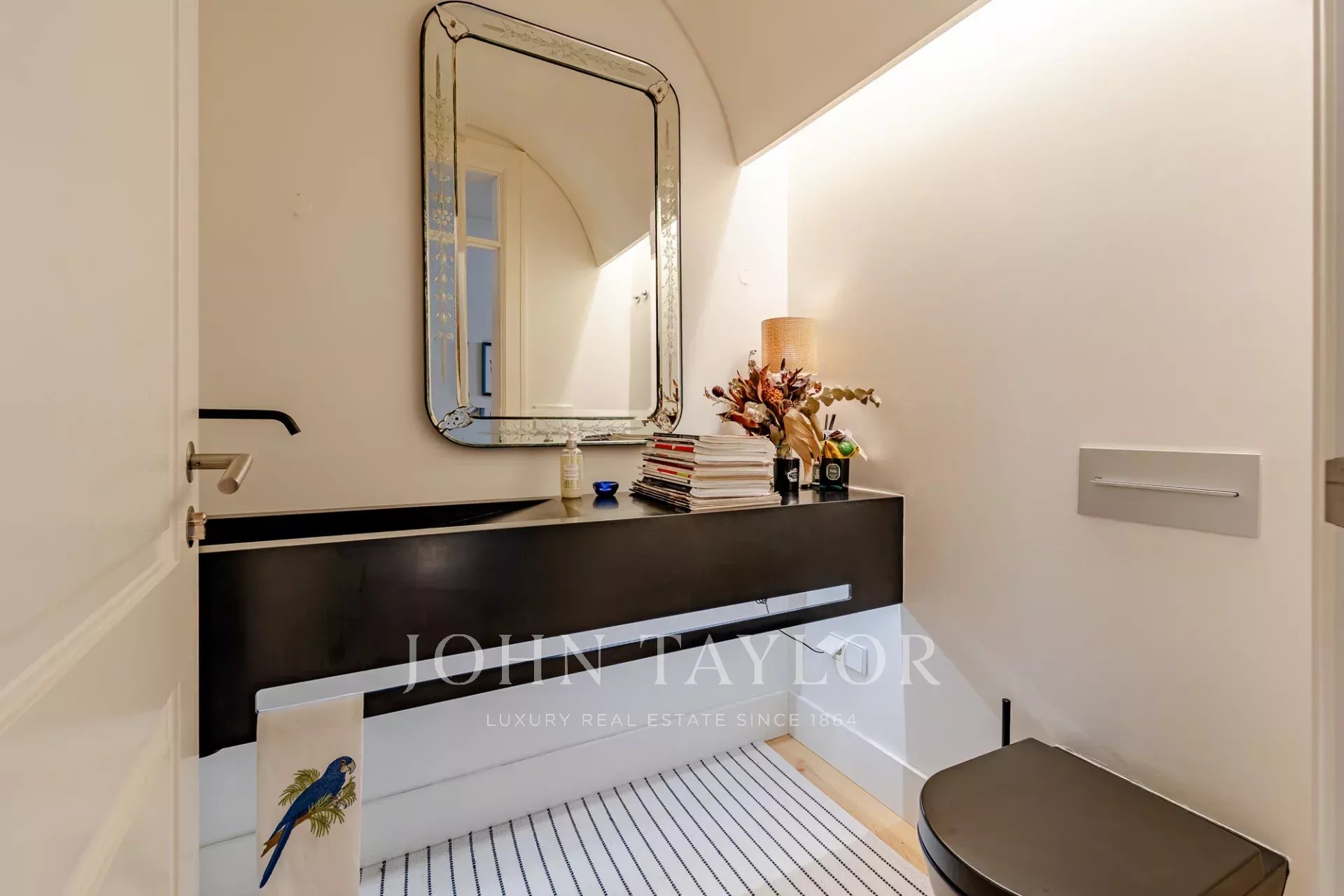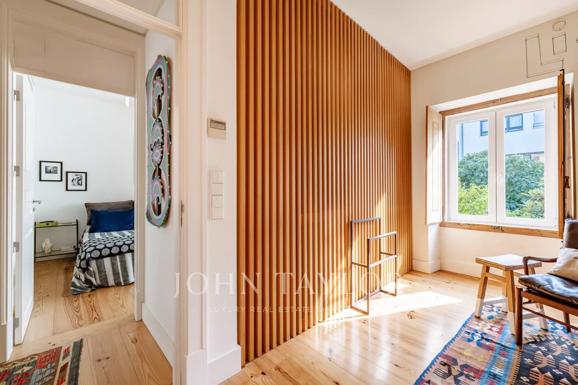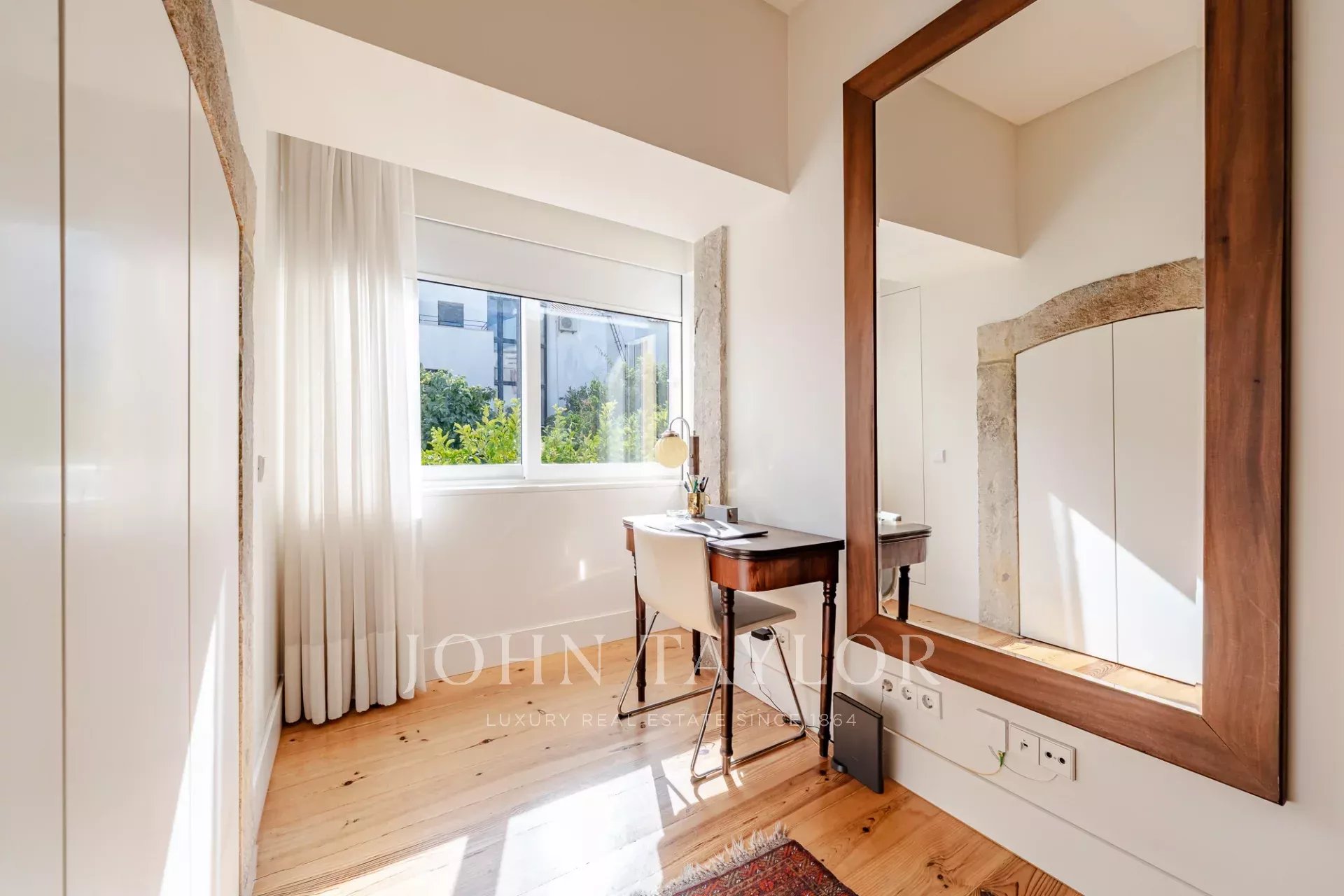 O apartamento tem dois quartos generosos com casas de banho privativas, ambos com vista para um jardim tranquilo, e uma casa de banho para hóspedes para maior comodidade.