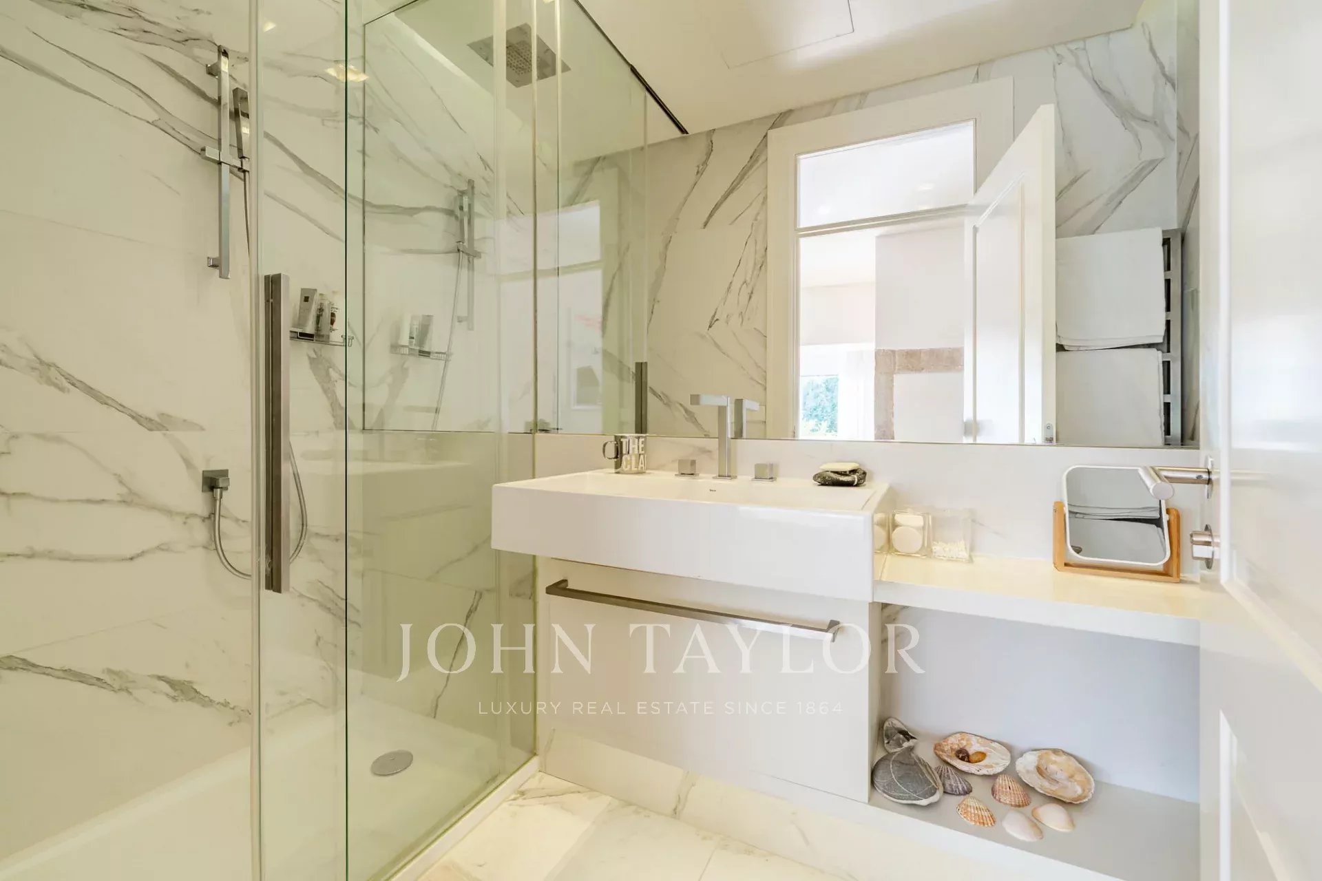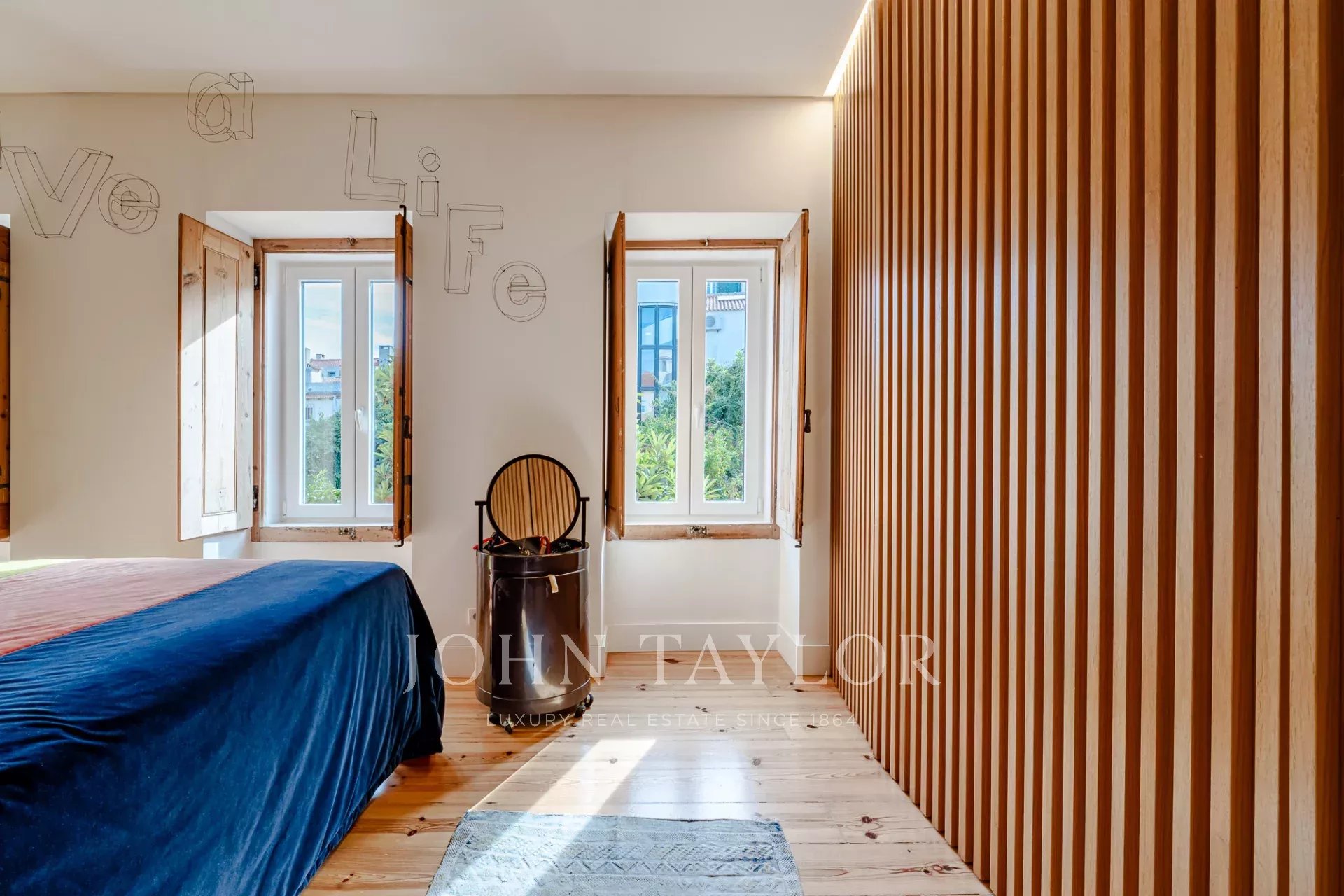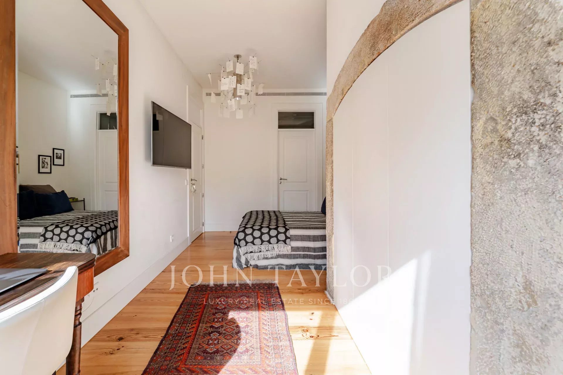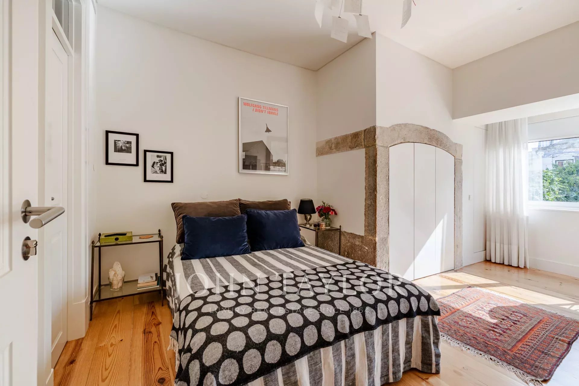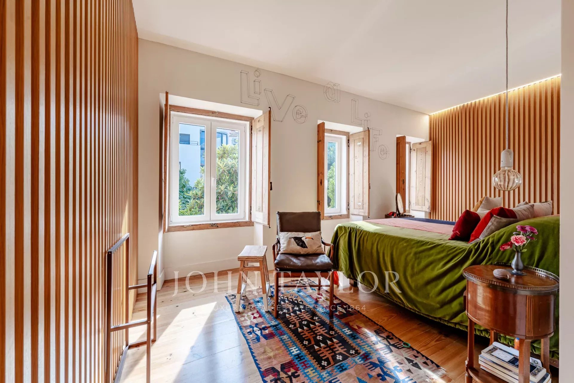 O apartamento tem dois quartos generosos com casas de banho privativas, ambos com vista para um jardim tranquilo, e uma casa de banho para hóspedes para maior comodidade.