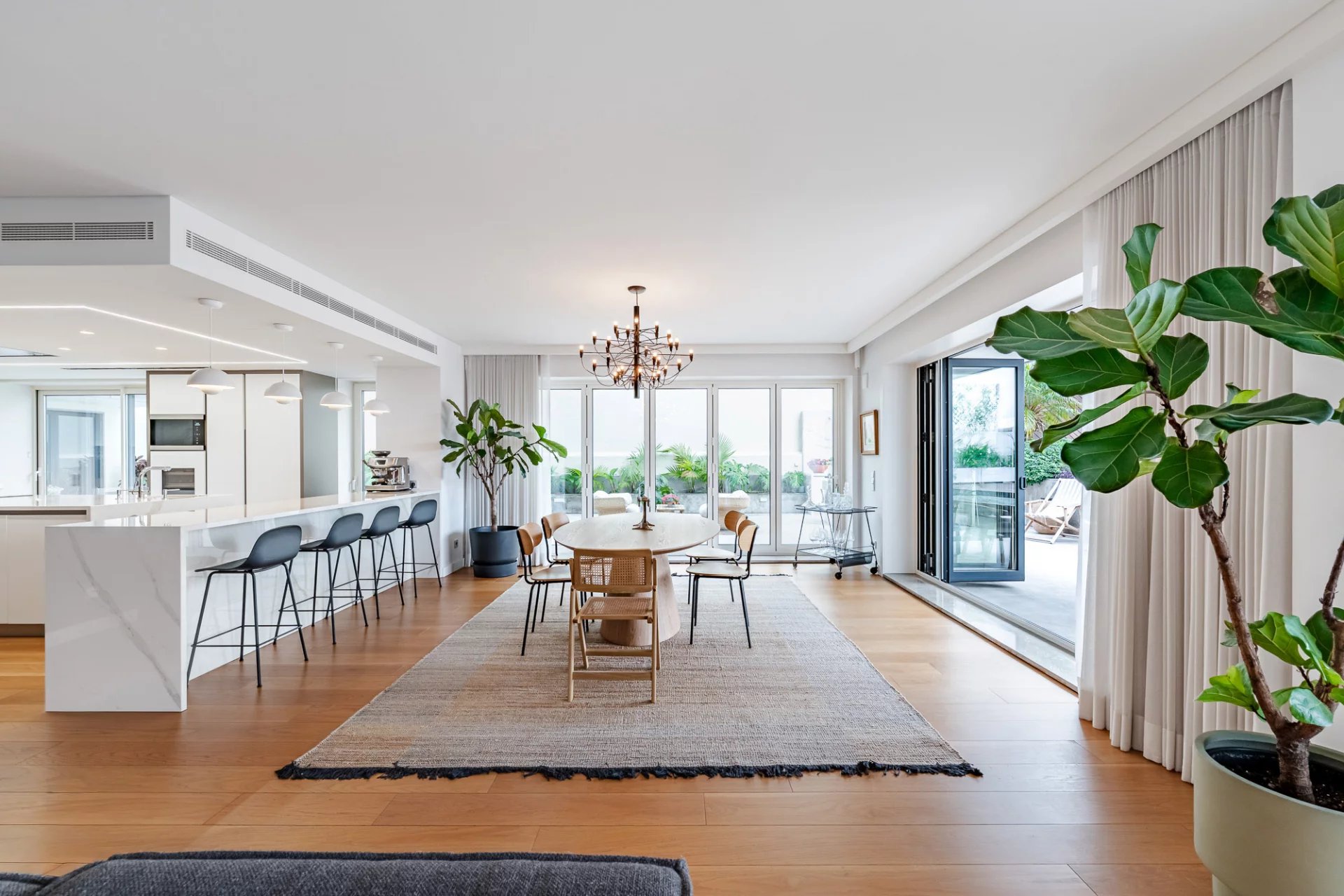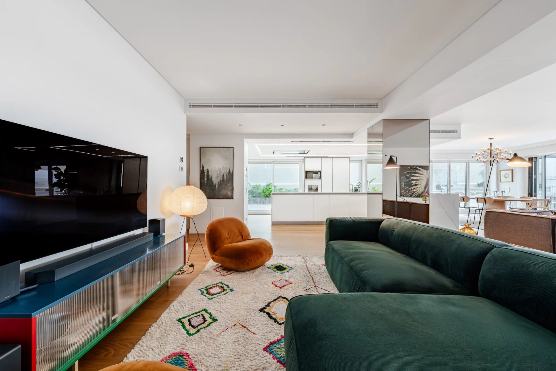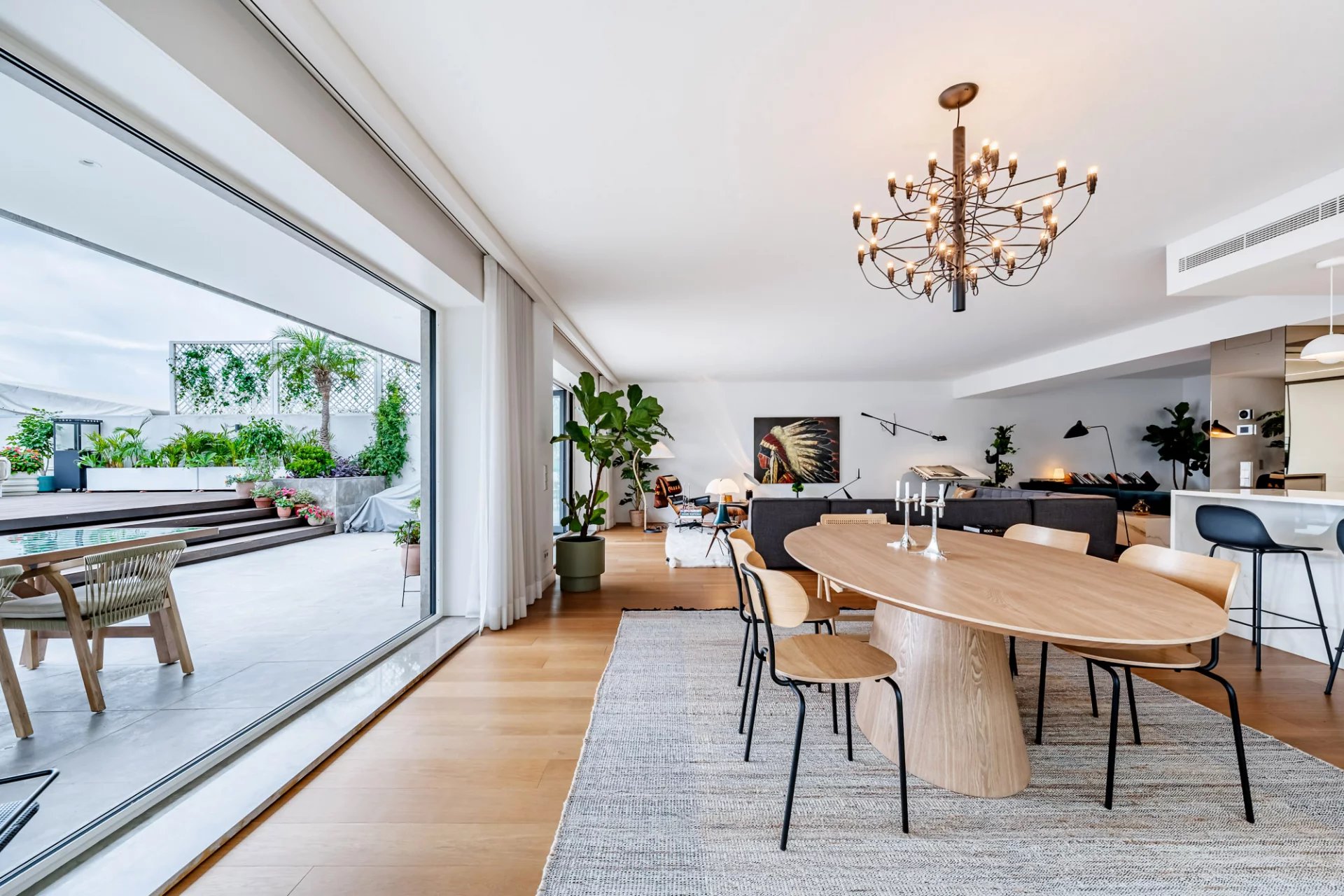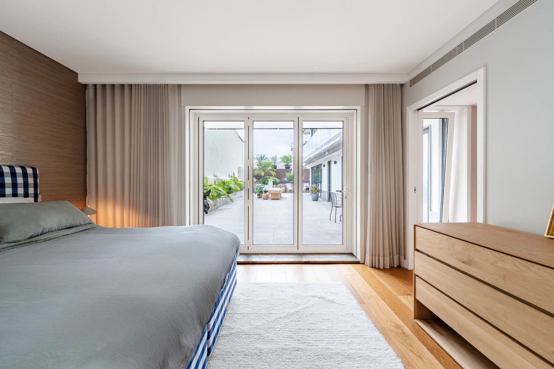O apartamento dispõe de cinco quartos em suite, uma ampla sala de estar e jantar em open space, e uma cozinha totalmente equipada. No terraço, uma segunda cozinha de apoio permite usufruir em pleno das refeições ao ar livre com vista sobre o rio. As amplas janelas envidraçadas, do chão ao teto, inundam os interiores de luz natural e oferecem uma ligação direta ao exterior e à paisagem envolvente.