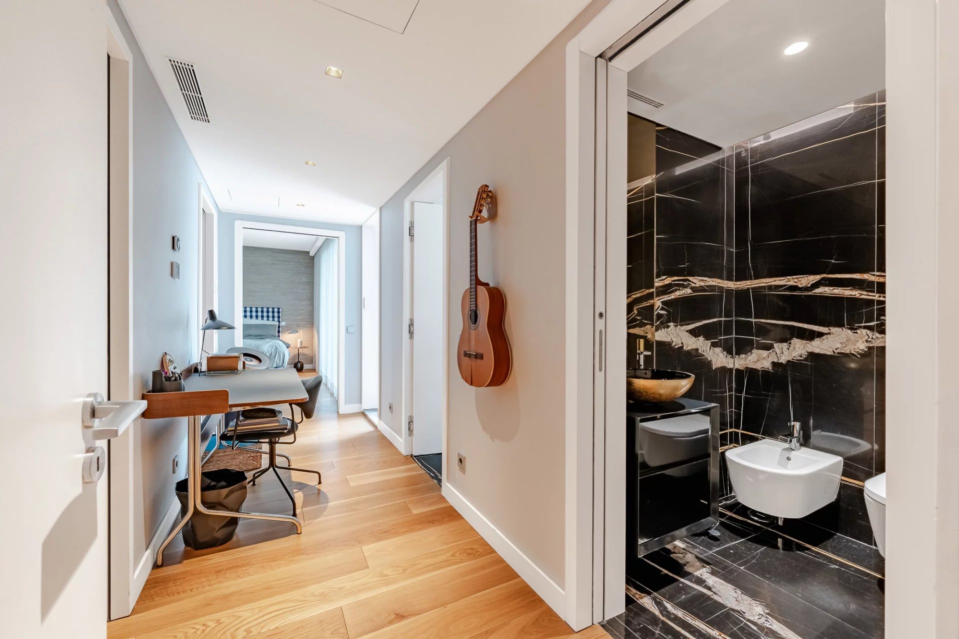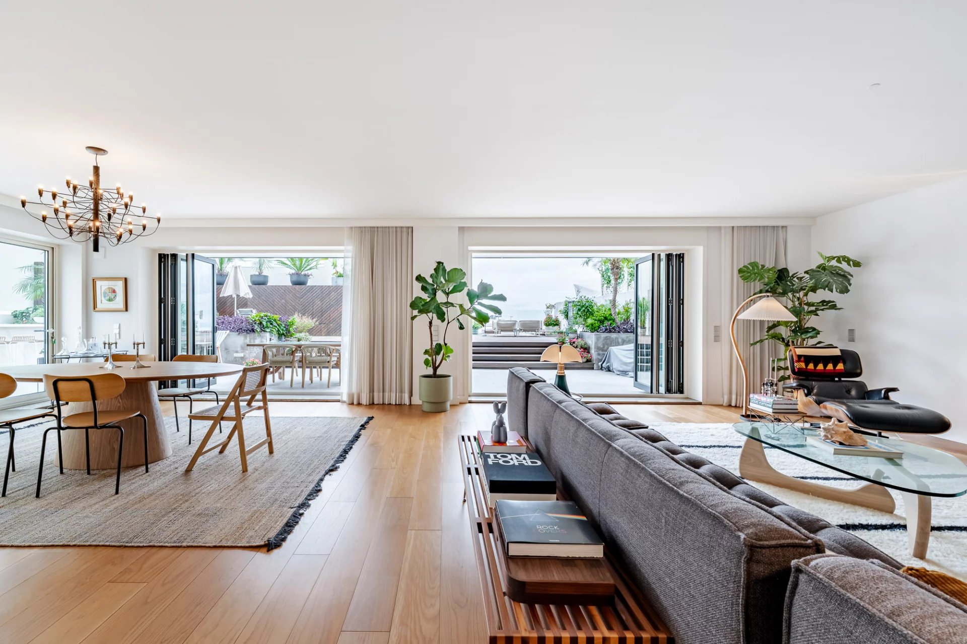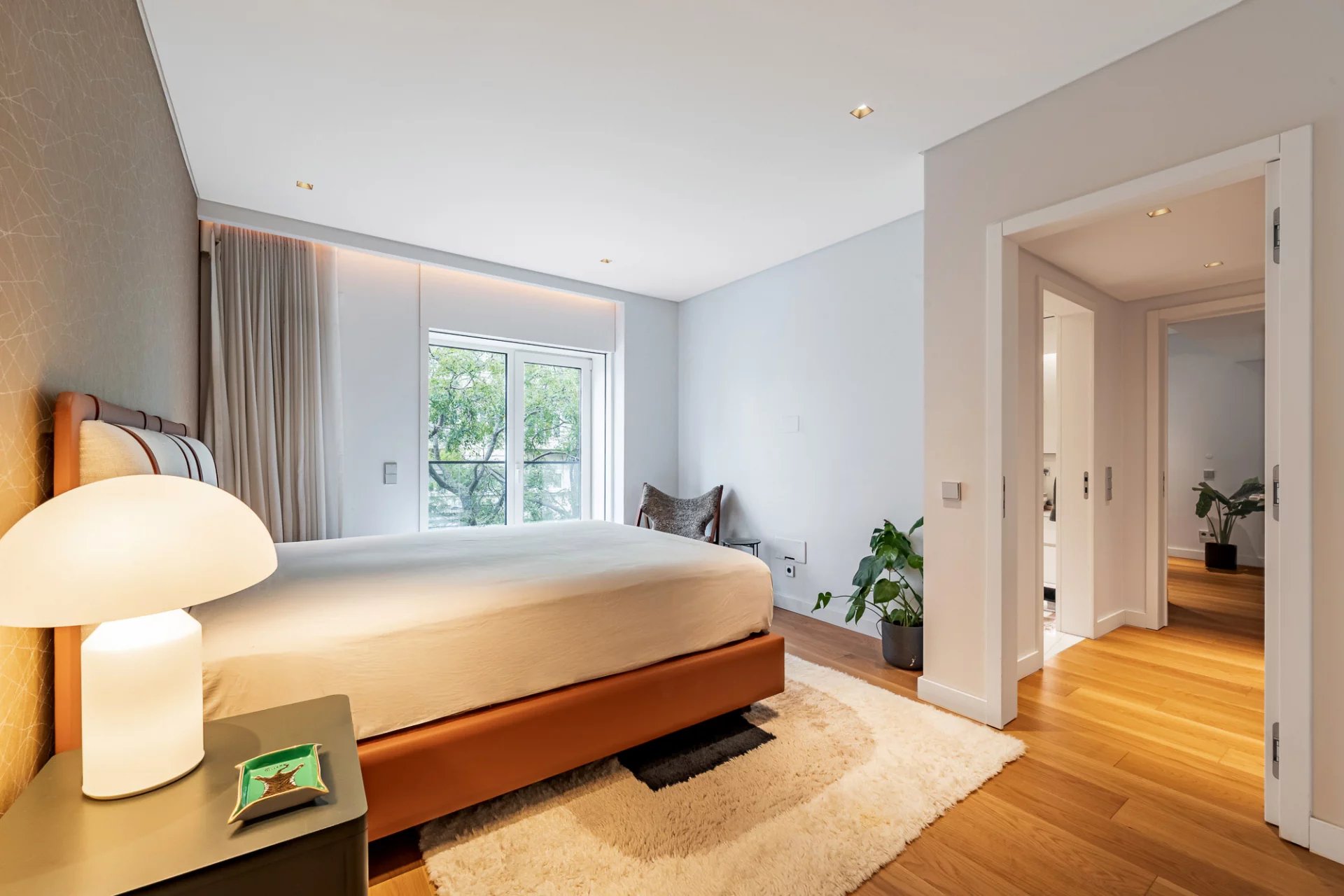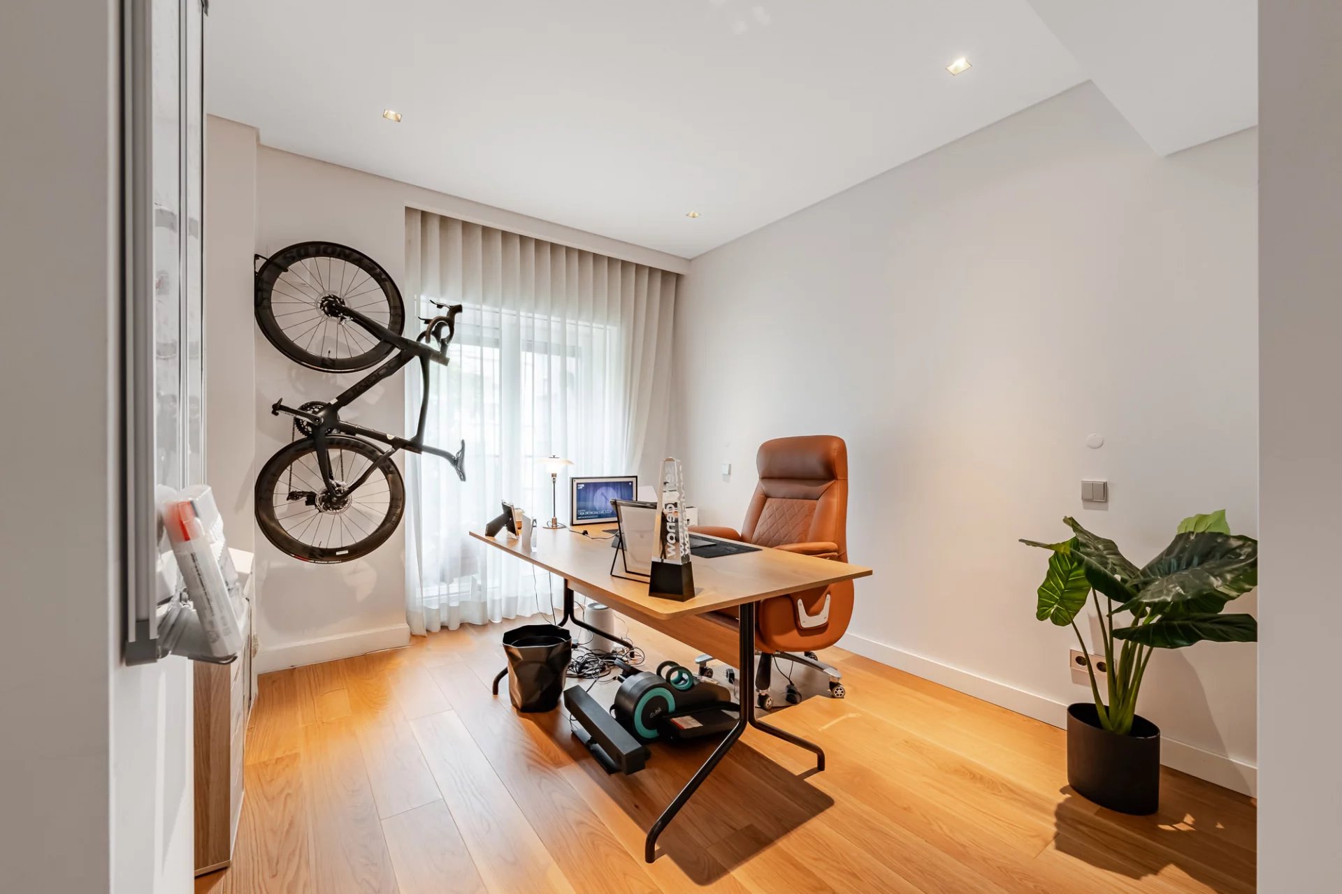 O apartamento dispõe de cinco quartos em suite, uma ampla sala de estar e jantar em open space, e uma cozinha totalmente equipada. No terraço, uma segunda cozinha de apoio permite usufruir em pleno das refeições ao ar livre com vista sobre o rio. As amplas janelas envidraçadas, do chão ao teto, inundam os interiores de luz natural e oferecem uma ligação direta ao exterior e à paisagem envolvente.